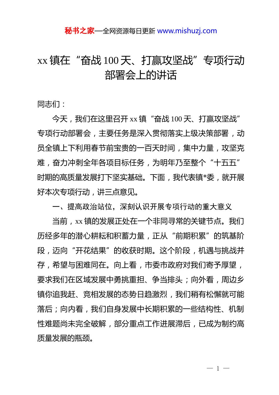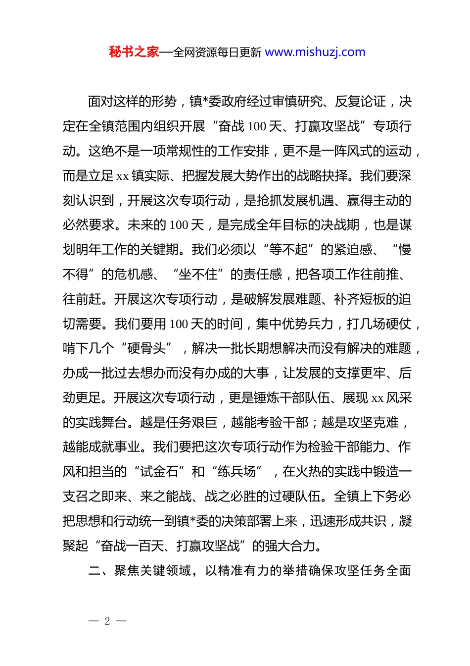 秘书之家—全网资源每日更新 www.mishuzj.comxx 镇在“奋战 100 天、打赢攻坚战”专项行动部署会上的讲话同志们:今天,我们在这里召开 xx 镇“奋战 100 天、打赢攻坚战”专项行动部署会,主要任务是深入贯彻落实上级决策部署,动员全镇上下利用春节前宝贵的一百天时间,集中力量,攻坚克难,奋力冲刺全年各项目标任务,为明年乃至整个“十五五”时期的高质量发展打下坚实基础。下面,我代表镇*委,就开展好本次专项行动,讲三点意见。一、提高政治站位,深刻认识开展专项行动的重大意义当前,xx 镇的发展正处在一个非同寻常的关键节点。我们历经多年的潜心耕耘和积蓄力量,正从“前期积累”的筑基阶段,迈向“开花结果”的收获时期。这个阶段,机遇与挑战并存,希望与困难同在。向上看,市委市政府对我们寄予厚望,要求我们在区域发展中勇挑重担、争当排头;向外看,周边乡镇你追我赶、竞相发展的态势日趋激烈,我们稍有松懈就可能落后;向内看,我们自身发展中长期积累的一些结构性、机制性难题尚未完全破解,部分重点工作进展滞后,已成为制约高质量发展的瓶颈。— 1 —秘书之家—全网资源每日更新 www.mishuzj.com面对这样的形势,镇*委政府经过审慎研究、反复论证,决定在全镇范围内组织开展“奋战 100 天、打赢攻坚战”专项行动。这绝不是一项常规性的工作安排,更不是一阵风式的运动,而是立足 xx 镇实际、把握发展大势作出的战略抉择。我们要深刻认识到,开展这次专项行动,是抢抓发展机遇、赢得主动的必然要求。未来的 100 天,是完成全年目标的决战期,也是谋划明年工作的关键期。我们必须以“等不起”的紧迫感、“慢不得”的危机感、“坐不住”的责任感,把各项工作往前推、往前赶。开展这次专项行动,是破解发展难题、补齐短板的迫切需要。我们要用 100 天的时间,集中优势兵力,打几场硬仗,啃下几个“硬骨头”,解决一批长期想解决而没有解决的难题,办成一批过去想办而没有办成的大事,让发展的支撑更牢、后劲更足。开展这次专项行动,更是锤炼干部队伍、展现 xx 风采的实践舞台。越是任务艰巨,越能考验干部;越是攻坚克难,越能成就事业。我们要把这次专项行动作为检验干部能力、作风和担当的“试金石”和“练兵场”,在火热的实践中锻造一支召之即来、来之能战、战之必胜的过硬队伍。全镇上下务必把思想和行动统一到镇*委的决策部署上来,迅速形成共识,凝聚起“奋战一百天、打赢攻坚战”的强大合力。二、聚焦关键领域,以精准有力的举措确保攻坚任务全面— 2 —秘书之家—全网资源每日更新 www.mishuzj.com突破专项行动千头万绪,必须抓住主要矛盾和矛盾的主要方面。我们要坚持问题导向、目标导向、结果导向相统一,明确主攻方向,细化攻坚任务,确保各项举措落地见效。第一,要聚焦项目为王,在推动经济发展上实现新突破。项目是发展的生命线,没有项目就没有发展,没有好项目就没有高质量发展。我们要把项目建设作为本次专项行动的“主战场”。经济发展攻坚点要全力以赴抓招商、上项目、扩投资。要瞄准重点产业链条,开展精准招商,确保签约落地一批投资规模大、科技含量高、带动能力强的产业项目。对现有在建项目,要倒排工期、挂图作战,及时解决用地、用工、融资等要素保障问题,全力加快项目建设进度,确保形成更多的实物工作量。要力争在 100 天内,全镇固定资产投资增速达到两位数以上,重点项目开工率和投资完成率位居前列,为经济增长提供强劲支撑。第二,要聚焦城乡融合,在提升功能品质上展现新面貌。城乡环境是 xx 的“脸面”,直接关系群众的幸福感和投资者的信心。城乡建设攻坚点要围绕“补短板、提品质、惠民生”,深入推进城乡一体化发展。要加快推进镇区基础设施改造提升工程,完善道路、管网、停车场等配套设施,提升综合承载能— 3 —秘书之家—全网资源每日更新 www.mishuzj.com力。要持续开展农村人居环境整治,重点抓好垃圾清理、污水治理和村容村貌提升,建设一批美丽宜居村庄。要精心雕琢城镇风貌,挖掘历史文化底蕴,打造具有鲜明特色的城镇节点和公共空间,让 xx 既有“里子”更有“面子”。第三...