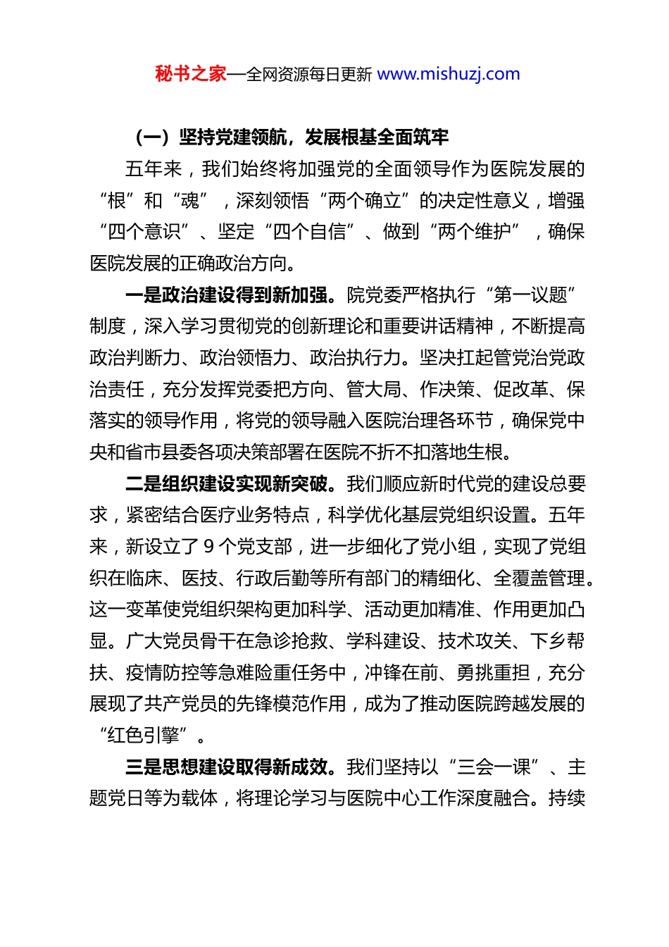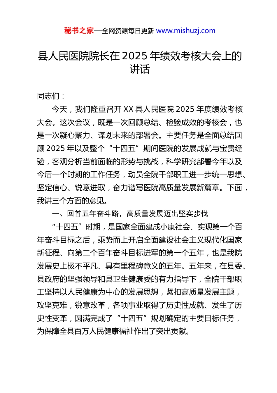 秘书之家—全网资源每日更新 www.mishuzj.com县人民医院院长在 2025 年绩效考核大会上的讲话同志们:今天,我们隆重召开 XX 县人民医院 2025 年度绩效考核大会。这次会议,既是一次回顾总结、检验成效的考核会,也是一次凝心聚力、谋划未来的部署会。主要任务是全面总结回顾 2025 年以及整个“十四五”期间医院的发展成就与宝贵经验,客观分析当前面临的形势与挑战,科学研究部署今年以及今后一个时期的工作任务,动员全院干部职工进一步统一思想、坚定信心、锐意进取,奋力谱写医院高质量发展新篇章。下面,我讲三个方面的意见。一、回首五年奋斗路,高质量发展迈出坚实步伐“十四五”时期,是国家全面建成小康社会、实现第一个百年奋斗目标之后,乘势而上开启全面建设社会主义现代化国家新征程、向第二个百年奋斗目标进军的第一个五年,也是我院发展史上极不平凡、具有里程碑意义的五年。五年来,在县委、县政府的坚强领导和县卫生健康委的有力指导下,全院干部职工坚持以人民健康为中心的发展思想,紧扣高质量发展主题,攻坚克难,锐意改革,各项事业取得了历史性成就、发生了历史性变革,圆满完成了“十四五”规划确定的主要目标任务,为保障全县百万人民健康福祉作出了突出贡献。秘书之家—全网资源每日更新 www.mishuzj.com(一)坚持党建领航,发展根基全面筑牢五年来,我们始终将加强党的全面领导作为医院发展的“根”和“魂”,深刻领悟“两个确立”的决定性意义,增强“四个意识”、坚定“四个自信”、做到“两个维护”,确保医院发展的正确政治方向。一是政治建设得到新加强。院党委严格执行“第一议题”制度,深入学习贯彻党的创新理论和重要讲话精神,不断提高政治判断力、政治领悟力、政治执行力。坚决扛起管党治党政治责任,充分发挥党委把方向、管大局、作决策、促改革、保落实的领导作用,将党的领导融入医院治理各环节,确保党中央和省市县委各项决策部署在医院不折不扣落地生根。二是组织建设实现新突破。我们顺应新时代党的建设总要求,紧密结合医疗业务特点,科学优化基层党组织设置。五年来,新设立了 9 个党支部,进一步细化了党小组,实现了党组织在临床、医技、行政后勤等所有部门的精细化、全覆盖管理。这一变革使党组织架构更加科学、活动更加精准、作用更加凸显。广大党员骨干在急诊抢救、学科建设、技术攻关、下乡帮扶、疫情防控等急难险重任务中,冲锋在前、勇挑重担,充分展现了共产党员的先锋模范作用,成为了推动医院跨越发展的“红色引擎”。三是思想建设取得新成效。我们坚持以“三会一课”、主题党日等为载体,将理论学习与医院中心工作深度融合。持续秘书之家—全网资源每日更新 www.mishuzj.com开展“双报到”、敬老爱老、新时代文明实践及各医疗主题日等活动,组织医护人员深入社区、乡村,开展健康义诊、科普宣传、慢病管理,将学习成果转化为服务群众健康的生动实践,架起了党同人民群众的“连心桥”。四是党风廉政建设与行风建设呈现新气象。我们始终把行风建设视为医院发展的“生命线”,驰而不息落实中央八项规定及其实施细则精神,坚决反对“四风”。完善并严格执行“三重一大”决策制度,强化对权力运行的制约和监督。将医德医风建设、医疗质量安全、检查检验结果互认等民生实事与党风廉政建设同部署、同推进、同考核。通过常态化开展专项检查、联合督查、警示教育,筑牢了拒腐防变的思想道德防线,营造了风清气正的执业环境。医院先后荣获商丘市行风建设先进集体、群众满意医院等多项荣誉。五是安全稳定构筑新屏障。我们牢固树立安全发展理念,坚决扛起安全生产政治责任。认真贯彻落实省委、省政府关于安全稳定工作的系列决策部署,健全安全生产责任体系,持续开展风险隐患排查整治,加强应急演练和值班值守,确保了医疗安全、消防安全、生物安全、信息安全等各方面工作万无一失,为人民群众和医务人员营造了安全、稳定、和谐的就医和工作环境。特别是在新冠疫情期间,全院干部职工闻令而动、逆行出征,以生命赴使命,用大爱护众生,牢牢守住了全县疫情防控的主阵地,被省委、省政府授予“抗击新冠肺炎疫情先秘书之家...