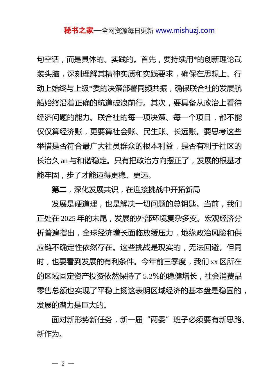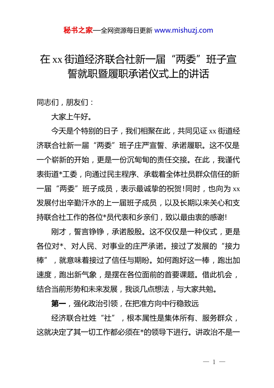 秘书之家—全网资源每日更新 www.mishuzj.com在 xx 街道经济联合社新一届“两委”班子宣誓就职暨履职承诺仪式上的讲话同志们,朋友们:大家上午好。今天是个特别的日子,我们相聚在此,共同见证 xx 街道经济联合社新一届“两委”班子庄严宣誓、承诺履职。这不仅是一个崭新的开始,更是一份沉甸甸的责任交接。在此,我谨代表街道*工委,向通过民主程序、承载着全体社员群众信任的新一届“两委”班子成员,表示最诚挚的祝贺!同时,也向为 xx发展付出辛勤汗水的上一届班子成员,以及长期以来关心和支持联合社工作的各位*员代表和乡亲们,致以最由衷的感谢!刚才,誓言铮铮,承诺殷殷。这不仅仅是一种仪式,更是各位对*、对人民、对事业的庄严承诺。接过了发展的“接力棒”,就意味着接过了信任与期盼。如何跑好这一棒,跑出加速度,跑出新气象,是摆在各位面前的首要课题。借此机会,结合当前形势和未来发展,我谈几点想法,与大家共勉。第一,强化政治引领,在把准方向中行稳致远经济联合社姓“社”,根本属性是集体所有、服务群众,这就决定了其一切工作都必须在*的领导下进行。讲政治不是一— 1 —秘书之家—全网资源每日更新 www.mishuzj.com句空话,而是具体的、实践的。首先,要持续用*的创新理论武装头脑,深刻理解其精神实质和实践要求,确保在思想上、行动上始终与上级*委的决策部署同频共振,确保联合社的发展航船始终沿着正确的航道破浪前行。其次,要具备从政治上看待经济问题的能力。联合社的每一项决策、每一个项目,都不能仅仅算经济账,更要算社会账、民生账、长远账。要思考这些举措是否符合最广大社员群众的根本利益,是否有利于社区的长治久 an 与和谐稳定。只有把政治方向摆正了,发展的根基才能牢固,步子才能迈得更稳、更远。第二,深化发展共识,在迎接挑战中开拓新局发展是硬道理,也是解决一切问题的总钥匙。当前,我们正处在 2025 年的末尾,发展的外部环境复杂多变。宏观经济分析普遍指出,全球经济增长面临放缓压力,地缘政治风险和供应链不确定性依然存在。这些挑战是现实的,无法回避。但同时,也要看到发展的有利条件。今年前三季度,我们 xx 区所在的区域固定资产投资依然保持了 5.2%的稳健增长,社会消费品零售总额也实现了平稳上扬这表明区域经济的基本盘是稳固的,发展的潜力是巨大的。面对新形势新任务,新一届“两委”班子必须要有新思路、新作为。— 2 —秘书之家—全网资源每日更新 www.mishuzj.com一要争当产业升级的“精耕者”。不能再满足于过去那种“瓦片经济”、当“包租公”的单一模式。要主动研究市场需求,积极探索符合 xx 实际的现代服务业、数字社区、智慧康养等新业态。数字转型是许多地区政策的重点,联合社也应当思考如何利用数字化工具提升管理效率和服务水平,让集体经济的形态更加多元、结构更加优化、效益更加持久。二要甘为集体资产的“守护人”。集体资产是全体社员的“家底”,一分一厘都来之不易。管理好、运营好这份家产,是“两委”班子的核心职责。一些对公共资产管理的研究显示,有效的资产治理极其复杂,需要专业的知识、透明的流程和强有力的监督机制来确保其保值增值。因此,必须建立健全一套科学、规范、透明的资产管理制度,从资产登记、租赁承包到投资决策,都要有章可循、有据可查。同时,要主动填补当前集体经济指标体系的空白,建立清晰的、可量化的绩效评估标准,让联合社的家底有多厚、增长有多少,成为一本全体社员都能看懂的明白账。三要勇做发展模式的“探索者”。要积极借鉴和吸收当前关于“新型农村集体经济”发展的有益探索,虽然我们身处城市,但其背后关于明晰产权、盘活资源、创新合作模式的理念是相通的。可以探索通过股权合作、项目众筹等方式,吸引社— 3 —秘书之家—全网资源每日更新 www.mishuzj.com会资本和专业人才参与集体项目开发,让社员不仅仅是分红的受益者,更能成为发展的参与者和贡献者,真正形成利益共享、风险共担的发展共同体。第三,坚守为民情怀,在贴心服务中凝聚人心联合社发展的最终目的,是为了让全体社员群众的日子越过越红火。经济数字的增...