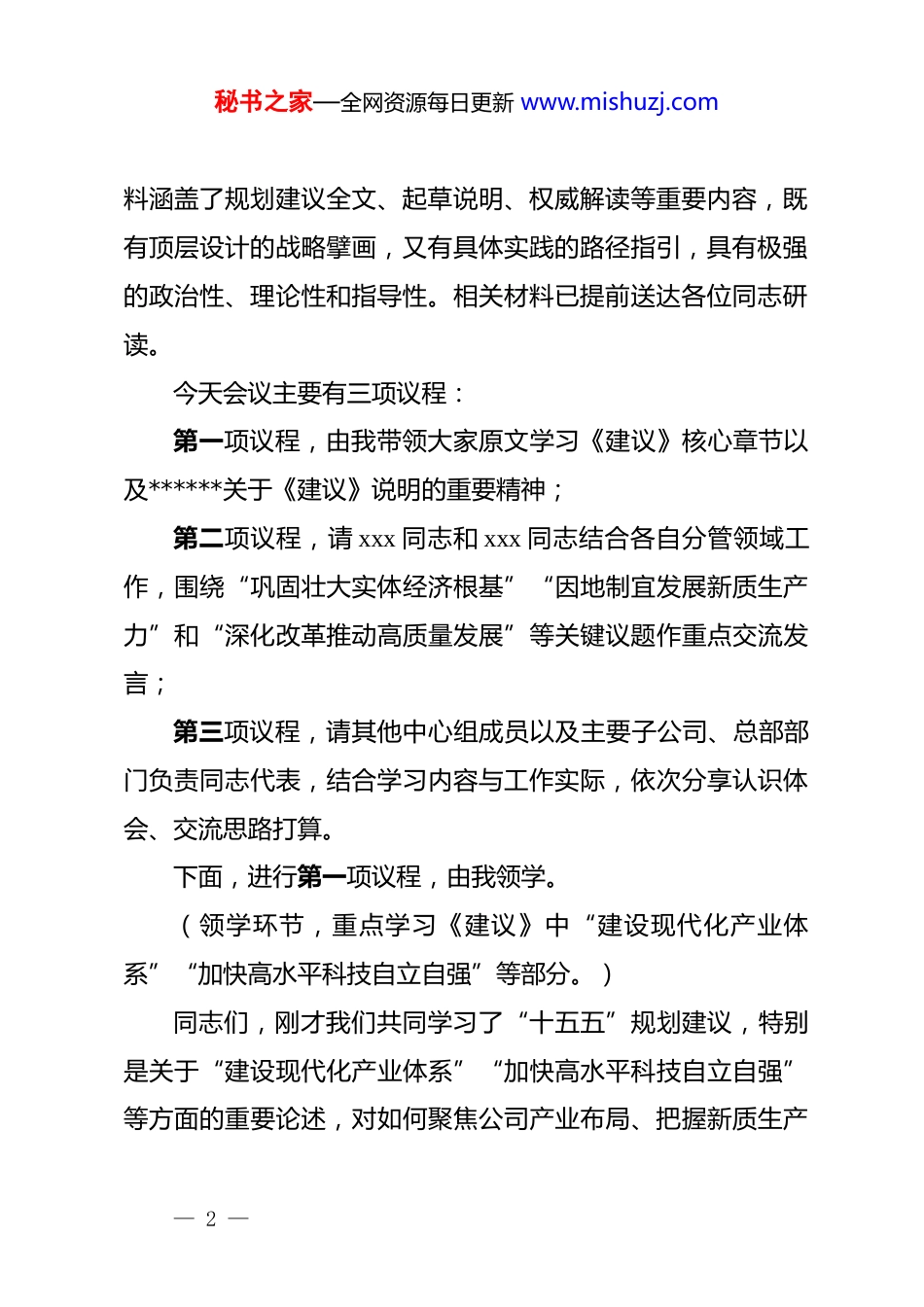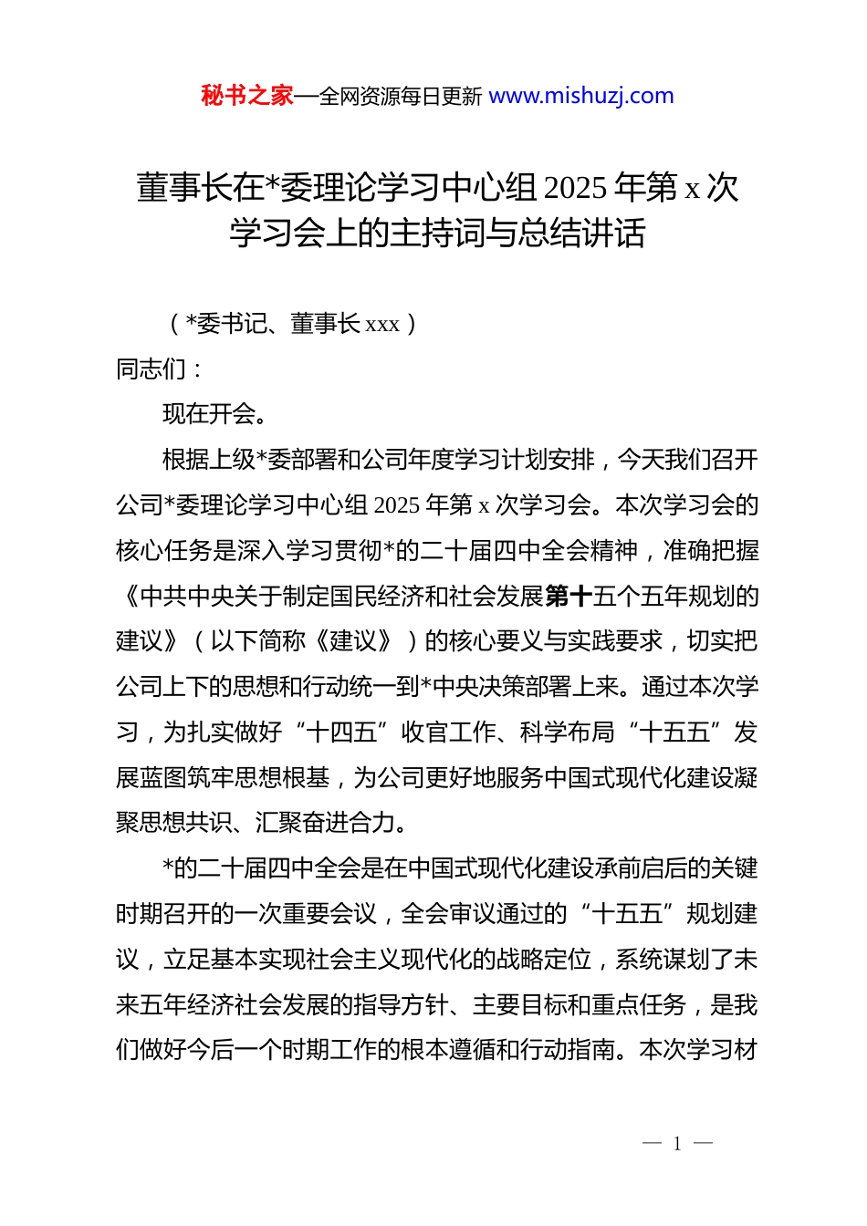 秘书之家—全网资源每日更新 www.mishuzj.com董事长在*委理论学习中心组 2025 年第 x 次学习会上的主持词与总结讲话(*委书记、董事长 xxx)同志们:现在开会。根据上级*委部署和公司年度学习计划安排,今天我们召开公司*委理论学习中心组 2025 年第 x 次学习会。本次学习会的核心任务是深入学习贯彻*的二十届四中全会精神,准确把握《中共中央关于制定国民经济和社会发展第十五个五年规划的建议》(以下简称《建议》)的核心要义与实践要求,切实把公司上下的思想和行动统一到*中央决策部署上来。通过本次学习,为扎实做好“十四五”收官工作、科学布局“十五五”发展蓝图筑牢思想根基,为公司更好地服务中国式现代化建设凝聚思想共识、汇聚奋进合力。*的二十届四中全会是在中国式现代化建设承前启后的关键时期召开的一次重要会议,全会审议通过的“十五五”规划建议,立足基本实现社会主义现代化的战略定位,系统谋划了未来五年经济社会发展的指导方针、主要目标和重点任务,是我们做好今后一个时期工作的根本遵循和行动指南。本次学习材— 1 —秘书之家—全网资源每日更新 www.mishuzj.com料涵盖了规划建议全文、起草说明、权威解读等重要内容,既有顶层设计的战略擘画,又有具体实践的路径指引,具有极强的政治性、理论性和指导性。相关材料已提前送达各位同志研读。今天会议主要有三项议程:第一项议程,由我带领大家原文学习《建议》核心章节以及******关于《建议》说明的重要精神;第二项议程,请 xxx 同志和 xxx 同志结合各自分管领域工作,围绕“巩固壮大实体经济根基”“因地制宜发展新质生产力”和“深化改革推动高质量发展”等关键议题作重点交流发言;第三项议程,请其他中心组成员以及主要子公司、总部部门负责同志代表,结合学习内容与工作实际,依次分享认识体会、交流思路打算。下面,进行第一项议程,由我领学。(领学环节,重点学习《建议》中“建设现代化产业体系”“加快高水平科技自立自强”等部分。)同志们,刚才我们共同学习了“十五五”规划建议,特别是关于“建设现代化产业体系”“加快高水平科技自立自强”等方面的重要论述,对如何聚焦公司产业布局、把握新质生产— 2 —秘书之家—全网资源每日更新 www.mishuzj.com力的主攻方向,全力推动公司深化改革和创新发展,有了更为系统和清晰的认识。下面,进行第二项议程,请 xxx 同志和 xxx 同志作重点发言。请大家欢迎!(.........)好,感谢两位同志所作的精彩发言。他们的发言紧扣会议主题,紧密联系实际,既有理论层面的深入思考,也有实践层面的具体探索,提出了许多富有建设性的思路和切实可行的举措,达到了相互启发、深化认识、凝聚共识的学习目的。现在,进行第三项议程,开展交流研讨。请其他同志踊跃发言,建议每人发言时间控制在 5 分钟左右。希望大家结合自身学习体会和工作实际,重点谈谈如何将全会精神与分管领域、主责主业深度融合,如何有效破解当前发展面临的瓶颈制约,以及如何科学谋划“十五五”时期的重点工作思路与举措。欢迎各位领导、同志们积极分享。(.........)同志们,刚才,我们围绕会议内容进行了深入学习,与会同志结合分管工作和深入思考,开展了热烈而充分的研讨交流。大家的发言认识深刻、思路清晰、举措务实,充分体现了对全会精神的精准把握和推动公司发展的责任担当,让我深受启发,— 3 —秘书之家—全网资源每日更新 www.mishuzj.com也倍感振奋。下面,结合学习收获和公司实际,我讲几点意见:一、深化思想认识,把握核心要义,切实把思想和行动统一到全会精神上来*的二十届四中全会审议通过的“十五五”规划建议,是立足于基本实现社会主义现代化关键时期的纲领性文件,既承接“十四五”发展成果,又系统擘画未来五年发展蓝图。明年适逢全国国有企业*的建设工作会议召开十周年,在此重要时点深入学习贯彻全会精神,为我们落实******重要讲话精神,为纵深推进改革发展指明了方向、提供了根本遵循。第一,要深刻认识“十五五”规划的战略定位,把握发展大势。“十五五”时期是基本实现社会主义现代化承前启后的关键阶段,机遇与挑...