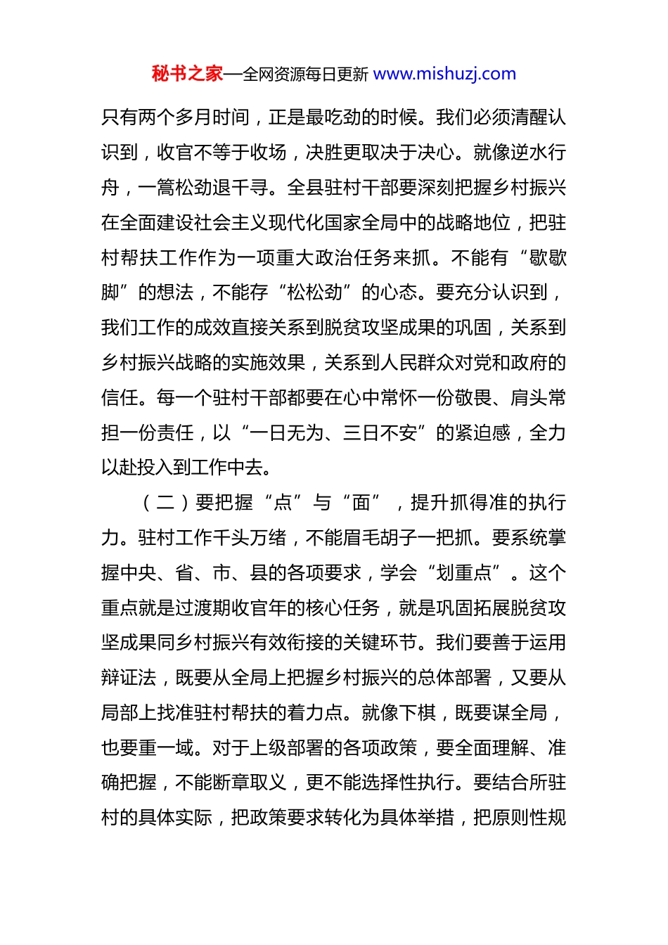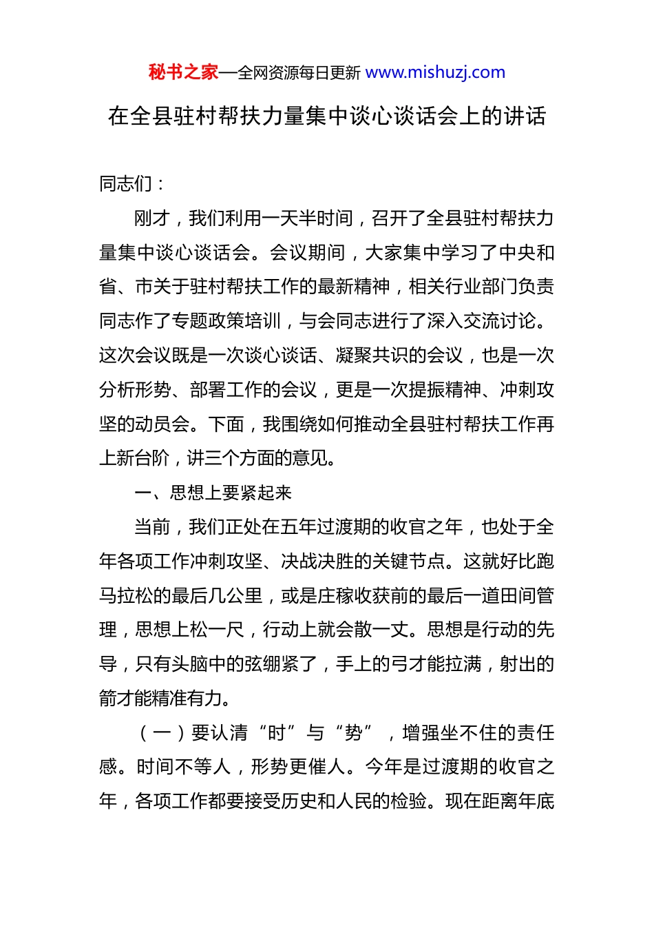 秘书之家—全网资源每日更新 www.mishuzj.com在全县驻村帮扶力量集中谈心谈话会上的讲话 同志们:刚才,我们利用一天半时间,召开了全县驻村帮扶力量集中谈心谈话会。会议期间,大家集中学习了中央和省、市关于驻村帮扶工作的最新精神,相关行业部门负责同志作了专题政策培训,与会同志进行了深入交流讨论。这次会议既是一次谈心谈话、凝聚共识的会议,也是一次分析形势、部署工作的会议,更是一次提振精神、冲刺攻坚的动员会。下面,我围绕如何推动全县驻村帮扶工作再上新台阶,讲三个方面的意见。一、思想上要紧起来当前,我们正处在五年过渡期的收官之年,也处于全年各项工作冲刺攻坚、决战决胜的关键节点。这就好比跑马拉松的最后几公里,或是庄稼收获前的最后一道田间管理,思想上松一尺,行动上就会散一丈。思想是行动的先导,只有头脑中的弦绷紧了,手上的弓才能拉满,射出的箭才能精准有力。(一)要认清“时”与“势”,增强坐不住的责任感。时间不等人,形势更催人。今年是过渡期的收官之年,各项工作都要接受历史和人民的检验。现在距离年底秘书之家—全网资源每日更新 www.mishuzj.com只有两个多月时间,正是最吃劲的时候。我们必须清醒认识到,收官不等于收场,决胜更取决于决心。就像逆水行舟,一篙松劲退千寻。全县驻村干部要深刻把握乡村振兴在全面建设社会主义现代化国家全局中的战略地位,把驻村帮扶工作作为一项重大政治任务来抓。不能有“歇歇脚”的想法,不能存“松松劲”的心态。要充分认识到,我们工作的成效直接关系到脱贫攻坚成果的巩固,关系到乡村振兴战略的实施效果,关系到人民群众对党和政府的信任。每一个驻村干部都要在心中常怀一份敬畏、肩头常担一份责任,以“一日无为、三日不安”的紧迫感,全力以赴投入到工作中去。(二)要把握“点”与“面”,提升抓得准的执行力。驻村工作千头万绪,不能眉毛胡子一把抓。要系统掌握中央、省、市、县的各项要求,学会“划重点”。这个重点就是过渡期收官年的核心任务,就是巩固拓展脱贫攻坚成果同乡村振兴有效衔接的关键环节。我们要善于运用辩证法,既要从全局上把握乡村振兴的总体部署,又要从局部上找准驻村帮扶的着力点。就像下棋,既要谋全局,也要重一域。对于上级部署的各项政策,要全面理解、准确把握,不能断章取义,更不能选择性执行。要结合所驻村的具体实际,把政策要求转化为具体举措,把原则性规秘书之家—全网资源每日更新 www.mishuzj.com定转化为可操作的办法。特别是对过渡期收官的各项指标要求,要逐条梳理、逐项落实,确保不留死角、不存盲区。(三)要统筹“内”与“外”,激发想作为的内生力。驻村帮扶不是“包办代替”,而是“授人以渔”。外部的帮扶是条件,内在的动力是根本。思想上紧起来,不仅要靠外部压力,更要靠内在觉醒。我们要充分认识到驻村工作的价值所在、意义所系。这份工作不仅是一项任务,更是一次历练;不仅是一种付出,更是一种收获。当我们看到帮扶村的产业发展起来,看到村民的笑容多起来,这种成就感是任何物质回报都无法比拟的。全县驻村干部要振奋精神、鼓舞斗志,把驻村帮扶作为实现个人价值与社会价值相结合的重要平台。要克服“过客”思想,树立“主人”意识,真正把身心沉下去,与村民想在一起、干在一起。只有这样,我们的工作才能获得源源不断的动力,才能在实践中创造出让人民满意、经得起检验的业绩。二、工作上要动起来驻村帮扶不是请客吃饭,不能只停留在口号上、记录在台账里。工作要做实,步子要踩稳,腿脚要勤快。这就好比农民种地,不光要看天时、懂农事,更要下到地里,秘书之家—全网资源每日更新 www.mishuzj.com一锄一锄地耕耘,一株一株地管护。工作上的“动起来”,体现在四个具体方面。(一)要聚焦“强组织”,筑牢堡垒根基。村看村,户看户,群众看支部。村级党组织是乡村振兴的主心骨。驻村干部要积极协助抓好村“两委”班子建设,特别是要加强村级党组织带头人队伍建设。要坚持“帮办不包办、到位不越位”的原则,当好村党组织书记的参谋助手。帮助建好村组班子,健全村级组织,完善“三会一课”、党务公开等各项规章制度,助...
