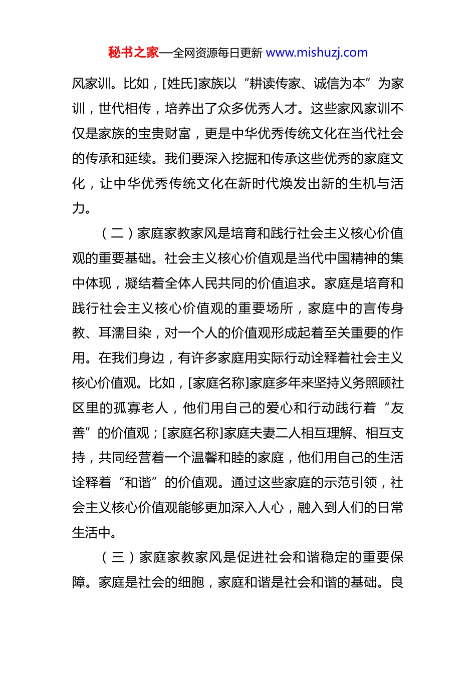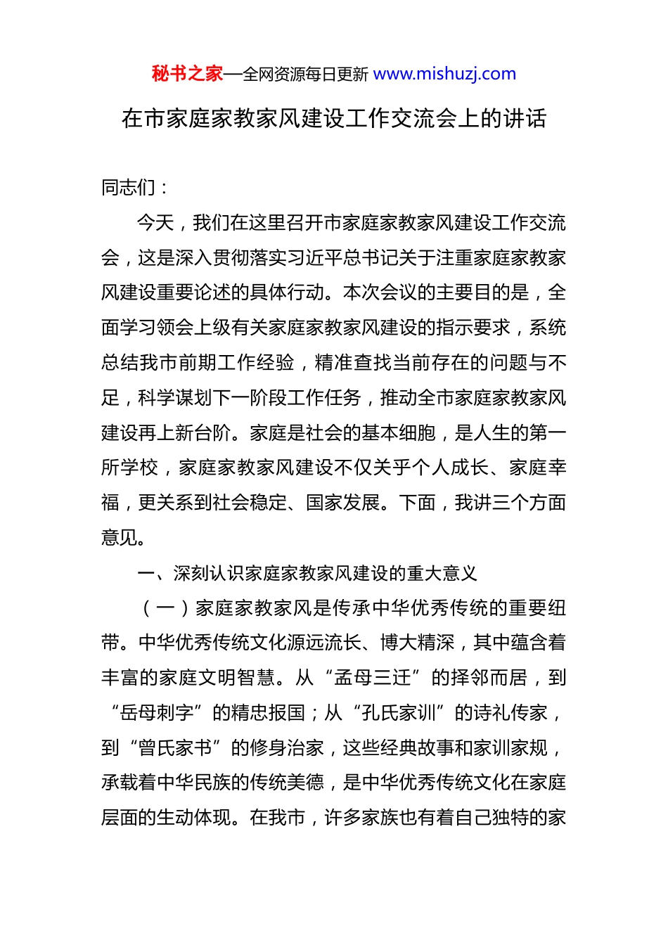 秘书之家—全网资源每日更新 www.mishuzj.com在市家庭家教家风建设工作交流会上的讲话 同志们:今天,我们在这里召开市家庭家教家风建设工作交流会,这是深入贯彻落实习近平总书记关于注重家庭家教家风建设重要论述的具体行动。本次会议的主要目的是,全面学习领会上级有关家庭家教家风建设的指示要求,系统总结我市前期工作经验,精准查找当前存在的问题与不足,科学谋划下一阶段工作任务,推动全市家庭家教家风建设再上新台阶。家庭是社会的基本细胞,是人生的第一所学校,家庭家教家风建设不仅关乎个人成长、家庭幸福,更关系到社会稳定、国家发展。下面,我讲三个方面意见。一、深刻认识家庭家教家风建设的重大意义(一)家庭家教家风是传承中华优秀传统的重要纽带。中华优秀传统文化源远流长、博大精深,其中蕴含着丰富的家庭文明智慧。从“孟母三迁”的择邻而居,到“岳母刺字”的精忠报国;从“孔氏家训”的诗礼传家,到“曾氏家书”的修身治家,这些经典故事和家训家规,承载着中华民族的传统美德,是中华优秀传统文化在家庭层面的生动体现。在我市,许多家族也有着自己独特的家秘书之家—全网资源每日更新 www.mishuzj.com风家训。比如,[姓氏]家族以“耕读传家、诚信为本”为家训,世代相传,培养出了众多优秀人才。这些家风家训不仅是家族的宝贵财富,更是中华优秀传统文化在当代社会的传承和延续。我们要深入挖掘和传承这些优秀的家庭文化,让中华优秀传统文化在新时代焕发出新的生机与活力。(二)家庭家教家风是培育和践行社会主义核心价值观的重要基础。社会主义核心价值观是当代中国精神的集中体现,凝结着全体人民共同的价值追求。家庭是培育和践行社会主义核心价值观的重要场所,家庭中的言传身教、耳濡目染,对一个人的价值观形成起着至关重要的作用。在我们身边,有许多家庭用实际行动诠释着社会主义核心价值观。比如,[家庭名称]家庭多年来坚持义务照顾社区里的孤寡老人,他们用自己的爱心和行动践行着“友善”的价值观;[家庭名称]家庭夫妻二人相互理解、相互支持,共同经营着一个温馨和睦的家庭,他们用自己的生活诠释着“和谐”的价值观。通过这些家庭的示范引领,社会主义核心价值观能够更加深入人心,融入到人们的日常生活中。(三)家庭家教家风是促进社会和谐稳定的重要保障。家庭是社会的细胞,家庭和谐是社会和谐的基础。良秘书之家—全网资源每日更新 www.mishuzj.com好的家庭家教家风能够促进家庭成员之间的和睦相处,减少家庭矛盾和纠纷,进而维护社会的和谐稳定。近年来,我市通过开展家庭家教家风建设活动,取得了显著成效。一些社区通过建立“家庭矛盾调解室”,及时化解了许多家庭矛盾,避免了矛盾的激化和升级。同时,良好的家风还能够影响和带动周边的人,形成良好的社会风尚。比如,[社区名称]社区的“最美家庭”发起了“邻里互助”活动,带动了整个社区的居民相互帮助、相互关爱,形成了良好的社区氛围。二、客观审视我市家庭家教家风建设的现状(一)工作成果丰硕,亮点纷呈。近年来,我市高度重视家庭家教家风建设,采取了一系列有力措施,取得了显著成效。一是组织领导不断加强。成立了由市委宣传部、市妇联、市教育局等多部门组成的家庭家教家风建设工作领导小组,明确了各部门的职责分工,形成了工作合力。同时,建立了定期调度、定期通报、定期考核等工作机制,确保了工作的顺利推进。二是宣传教育广泛深入。通过报纸、电视、网络等多种媒体,广泛宣传家庭家教家风建设的重要意义和先进典型。开展了“最美家庭”“五好家庭”等评选活动,选树了一批具有代表性的家庭典型,发挥了示范引领作用。此外,还编印了《家庭家教家秘书之家—全网资源每日更新 www.mishuzj.com风建设读本》等宣传资料,发放到千家万户。三是实践活动丰富多彩。开展了“家风家训进万家”“亲子阅读”“家庭志愿服务”等一系列主题实践活动,吸引了广大市民的积极参与。在学校,开设了家庭教育课程,将家庭家教家风教育纳入了学校教育体系;在社区,建立了家长学校、妇女之家等阵地,为家长提供了学习和交流的平台。(二)存在问题亟待解决。虽然我市家庭...