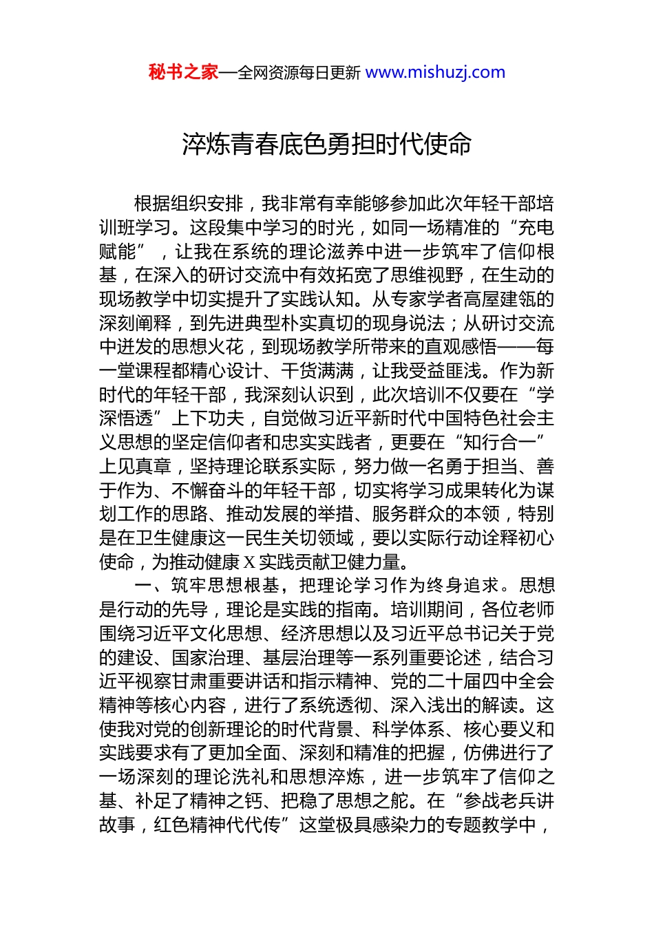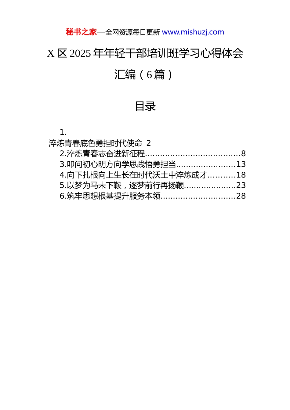 秘书之家—全网资源每日更新 www.mishuzj.comX 区 2025 年年轻干部培训班学习心得体会汇编(6 篇)目录1.淬炼青春底色勇担时代使命 22.淬炼青春志奋进新征程......................................83.叩问初心明方向学思践悟勇担当........................134.向下扎根向上生长在时代沃土中淬炼成才...........185.以梦为马未下鞍,逐梦前行再扬鞭.....................236.筑牢思想根基提升服务本领..............................28秘书之家—全网资源每日更新 www.mishuzj.com淬炼青春底色勇担时代使命根据组织安排,我非常有幸能够参加此次年轻干部培训班学习。这段集中学习的时光,如同一场精准的“充电赋能”,让我在系统的理论滋养中进一步筑牢了信仰根基,在深入的研讨交流中有效拓宽了思维视野,在生动的现场教学中切实提升了实践认知。从专家学者高屋建瓴的深刻阐释,到先进典型朴实真切的现身说法;从研讨交流中迸发的思想火花,到现场教学所带来的直观感悟——每一堂课程都精心设计、干货满满,让我受益匪浅。作为新时代的年轻干部,我深刻认识到,此次培训不仅要在“学深悟透”上下功夫,自觉做习近平新时代中国特色社会主义思想的坚定信仰者和忠实实践者,更要在“知行合一”上见真章,坚持理论联系实际,努力做一名勇于担当、善于作为、不懈奋斗的年轻干部,切实将学习成果转化为谋划工作的思路、推动发展的举措、服务群众的本领,特别是在卫生健康这一民生关切领域,要以实际行动诠释初心使命,为推动健康 X 实践贡献卫健力量。一、筑牢思想根基,把理论学习作为终身追求。思想是行动的先导,理论是实践的指南。培训期间,各位老师围绕习近平文化思想、经济思想以及习近平总书记关于党的建设、国家治理、基层治理等一系列重要论述,结合习近平视察甘肃重要讲话和指示精神、党的二十届四中全会精神等核心内容,进行了系统透彻、深入浅出的解读。这使我对党的创新理论的时代背景、科学体系、核心要义和实践要求有了更加全面、深刻和精准的把握,仿佛进行了一场深刻的理论洗礼和思想淬炼,进一步筑牢了信仰之基、补足了精神之钙、把稳了思想之舵。在“参战老兵讲故事,红色精神代代传”这堂极具感染力的专题教学中,秘书之家—全网资源每日更新 www.mishuzj.com授课老师以其亲身经历的峥嵘岁月,深情讲述了革命先辈为了民族独立和人民解放事业,如何将崇高的理想信念转化为不畏牺牲、英勇奋斗的实际行动。这些饱含热血与忠诚的真实故事,直击心灵,让我深刻体悟到,坚定的理想信念绝非虚无缥缈的口号,而是具体实在的、需要融入血脉、见诸行动的精神支柱和力量源泉。这种源自历史的强大精神动力,正是支撑我们在新时代新征程上,特别是在推进健康 X 建设、应对卫生健康领域各种风险挑战的道路上,能够始终保持战略定力,攻坚克难、持续奋斗的根本所在。卫生健康事业关系千家万户的幸福安康,是国家治理体系和治理能力现代化的重要组成部分,其改革发展必须牢牢坚持正确的政治方向。只有真正把党的创新理论学懂弄通、入脑入心,并自觉地运用到分析研判卫生健康事业发展形势、有效回应人民群众健康新期盼上来,才能把握卫生健康工作的正确方向,找准服务大局、服务群众的着力点。二、锤炼务实作风,以担当实干诠释初心使命。本次培训紧密对接新时代对年轻干部能力素质提出的新要求,课程设置科学系统、内容丰富多元,涵盖了党性修养锤炼、党的理论创新成果深化理解、履职能力精准提升、集体研讨深度交流、读书分享启迪思维、观看红色影片传承基因等多个模块。这种全方位、沉浸式的学习体验,有效弥补了我个人在知识结构、战略思维、综合协调等方面存在的短板和不足,实现了能力的迭代升级和素养的全面拓展。通过学习和反思,我深切体会到,作为卫生健康战线上的一名年轻干部,必须牢固树立并自觉践行实事求是、求真务实的工作理念和思想路线。要深刻理解并自觉涵养“功成不必在我”的精神境界和“功成必定有我”的历史担当,既要有“一张蓝图绘到底”的战略耐心,也要有秘书之家—全网资源每日更新 www.mishuzj.com“时时放心不下”的责任感。要立足卫生...