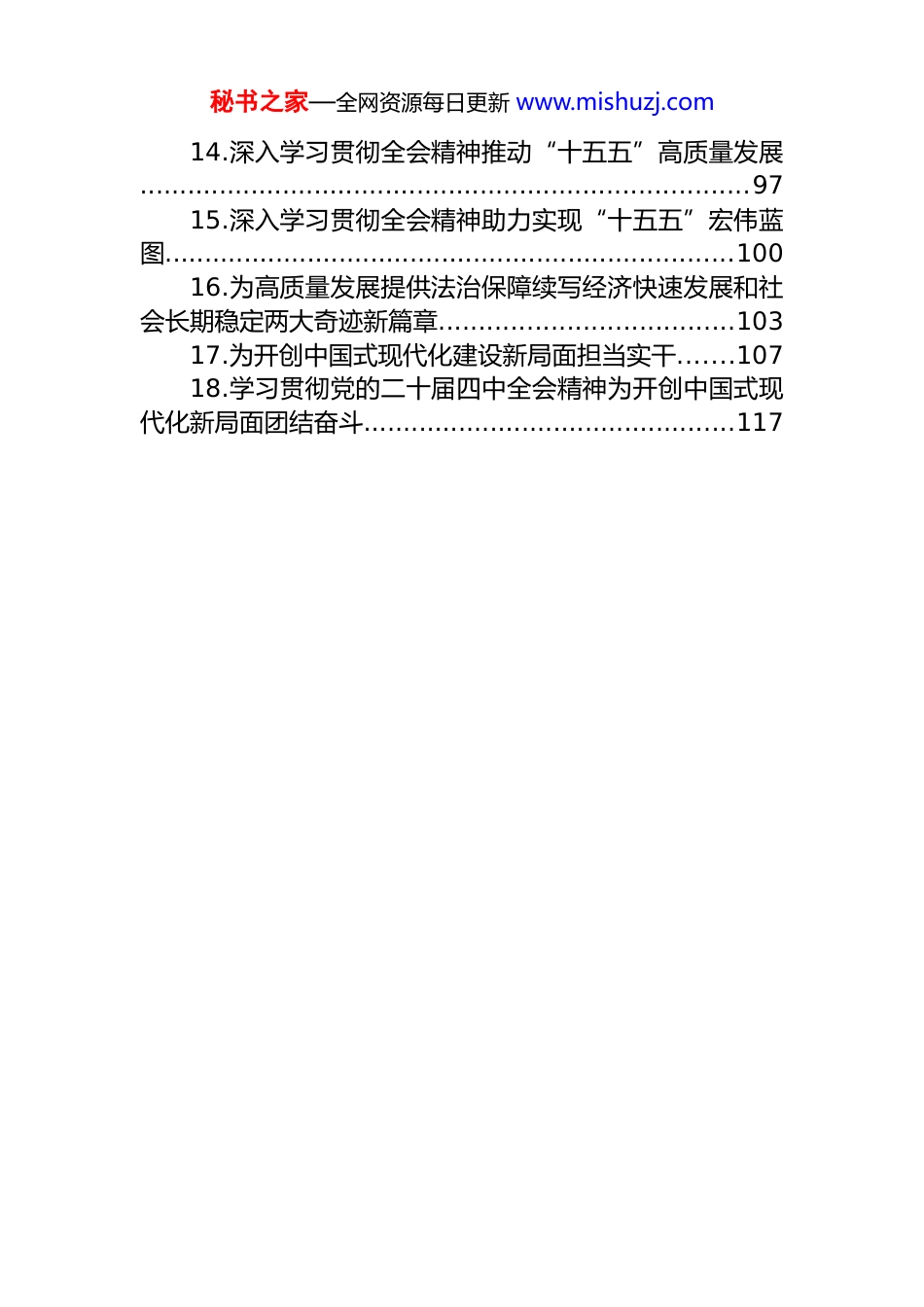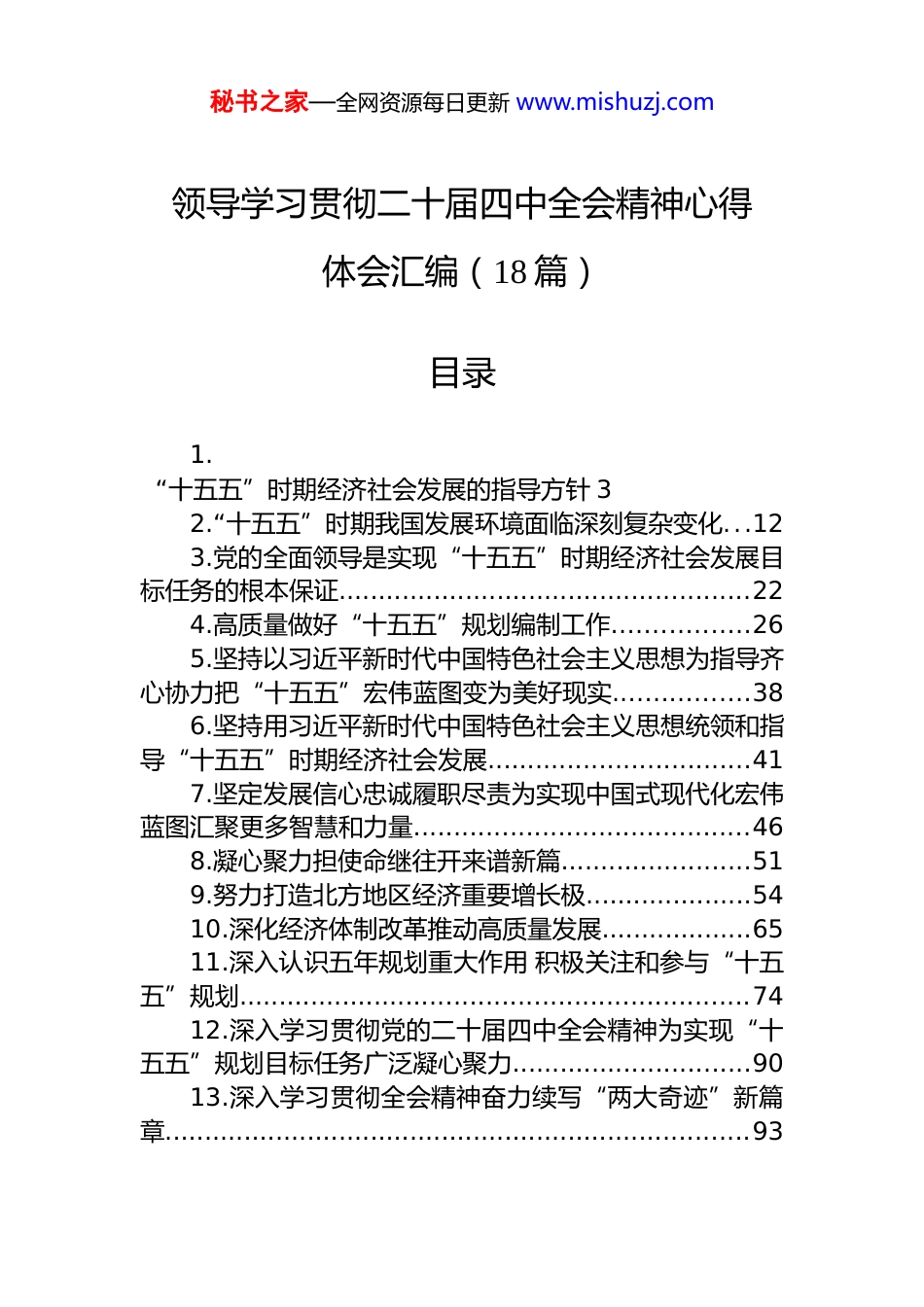 秘书之家—全网资源每日更新 www.mishuzj.com领导学习贯彻二十届四中全会精神心得体会汇编(18 篇)目录1.“十五五”时期经济社会发展的指导方针 32.“十五五”时期我国发展环境面临深刻复杂变化...123.党的全面领导是实现“十五五”时期经济社会发展目标任务的根本保证....................................................224.高质量做好“十五五”规划编制工作.................265.坚持以习近平新时代中国特色社会主义思想为指导齐心协力把“十五五”宏伟蓝图变为美好现实.................386.坚持用习近平新时代中国特色社会主义思想统领和指导“十五五”时期经济社会发展.................................417.坚定发展信心忠诚履职尽责为实现中国式现代化宏伟蓝图汇聚更多智慧和力量..........................................468.凝心聚力担使命继往开来谱新篇........................519.努力打造北方地区经济重要增长极.....................5410.深化经济体制改革推动高质量发展...................6511.深入认识五年规划重大作用 积极关注和参与“十五五”规划................................................................7412.深入学习贯彻党的二十届四中全会精神为实现“十五五”规划目标任务广泛凝心聚力..............................9013.深入学习贯彻全会精神奋力续写“两大奇迹”新篇章..........................................................................93秘书之家—全网资源每日更新 www.mishuzj.com14.深入学习贯彻全会精神推动“十五五”高质量发展.............................................................................9715.深入学习贯彻全会精神助力实现“十五五”宏伟蓝图........................................................................10016.为高质量发展提供法治保障续写经济快速发展和社会长期稳定两大奇迹新篇章.....................................10317.为开创中国式现代化建设新局面担当实干.......10718.学习贯彻党的二十届四中全会精神为开创中国式现代化新局面团结奋斗...............................................117秘书之家—全网资源每日更新 www.mishuzj.com“十五五”时期经济社会发展的指导方针党的二十届四中全会通过的《中共中央关于制定国民经济和社会发展第十五个五年规划的建议》(以下简称《建议》),明确提出了“十五五”时期经济社会发展指导方针,为做好未来五年经济社会发展工作指明了前进方向、提供了科学指引。我们要准确领会把握、全面贯彻落实,制定和实施好“十五五”规划,奋力开创中国式现代化建设新局面。一、准确把握“十五五”时期我国发展所处的历史方位《建议》指出,“十五五”时期在基本实现社会主义现代化进程中具有承前启后的重要地位,是基本实现社会主义现代化夯实基础、全面发力的关键时期。我们要以宽广的视野和战略的眼光,统筹国内国际两个大局,准确把握“十五五”时期我国发展所处的历史方位。要把“十五五”发展放在中国式现代化的历史进程中来把握。实现社会主义现代化是一个阶梯式递进、不断发展进步的历史过程。新中国成立以来,围绕现代化建设战略部署,我国接续制定和实施了一个个五年规划(计划)有力引导和推动了经济社会发展。特别是党的十八大以来以习近平同志为核心的党中央团结带领全党全国各族人民完成全面建成小康社会历史任务,实现了第一个百年奋斗目标,成功推进和拓展了中国式现代化。党的十九大、二十大就全面建成社会主义现代化强国作出“两步走”战略安排,其中,到 2035 年基本实现社会主义现代化要在全面建成小康社会基础上,通过实施“十四五”至“十六五”三个五年规划来完成。“十五五”作为承前启后的五年,在工作上要做到夯实基础、全面发力。夯实基础,就是要秘书之家—全网资源每日更新 www.mishuzj.com不懈努力、接续奋斗,为基本实现社会主义现代化奠定更加坚实的基础。“十四五”时期,我国有效应对世纪疫情严重冲击和一系列重大风险挑战,经济社会发展取得新的重大成就,第二个百年奋斗目标新征程实...