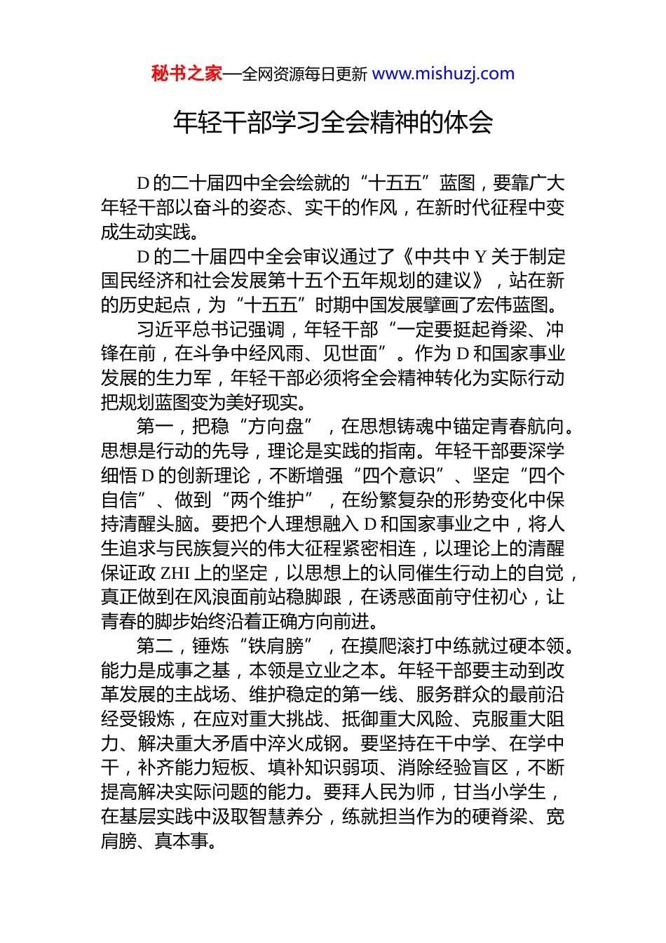 秘书之家—全网资源每日更新 www.mishuzj.com年轻干部学习全会精神的体会D 的二十届四中全会绘就的“十五五”蓝图,要靠广大年轻干部以奋斗的姿态、实干的作风,在新时代征程中变成生动实践。D 的二十届四中全会审议通过了《中共中 Y 关于制定国民经济和社会发展第十五个五年规划的建议》,站在新的历史起点,为“十五五”时期中国发展擘画了宏伟蓝图。习近平总书记强调,年轻干部“一定要挺起脊梁、冲锋在前,在斗争中经风雨、见世面”。作为 D 和国家事业发展的生力军,年轻干部必须将全会精神转化为实际行动把规划蓝图变为美好现实。第一,把稳“方向盘”,在思想铸魂中锚定青春航向。思想是行动的先导,理论是实践的指南。年轻干部要深学细悟 D 的创新理论,不断增强“四个意识”、坚定“四个自信”、做到“两个维护”,在纷繁复杂的形势变化中保持清醒头脑。要把个人理想融入 D 和国家事业之中,将人生追求与民族复兴的伟大征程紧密相连,以理论上的清醒保证政 ZHI 上的坚定,以思想上的认同催生行动上的自觉,真正做到在风浪面前站稳脚跟,在诱惑面前守住初心,让青春的脚步始终沿着正确方向前进。第二,锤炼“铁肩膀”,在摸爬滚打中练就过硬本领。能力是成事之基,本领是立业之本。年轻干部要主动到改革发展的主战场、维护稳定的第一线、服务群众的最前沿经受锻炼,在应对重大挑战、抵御重大风险、克服重大阻力、解决重大矛盾中淬火成钢。要坚持在干中学、在学中干,补齐能力短板、填补知识弱项、消除经验盲区,不断提高解决实际问题的能力。要拜人民为师,甘当小学生,在基层实践中汲取智慧养分,练就担当作为的硬脊梁、宽肩膀、真本事。秘书之家—全网资源每日更新 www.mishuzj.com第三,勇当“排头兵”,在改革创新中展现青春锐气。惟改革者进,惟创新者强。年轻干部最具创新活力,最有创业热情,要敢于打破思维定势,勇于突破路径依赖,在体制机制创新、科技自立自强、产业转型升级等重点领域大胆探索、先行先试。要发扬“初生牛犊不怕虎”的精神面对新情况新问题,主动研究新思路、拿出新举措、开创新局面,争做改革攻坚的突击队、创新发展的生力军,让青春的创造力在全面建设社会主义现代化国家的火热实践中竞相迸发。第四,甘做“实干家”,在知行合一中书写青春答卷。空谈误国,实干兴邦。蓝图绘就后,关键在于落实。年轻干部要力戒形式主义、官僚主义,坚持一步一个脚印走,一锤接着一锤敲,把宏伟目标细化为具体措施,把决策部署转化为实际行动。要发扬钉钉子精神,以“功成不必在我”的境界和“功成必定有我”的担当,咬定青山不放松不达目的不罢休,用实实在在的工作业绩诠释对 D 的忠诚、对人民的赤诚,在新时代的考场上交出优异的青春答卷。第五,筑牢“连心桥”,在服务群众中彰显青春价值。江山就是人民,人民就是江山。年轻干部要始终把人民放在心中最高位置,带着感情、带着责任深入群众,听民声察民情、解民忧,把群众的“急难愁盼”作为工作的着力点,把群众的满意度作为衡量工作的标尺。要主动走到田间地头、工厂车间、社区小巷,与群众坐一条板凳,说家常话,吃百家饭,在零距离接触中增进感情,在解决实际问题中赢得信任,让青春在为 D 和人民事业的不懈奋斗中绽放绚丽光彩。青春逢盛世,奋斗正当时。当每一位年轻干部都挺直实干的脊梁,把个人理想融入“十五五”的宏伟蓝图,以“闯”的精神、“创”的劲头、“干”的作风,勇挑重担奋发有为,中国式现代化的壮丽画卷必将更加绚丽多彩,民族复兴的伟大梦想必将早日实现。