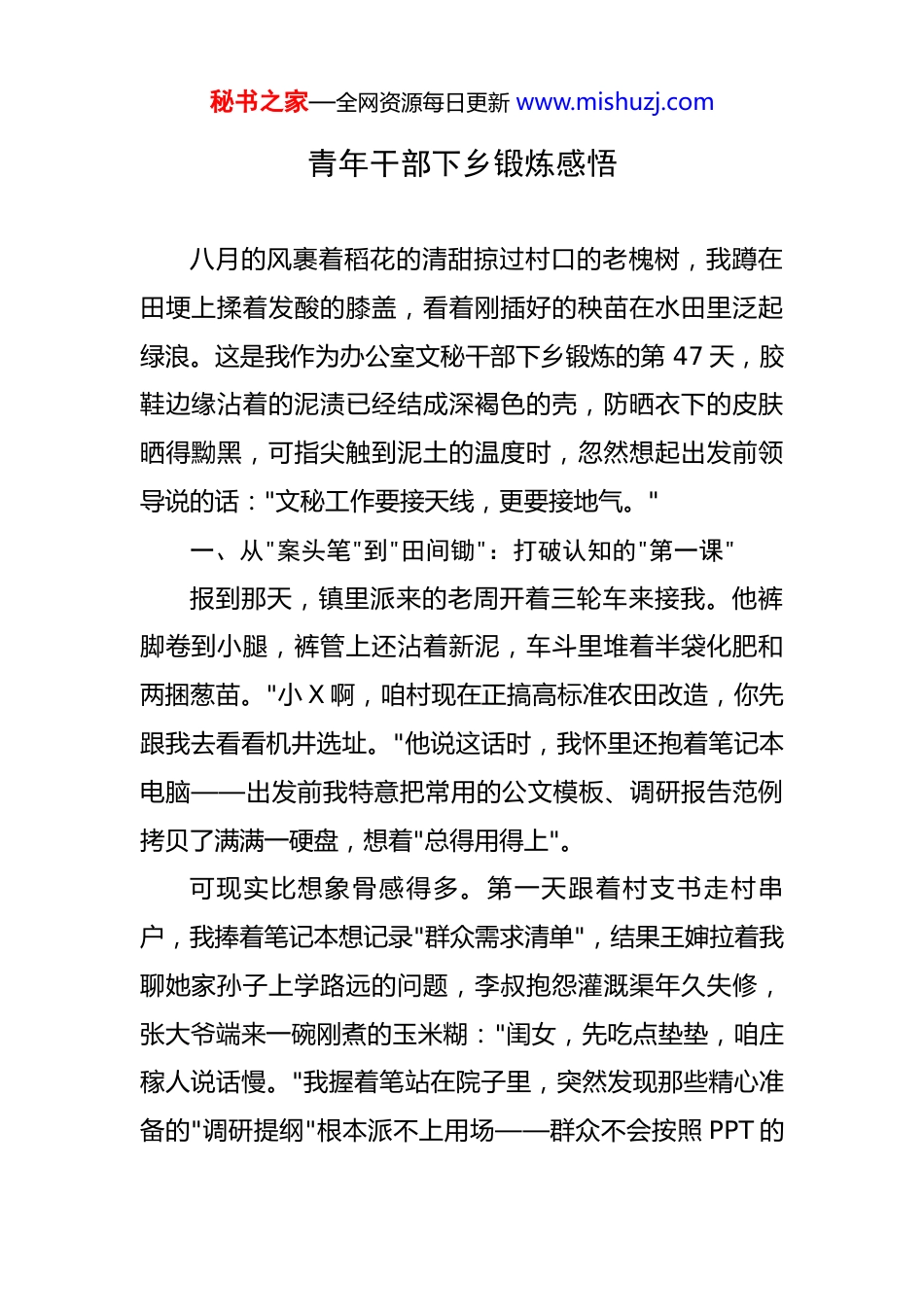 秘书之家—全网资源每日更新 www.mishuzj.com青年干部下乡锻炼感悟 八月的风裹着稻花的清甜掠过村口的老槐树,我蹲在田埂上揉着发酸的膝盖,看着刚插好的秧苗在水田里泛起绿浪。这是我作为办公室文秘干部下乡锻炼的第 47 天,胶鞋边缘沾着的泥渍已经结成深褐色的壳,防晒衣下的皮肤晒得黝黑,可指尖触到泥土的温度时,忽然想起出发前领导说的话:"文秘工作要接天线,更要接地气。"一、从"案头笔"到"田间锄":打破认知的"第一课"报到那天,镇里派来的老周开着三轮车来接我。他裤脚卷到小腿,裤管上还沾着新泥,车斗里堆着半袋化肥和两捆葱苗。"小 X 啊,咱村现在正搞高标准农田改造,你先跟我去看看机井选址。"他说这话时,我怀里还抱着笔记本电脑——出发前我特意把常用的公文模板、调研报告范例拷贝了满满一硬盘,想着"总得用得上"。可现实比想象骨感得多。第一天跟着村支书走村串户,我捧着笔记本想记录"群众需求清单",结果王婶拉着我聊她家孙子上学路远的问题,李叔抱怨灌溉渠年久失修,张大爷端来一碗刚煮的玉米糊:"闺女,先吃点垫垫,咱庄稼人说话慢。"我握着笔站在院子里,突然发现那些精心准备的"调研提纲"根本派不上用场——群众不会按照 PPT 的秘书之家—全网资源每日更新 www.mishuzj.com逻辑说话,他们的问题藏在晒谷场的草垛后,在井台边的水桶里,在晒得黝黑的皱纹里。更"狼狈"的是参与人居环境整治那天。我自告奋勇负责整理宣传材料,结果村主任拍着我肩膀说:"小 X,光写标语不管用,得跟大伙儿一起干。"于是我扛着铁锹下了地,第一次握锄头才知道,看似简单的"除草"要分清哪些是杂草哪些是菜苗,第一次挑粪桶才知道扁担压在肩上的重量,第一次清理排水沟才发现淤泥里混着碎玻璃和破布片。那天收工后,我坐在田埂上啃馒头,看着夕阳把远处的山梁染成金色,突然明白:文秘工作的"笔杆子"若不沾泥土,写出来的材料再漂亮也是空中楼阁;办公室的"明白纸"若不接地气,印出来的政策再完善也落不到实处。二、从"记录者"到"解题人":在实践中打磨的"真本事"真正让我找到状态的,是参与村史馆的筹建。村支书说:"咱村有百年历史,老祠堂拆了,老物件散在各家各户,得让年轻人知道根在哪儿。"作为文秘出身,我本能地想到整理文字资料,可走访了 23 户老人后才发现,最珍贵的"史料"藏在他们的记忆里——82 岁的赵奶奶记得 1958年大旱时全村共饮一口井的故事,75 岁的陈大爷能说出每块老砖的来历,连村头那棵歪脖子枣树,都有三代人爬树秘书之家—全网资源每日更新 www.mishuzj.com摘枣的趣闻。我改变了思路:白天跟着老人翻箱倒柜找老照片、旧地契,晚上用录音笔录下他们的讲述,周末把收集到的素材做成短视频发在村微信群。没想到,一条"寻找老支书的老怀表"的视频竟引出了在外打工的村民老吴——他翻出父亲临终前塞给他的怀表,连夜坐火车赶回来:"这表跟着我爸当支书 30 年,刻着'为人民服务',该放回村史馆。"后来,村史馆不仅陈列了老农具、旧账本,还设置了"口述历史"展区,用录音设备循环播放老人们的讲述。开馆那天,村小的孩子们挤在展柜前,指着一张 1978 年的高考准考证问:"奶奶,这是您当年的吗?"老人抹着眼泪点头:"那时候全村就一个大学生,现在你们教室都装空调了......"这件事让我深刻体会到:文秘工作的价值不仅是"记录",更是"连接"——连接过去与现在,连接政策与民心。后来村里推进"智慧乡村"建设,我主动承担了村民手机使用培训的任务。从教张大爷怎么视频通话,到帮李婶设置微信收款码,从解释"医保电子凭证"怎么用,到演示"秸秆焚烧监控系统"怎么操作,我发现,所谓"深入基层",就是把自己变成群众的"工具人":群众需要什么,我们就学什么;群众缺什么,我们就补什么。三、从"外来客"到"自家人":在烟火中生长的"真感秘书之家—全网资源每日更新 www.mishuzj.com情"下乡前,我以为"与群众打成一片"是句口号,直到有天夜里突发暴雨,我跟着村主任挨家挨户查看危房。走到独居的刘奶奶家时,她正用塑料布苫屋顶,雨水顺着皱纹往下淌。我们赶紧帮忙搬沙袋、堵漏雨点,等雨停了,刘奶奶硬塞给我们一把煮花生:"闺女,你们比我亲闺...
