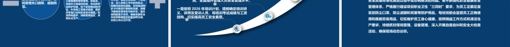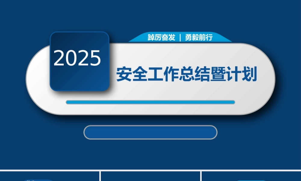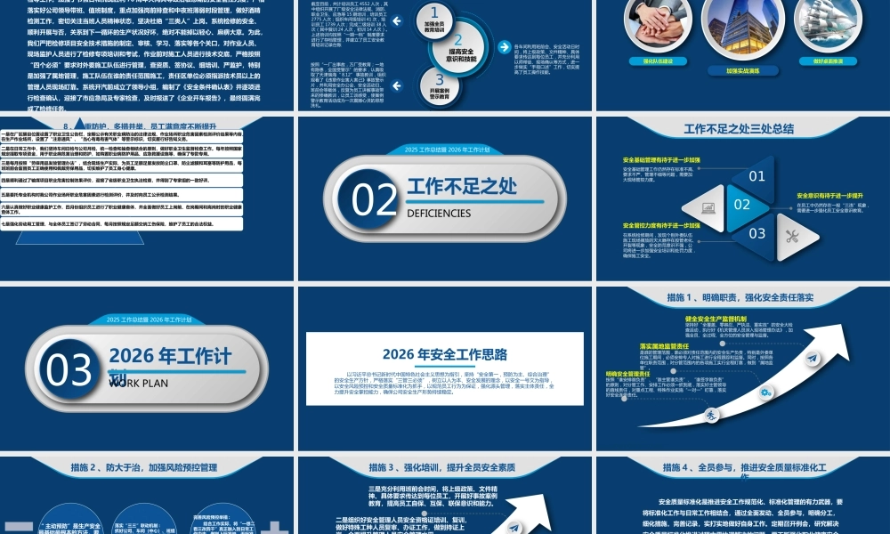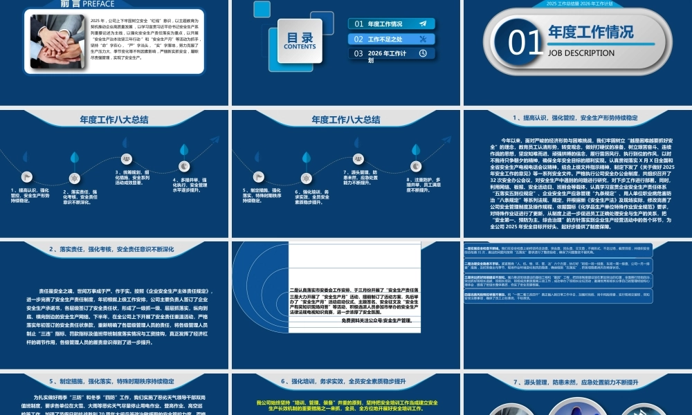 2025安全工作总结暨计划踔厉奋发 | 勇毅前行2025 年,公司上下牢固树立安全“红线”意识,以主题教育为契机推动企业高质量发展 ,以学习宣贯习近平总书记安全生产系列重要论述为主线,以强化安全生产责任落实为重点,以开展“安全生产治本攻坚三年行动 ”和“安全生产月”等活动为抓手,坚持“命”字在心,“严”字当头,“实”字落地,努力克服了生产压力大、季节变化等不利因素影响,严细新实抓安全,履职尽责强管理,实现了安全生产。前 言 PREFACE目 录CONTENTS年度工作情况01工作不足之处022026 年工作计划032025 工作总结暨 2026 年工作计划01年度工作情况JOB DESCRIPTION年度工作八大总结1 、提高认识,强化管控,安全生产形势持续稳定。2 、落实责任,强化考核,安全责任意识不断深化。3 、统筹规划,细化措施,安全系列活动成效显著。4 、多措并举,强化执行,安全管理水平逐步提升。年度工作八大总结5 、制定措施,强化落实,特殊时期秩序持续稳定。6 、强化培训,务求实效,全员安全素质稳步提升。7 、源头管理,防患未然,应急处置能力不断提升。8 、注重防护,多措并举,员工满意度不断提升。1 、提高认识,强化管控,安全生产形势持续稳定 今年以来,面对严峻的经济形势与困难挑战,我们牢固树立“越是困难越要抓好安全”的理念,教育员工认清形势,转变观念,做好打硬仗的准备,树立艰苦奋斗、连续作战的思想,坚定知难而进、顽强拼搏的信念,履行雷厉风行、执行到位的作风,以时不我待只争朝夕的精神,确保全年安全目标的顺利实现。认真贯彻落实 X 月 X 日全国和全省安全生产电视电话会议精神,结合上级文件指示精神,制定下发了《关于做好 2025年安全工作的意见》等一系列安全文件。严格执行公司安全办公会制度,共组织召开了32 次安全办公会议,对安全生产中遇到的问题进行研究,对下步工作进行部署。同时,利用网络、板报、安全活动日、班前会等载体,认真学习宣贯企业安全生产责任体系“五落实五到位规定”、企业安全生产应急管理“九条规定”、用人单位职业病危害防治“八条规定”等系列法规、规定,并根据新《安全生产法》及现场实际,修改完善了公司安全管理制度及操作规程,依据国标《化学品生产单位特殊作业安全规范》要求,对特殊作业证进行了更新,从制度上进一步促进员工正确处理安全与生产的关系,把“安全第一、预防为主、综合治理”的方针落实到企业生产经营活动中的各个环节,为全公司 2025 年安全目标开好头、起好步提供了制度保障。2 、落实责任,强化考核,安全责任意识不断深化 责任是安全之魂,世间万事成于严、作于实。按照《企业安全生产主体责任规定》,进一步完善了安全生产责任制度,年初根据上级工作安排,公司主要负责人签订了企业安全生产承诺书,各层级签订了安全责任状,形成了一级抓一级、层层抓落实,纵向到底、横向到边的安全生产网络。下半年,在全公司上下开展了安全责任重温活动,严格落实年初签订的安全责任状条款,重新明确了各层级管理人员的责任,将各级管理人员制止“三违”指标、罚款指标及值班带班制度落实情况与工资挂钩,真正发挥了经济杠杆的调节作用,各级管理人员的履责意识得到了进一步提升。3 、统筹规划,细化措施,安全系列活动成效显著精心打造企业安全文化,是搞好安全生产的必要前提。在安全生产实践中,我们把安全文化建设渗透到生产的全过程,达到了“物化于行、内化于心、外化于形”的效果,营造了“人人讲安全、时时讲遵章、处处有提醒、层层有关怀”的安全文化氛围。一是根据上级《安全生产治本攻坚三年行动》工作要求,重新审视我们面临的严峻形势,成立了活动领导小组,明确了工作思路,开展了系列安全检查活动,切实增强了忧患意识、“红线”意识和责任意识。二是认真落实市安委会工作安排,于三月份开展了“安全生产责任落实月”活动,组织了“生命至上、安全为天”征文比赛,进一步浓厚了安全生产氛围。三是大力开展了“安全生产月”活动,提前制订了活动方案,先后举办了“安全生产月”活动启动仪式、主题签名、安全征文及“安全生产有奖知识现场问答”等...