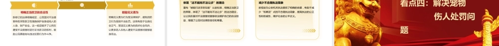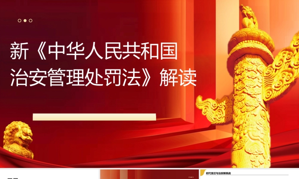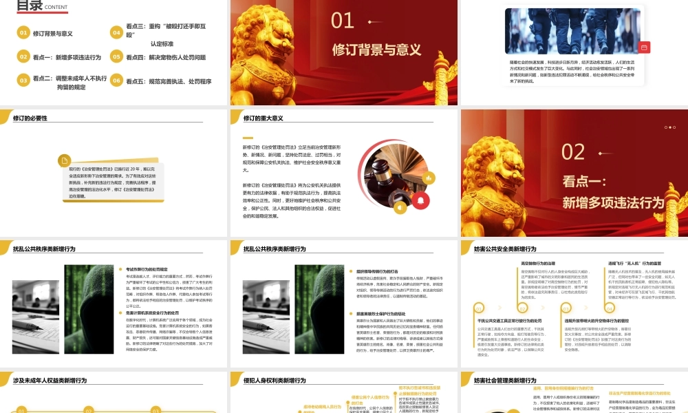新《中华人民共和国治安管理处罚法》解读修订背景与意义看点一:新增多项违法行为0102看点三:重构“被殴打还手即互殴” 认定标准看点四:解决宠物伤人处罚问题0405目录 CONTENT看点二:调整未成年人不执行 拘留的规定03看点五:规范完善执法、处罚程序0601修订背景与意义随着社会的快速发展,科技进步日新月异,经济活动愈发活跃,人们的生活方式和社交模式发生了巨大变化。与此同时,社会治安领域也出现了一系列新情况和新问题,如新型违法犯罪活动不断涌现,给社会秩序和公共安全带来了新的挑战。时代变迁与治安新挑战现行的《治安管理处罚法》已施行近 20 年,难以完全适应新形势下治安管理的需求。为了有效应对这些新挑战,补充新的违法行为规定,完善执法程序,提高治安管理的法治化水平,修订《治安管理处罚法》迫在眉睫。修订的必要性新修订的《治安管理处罚法》立足当前治安管理新形势、新情况、新问题,坚持处罚法定、过罚相当,对规范和保障公安机关执法、维护社会安全秩序意义重大。新修订的《治安管理处罚法》将为公安机关执法提供更有力的法律依据,有助于规范执法行为,提高执法效率和公正性。同时,更好地维护社会秩序和公共安全,保护公民、法人和其他组织的合法权益,促进社会的和谐稳定发展。修订的重大意义02看点一:新增多项违法行为考试作弊行为的处罚规定考试是选拔人才、评价能力的重要方式,然而,考试作弊行为严重破坏了考试的公平性和公信力,损害了广大考生的利益。新修订的《治安管理处罚法》将考试作弊行为纳入处罚范畴,对组织作弊、帮助他人作弊、代替他人参加考试等行为,都将依法给予相应的治安管理处罚,以维护考试秩序的公平公正。危害计算机系统安全行为的处罚在数字化时代,计算机系统广泛应用于各个领域,成为社会运行的重要基础设施。危害计算机系统安全的行为,如黑客攻击、恶意软件传播、网络诈骗等,不仅会导致个人信息泄露、财产损失,还可能对国家关键信息基础设施造成严重威胁。新修订的法律明确了对这些行为的处罚措施,加大了对网络安全的保护力度。扰乱公共秩序类新增行为组织领导传销行为的打击传销活动以虚假宣传、欺诈手段骗取他人钱财,严重破坏市场经济秩序,危害社会稳定和人民群众的财产安全。新规定对组织、领导传销活动的行为进行严厉打击,依法追究组织者和领导者的法律责任,以遏制传销活动的蔓延。损害英雄烈士保护行为的惩处英雄烈士为国家和人民做出了巨大牺牲和贡献,他们的事迹和精神是中华民族的共同历史记忆和宝贵精神财富。任何损害英雄烈士名誉、荣誉的行为,都是对历史的亵渎和对民族精神的伤害。新修订的法律对侮辱、诽谤或者以其他方式侵害英雄烈士的姓名、肖像、名誉、荣誉,损害社会公共利益的行为,给予治安管理处罚,以捍卫英雄烈士的尊严。扰乱公共秩序类新增行为01公共交通工具是人们出行的重要方式,干扰其正常行驶,如抢夺方向盘、殴打驾驶员等行为,严重威胁到车上乘客和道路行人的生命安全,极易引发重大交通事故。新修订的法律将此类行为列为处罚对象,依法严惩,以保障公共交通安全。干扰公共交通工具正常行驶行为的处罚03违规升放孔明灯等带明火的升空物体,容易引发火灾事故,对公共安全造成严重危害。新修订的《治安管理处罚法》加强了对这类行为的管控,对违规升放者给予相应的处罚,以消除安全隐患。违规升放带明火的升空物体行为的管控02高空抛物不仅对行人的人身安全构成巨大威胁,还严重影响了城市的文明形象和居民的生活质量。新规定明确了对高空抛物行为的处罚,对高空抛物者依法给予治安管理处罚,情节严重的,将依法追究刑事责任,以杜绝此类危险行为的发生。高空抛物行为的治理04随着无人机技术的普及,无人机的使用越来越广泛,但同时也带来了一些安全问题,如无人机干扰民航客机正常起降、侵犯他人隐私等。新规定对违规飞行无人机的行为进行规范和监管,对未经许可在禁飞区域飞行、干扰其他航空器正常运行等行为,依法给予治安管理处罚。违规飞行“无人机”行为的监管妨害公共安全类新增行为组织、胁迫未成年人从事有偿陪侍活动,严重损害了未成年人的身心健康,违背了...