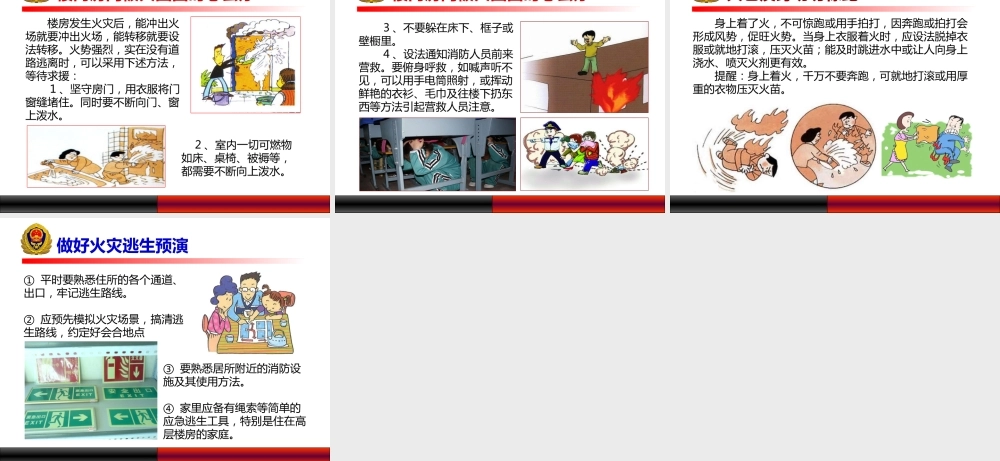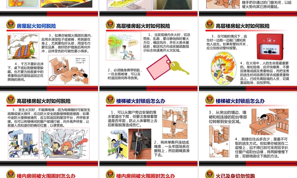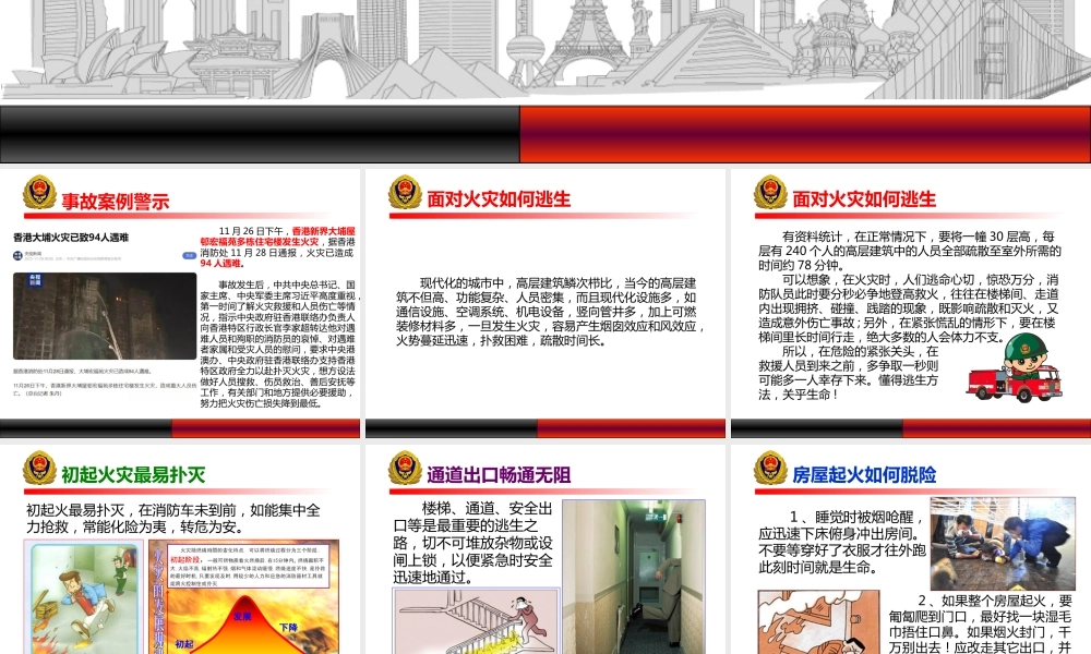 事故案例警示 11 月 26 日下午,香港新界大埔屋邨宏福苑多栋住宅楼发生火灾,据香港消防处 11 月 28 日通报,火灾已造成94 人遇难。 事故发生后,中共中央总书记、国家主席、中央军委主席习近平高度重视,第一时间了解火灾救援和人员伤亡等情况,指示中央政府驻香港联络办负责人向香港特区行政长官李家超转达他对遇难人员和殉职的消防员的哀悼、对遇难者家属和受灾人员的慰问,要求中央港澳办、中央政府驻香港联络办支持香港特区政府全力以赴扑灭火灾,想方设法做好人员搜救、伤员救治、善后安抚等工作,有关部门和地方提供必要援助,努力把火灾伤亡损失降到最低。 面对火灾如何逃生 现代化的城市中,高层建筑鳞次栉比,当今的高层建筑不但高、功能复杂、人员密集,而且现代化设施多,如通信设施、空调系统、机电设备,竖向管井多,加上可燃装修材料多,一旦发生火灾,容易产生烟囱效应和风效应,火势蔓延迅速,扑救困难,疏散时间长。 面对火灾如何逃生 有资料统计,在正常情况下,要将一幢 30 层高,每层有 240 个人的高层建筑中的人员全部疏散至室外所需的时间约 78 分钟。 可以想象,在火灾时,人们逃命心切,惊恐万分,消防队员此时要分秒必争地登高救火,往往在楼梯间、走道内出现拥挤、碰撞、践踏的现象,既影响疏散和灭火,又造成意外伤亡事故 ; 另外,在紧张慌乱的情形下,要在楼梯间里长时间行走,绝大多数的人会体力不支。 所以,在危险的紧张关头,在救援人员到来之前,多争取一秒则可能多一人幸存下来。懂得逃生方法,关乎生命 ! 初起火灾最易扑灭初起火最易扑灭,在消防车未到前,如能集中全力抢救,常能化险为夷,转危为安。 通道出口畅通无阻 楼梯、通道、安全出口等是最重要的逃生之路,切不可堆放杂物或设闸上锁,以便紧急时安全迅速地通过。 房屋起火如何脱险 1 、睡觉时被烟呛醒,应迅速下床俯身冲出房间。不要等穿好了衣服才往外跑,此刻时间就是生命。 2 、如果整个房屋起火,要匍匐爬到门口,最好找一块湿毛巾捂住口鼻。如果烟火封门,千万别出去!应改走其它出口,并随手把你通过的门窗关闭,以延缓火势向其它房间蔓延。 房屋起火如何脱险 4 、千万不要趴在床下、桌下或钻到壁橱里躲藏。也不要为抢救家中的贵重物品而冒险返回正在燃烧的房间。 3 、如果你被烟火围困在屋内 ,应用水浸湿毯子或被褥,将其披在身上,尤其要包好头部,用湿毛巾蒙住品鼻,做好防护措施后再向外冲,这样受伤的可能性要小得多。 高层楼房起火时如何脱险 1 、当发现楼内失火时,切忌慌张、乱跑,要冷静地探时着火方位,确定风向,并在火势未蔓延前,朝逆风方向或依据疏散指示标志快速离开火灾区域。2 、必须随身携带钥匙,一旦去路被堵,可以及时退回房间再寻良策。 高层楼房起火时如何脱险 3 、在可能的情况下,逃生时一边跑一边敲门通知其他人逃生。如果有警铃开关,应立刻按动警铃报警。 4 、在火场中,人的生命是最重要的。身处险境,应尽快撤离,不要因害羞或顾及贵重物品,而把宝贵的逃生时间浪费在穿衣或搬贵重物品上。已经先离险境的人员,切莫重返险地,自投罗网。 高层楼房起火时如何脱险 5 、发生火灾时,不能乘电梯,因为电梯随时可能发生故障或被火烧坏;应沿防火安全疏散楼梯朝底楼跑;如果中途防火楼梯被堵死,应立即返回到屋顶平台,并呼救求援。也可以将楼梯间的窗户玻璃打破,向外高声呼救,让救援人员知道你的确切位置,以便营救。 楼梯被火封锁后怎么办 1 、可以从窗户旁边安装的落水管道往下爬,但要注意察看管道是否牢固,防止人体攀附上去后断裂脱落造成伤亡。2 、将床单撕开连结成绳索,一头牢固地系在窗框上,然后顺绳索滑下去。 楼梯被火封锁后怎么办3 、从突出的墙边、墙裙和相连接的阳台等部位转移到安全区域。4 、跳楼往往凶多吉少,是最不可取的逃生方式。但如果你被困在二层楼上,迫不得已则可采用双手扒住窗户或阳台边缘,将两脚慢慢下放,双膝微曲往下跳的方法。 楼内房间被火围困时怎么办 楼房发生火灾后,能冲出火场就要冲出火场,能转移就要设法转移。火势强烈,实在没有道路逃...