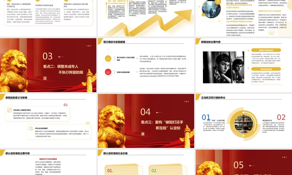 新《中华人民共和国治安管理处罚法》解读修订背景与意义看点一:新增多项违法行为0102看点三:重构“被殴打还手即互殴” 认定标准看点四:解决宠物伤人处罚问题0405目录 CONTENT看点二:调整未成年人不执行 拘留的规定03看点五:规范完善执法、处罚程序0601修订背景与意义随着社会的快速发展,科技进步日新月异,经济活动愈发活跃,人们的生活方式和社交模式发生了巨大变化。与此同时,社会治安领域也出现了一系列新情况和新问题,如新型违法犯罪活动不断涌现,给社会秩序和公共安全带来了新的挑战。时代变迁与治安新挑战现行的《治安管理处罚法》已施行近 20 年,难以完全适应新形势下治安管理的需求。为了有效应对这些新挑战,补充新的违法行为规定,完善执法程序,提高治安管理的法治化水平,修订《治安管理处罚法》迫在眉睫。修订的必要性新修订的《治安管理处罚法》立足当前治安管理新形势、新情况、新问题,坚持处罚法定、过罚相当,对规范和保障公安机关执法、维护社会安全秩序意义重大。新修订的《治安管理处罚法》将为公安机关执法提供更有力的法律依据,有助于规范执法行为,提高执法效率和公正性。同时,更好地维护社会秩序和公共安全,保护公民、法人和其他组织的合法权益,促进社会的和谐稳定发展。修订的重大意义02看点一:新增多项违法行为考试作弊行为的处罚规定考试是选拔人才、评价能力的重要方式,然而,考试作弊行为严重破坏了考试的公平性和公信力,损害了广大考生的利益。新修订的《治安管理处罚法》将考试作弊行为纳入处罚范畴,对组织作弊、帮助他人作弊、代替他人参加考试等行为,都将依法给予相应的治安管理处罚,以维护考试秩序的公平公正。危害计算机系统安全行为的处罚在数字化时代,计算机系统广泛应用于各个领域,成为社会运行的重要基础设施。危害计算机系统安全的行为,如黑客攻击、恶意软件传播、网络诈骗等,不仅会导致个人信息泄露、财产损失,还可能对国家关键信息基础设施造成严重威胁。新修订的法律明确了对这些行为的处罚措施,加大了对网络安全的保护力度。扰乱公共秩序类新增行为组织领导传销行为的打击传销活动以虚假宣传、欺诈手段骗取他人钱财,严重破坏市场经济秩序,危害社会稳定和人民群众的财产安全。新规定对组织、领导传销活动的行为进行严厉打击,依法追究组织者和领导者的法律责任,以遏制传销活动的蔓延。损害英雄烈士保护行为的惩处英雄烈士为国家和人民做出了巨大牺牲和贡献,他们的事迹和精神是中华民族的共同历史记忆和宝贵精神财富。任何损害英雄烈士名誉、荣誉的行为,都是对历史的亵渎和对民族精神的伤害。新修订的法律对侮辱、诽谤或者以其他方式侵害英雄烈士的姓名、肖像、名誉、荣誉,损害社会公共利益的行为,给予治安管理处罚,以捍卫英雄烈士的尊严。扰乱公共秩序类新增行为01公共交通工具是人们出行的重要方式,干扰其正常行驶,如抢夺方向盘、殴打驾驶员等行为,严重威胁到车上乘客和道路行人的生命安全,极易引发重大交通事故。新修订的法律将此类行为列为处罚对象,依法严惩,以保障公共交通安全。干扰公共交通工具正常行驶行为的处罚03违规升放孔明灯等带明火的升空物体,容易引发火灾事故,对公共安全造成严重危害。新修订的《治安管理处罚法》加强了对这类行为的管控,对违规升放者给予相应的处罚,以消除安全隐患。违规升放带明火的升空物体行为的管控02高空抛物不仅对行人的人身安全构成巨大威胁,还严重影响了城市的文明形象和居民的生活质量。新规定明确了对高空抛物行为的处罚,对高空抛物者依法给予治安管理处罚,情节严重的,将依法追究刑事责任,以杜绝此类危险行为的发生。高空抛物行为的治理04随着无人机技术的普及,无人机的使用越来越广泛,但同时也带来了一些安全问题,如无人机干扰民航客机正常起降、侵犯他人隐私等。新规定对违规飞行无人机的行为进行规范和监管,对未经许可在禁飞区域飞行、干扰其他航空器正常运行等行为,依法给予治安管理处罚。违规飞行“无人机”行为的监管妨害公共安全类新增行为组织、胁迫未成年人从事有偿陪侍活动,严重损害了未成年人的身心健康,违背了...