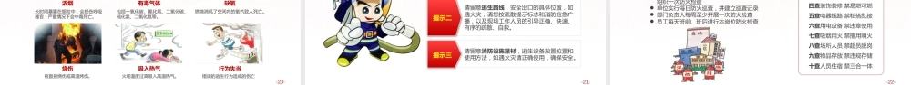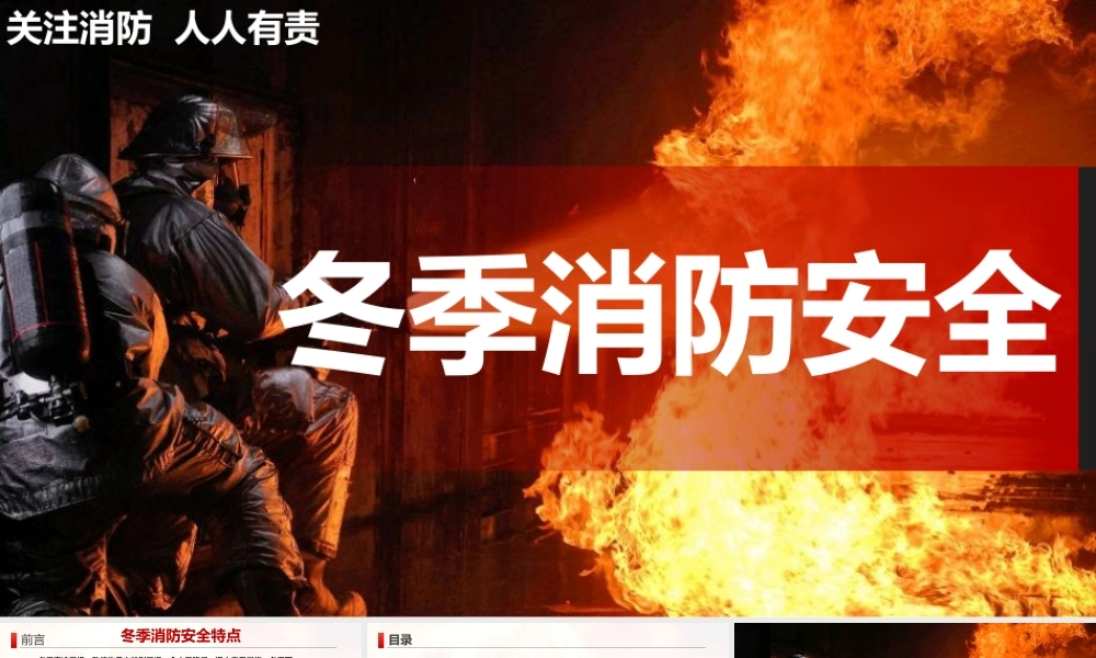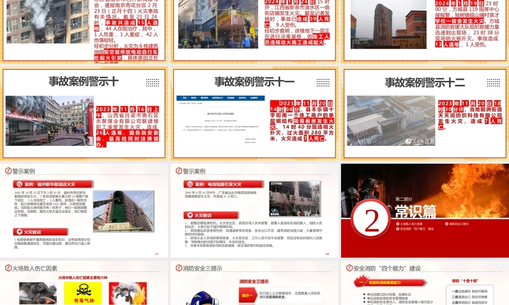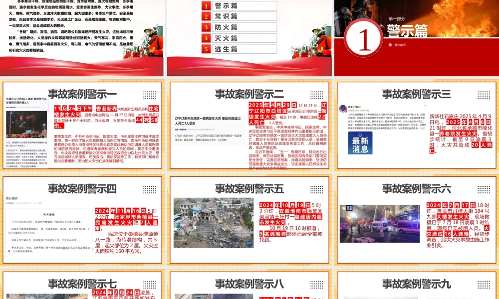 关注消防 人人有责冬季消防安全-2-前言 冬季寒冷干燥,致使物品也特别干燥,含水量降低,遇火容易燃烧;冬季雨雪时,遇水能发生化学反应的物质遇雨水、受潮会发生爆炸、火灾事故;冬季用火、用电、用气增多,又逢烤火取暖时期,起火因素多;冬季生产繁忙,安全易被忽视,而且冬季又是储藏季节,无论是工厂企业,还是居民家庭,物资相对集中,一旦发生火灾,就会造成较大的损失。 “ 冬防”期间,宾馆、酒店、网吧等公共聚集场所易发生火灾。这些场所用电较多、线路老化、人员操作失误等都易造成短路起火。天气寒冷,家庭用火、用电、用气增多,居民家中容易引发火灾。可以说,电气的管理使用不当,是这些场所引发火灾的罪魁祸首。冬季消防安全特点-3-目录常 识 篇防 火 篇灭 火 篇234逃 生 篇5警 示 篇11警示篇第一部分警示案例事故案例警示一11 月 26 日下午,香港新界大埔屋邨宏福苑多栋住宅楼发生火灾 。据香港电台网站 11 月 27 日消息,大埔宏福苑五级火焚烧十多个小时后,仍未救熄,火警至今造成 44 死 58伤。事故发生后,中共中央总书记、国家主席、中央军委主席习近平高度重视,第一时间了解火灾救援和人员伤亡等情况,指示中央政府驻香港联络办负责人向香港特区行政长官李家超转达他对遇难人员和殉职的消防员的哀悼、对遇难者家属和受灾人员的慰问,要求中央港澳办、中央政府驻香港联络办支持香港特区政府全力以赴扑灭火灾,想方设法做好人员搜救、伤员救治、善后安抚等工作,有关部门和地方提供必要援助,努力把火灾伤亡损失降到最低。事故案例警示二2025 年 4 月 29 日 12 时 25 分,辽宁 辽 阳 市 白 塔 区 三里庄回迁楼附近一饭店发生火灾 。截至 14 时,事故已造成 22人死亡、 3 人受伤。事故发生后,中共中央总书记、国家主席、中央军委主席习近平高度重视并作出重要指示指出,辽宁辽阳市白塔区一饭店发生火灾造成重大人员伤亡,教训十分深刻!要全力救治受伤人员,妥善做好遇难人员善后及家属安抚等工作,尽快查明原因,依法严肃追责。习近平强调,“五一”假期在即,群众出行出游增多,假日活动密集,各地区和有关部门要落实安全责任,完善应急预案,排查风险隐患,坚决防范遏制重大安全事故发生,切实保障人民群众生命财产安全和社会大局稳定。事故案例警示三新华社石家庄 2025 年 4 月 9日电, 2025 年 4 月 8 日21 时许,河北省承德市隆化县一养老院发生火灾。据初步 统 计 , 截 至 9 日 凌 晨 3时 , 火 灾 共 造 成 20 人 死亡。事故案例警示四2024 年 11 月 16 日 5 时2 分许,张 家 界 市 桑 植 县 一民 房 发 生 火 灾 致 7 人 遇难。 民房位于桑植县澧源镇八一路,为砖混结构,共 5层,起火部位为 2 层。火灾过火面积约 160 平方米。事故案例警示五2024 年 10 月 19 日 5 时3 分许,安 徽 淮 南 市 潘集区架河镇王圩村一自 建 房 内 超市发生火灾 。 10 月 19 日 16 时报道,9 名 遇 难 者 遗体已经全部被找到。事故案例警示六2024 年 7 月 17 日 18 时许,自贡市丹桂大街 184 号九鼎大楼发生火灾,现场救援已于 7 月 18 日凌晨 3 时结束,现场已无被困人员。火灾 造 成 16 人 遇 难 。经初步调查,此次火灾事故由施工作业引发。事故案例警示七2024 年 2 月 24 日 凌晨,江苏省南京市召开新闻发布会,通报南京雨花台区 2 月23 日(正月十四)火灾事故有 关 情 况 。 截 至 23 日 24时 , 事 故 共 造 成 15 人 遇难, 44 人在院治疗,其中,1 人危重, 1 人重症, 42 人伤情较轻。经初步分析,火灾为 6 栋建筑地面架空层停放电动自行车处 起 火 引 发 ,具体原因正在进一步调查事故案例警示八2024 年 1 月 24 日 15 时许,江西省新余市渝水区一临街店铺发生火灾。截至记者发稿时,事故已造 成 39 人 死亡、 9 人受伤。经初步查明,该楼地下一层正在进行冷库装修,因施 工 人员违规动火施工造成起火。事故案例警示九2024 ...