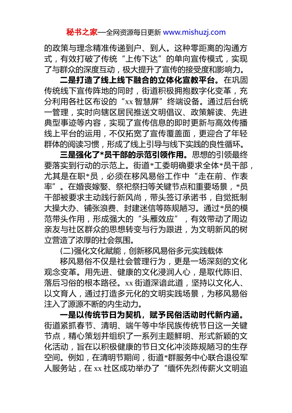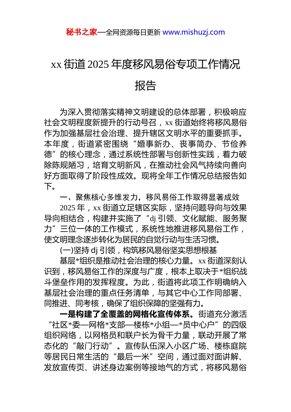 秘书之家—全网资源每日更新 www.mishuzj.comxx 街道 2025 年度移风易俗专项工作情况报告为深入贯彻落实精神文明建设的总体部署,积极响应社会文明程度新提升的行动号召,xx 街道始终将移风易俗作为加强基层社会治理、提升辖区文明水平的重要抓手。本年度,街道紧密围绕“婚事新办、丧事简办、节俭养德”的核心理念,通过系统性部署与创新性实践,着力破除陈规陋习,培育文明新风,在推动社会风气持续向善向好方面取得了阶段性成效。现将全年工作情况总结报告如下。一、聚焦核心多维发力,移风易俗工作取得显著成效2025 年,xx 街道立足辖区实际,坚持问题导向与效果导向相结合,构建并实施了“dj 引领、文化赋能、服务聚力”三位一体的工作模式,系统性地推进移风易俗工作,使文明理念逐步转化为居民的自觉行动与生活习惯。(一)坚持 dj 引领,构筑移风易俗坚实思想根基基层*组织是推动社会治理的核心力量。xx 街道深刻认识到,移风易俗工作的深度与广度,根本上取决于*组织战斗堡垒作用的发挥程度。为此,街道将此项工作明确纳入基层社会治理的重点任务清单,与其它中心工作同部署、同推进、同考核,确保了组织保障的坚强有力。一是构建了全覆盖的网格化宣传体系。街道充分激活“社区*委—网格*支部—楼栋*小组—*员中心户”的四级组织网络,以网格员和联户长为骨干力量,联动开展了常态化的“敲门行动”。宣传队伍深入小区广场、楼栋庭院等居民日常生活的“最后一米”空间,通过面对面讲解、发放宣传页、讲述身边案例等接地气的方式,将移风易俗秘书之家—全网资源每日更新 www.mishuzj.com的政策与理念精准传递到户、到人。这种零距离的沟通方式,有效打破了传统“上传下达”的单向宣传模式,实现了与群众的深度互动,极大提升了宣传的接受度和影响力。二是打造了线上线下融合的立体化宣教平台。在巩固传统线下宣传阵地的同时,街道积极拥抱数字化变革,充分利用各社区布设的“xx 智慧屏”终端设备。通过后台统一管理,实时向辖区居民推送文明倡议、政策解读、先进典型事迹等内容,实现了宣传信息的即时更新与高效传播线上平台的运用,不仅拓宽了宣传覆盖面,更迎合了年轻群体的阅读习惯,形成了线上引导与线下实践的良性循环。三是强化了*员干部的示范引领作用。思想的引领最终要落实到行动的示范上。街道*工委明确要求全体*员干部,尤其是在职*员,必须在移风易俗工作中“走在前、作表率”。在婚丧嫁娶、祭祀祭扫等关键节点和重要场景,*员干部被要求主动践行新风尚,带头签订承诺书,自觉抵制大操大办、铺张浪费、封建迷信等陈规陋习。通过*员的模范带头作用,形成强大的“头雁效应”,有效带动了周边亲友与社区群众的思想转变与行为跟进,为文明新风的树立营造了浓厚的社会氛围。(二)强化文化赋能,创新移风易俗多元实践载体移风易俗不仅是社会管理行为,更是一场深刻的文化观念变革。用先进、健康的文化浸润人心,是取代陈旧、落后习俗的根本路径。xx 街道深谙此道,坚持以文化人、以文育人,通过打造多元化的文明实践场景,为移风易俗注入了源源不断的内生动力。一是以传统节日为契机,赋予民俗活动时代新内涵。街道紧抓春节、清明、端午等中华民族传统节日这一关键节点,精心策划并组织了一系列主题鲜明、形式新颖的文化活动,旨在以积极健康的节日文化冲淡陈规陋习的生存空间。例如,在清明节期间,街道*群服务中心联合退役军人服务站,在 xx 社区成功举办了“缅怀先烈传薪火文明追秘书之家—全网资源每日更新 www.mishuzj.com思寄深情”主题活动。活动邀请了 30 余名退役军人担任“文明祭祀宣传大使”,通过英烈故事宣讲、线上“云祭扫”操作指导、放飞思念气球等富有仪式感与教育意义的环节,积极倡导鲜花祭扫、网络追思、家庭追思会等绿色低碳、文明的现代祭祀方式。活动现场共发放《绿色清明倡议书》百余份,有效引导了群众摒弃烧纸焚香等传统祭祀陋习。此外,围绕春节、端午等重要节日,全年累计开展了包括“邻里节”“民俗展演”在内的各类群众性文化活动 18 场,极大地丰富了居民的精神文化生活。二是以非遗传承为载体,涵养居民群众健康审...