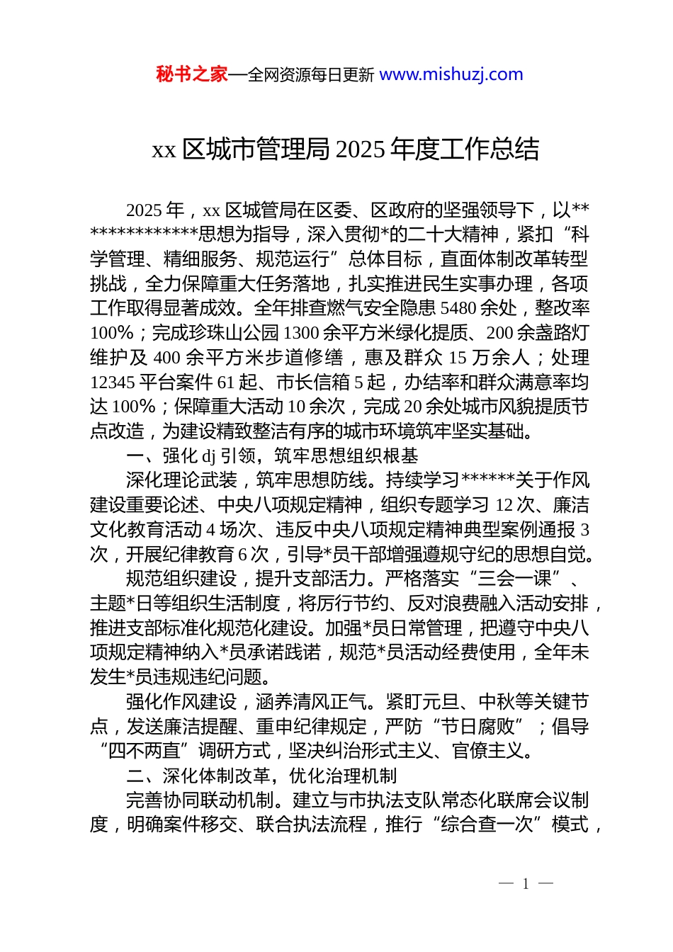 秘书之家—全网资源每日更新 www.mishuzj.comxx 区城市管理局 2025 年度工作总结2025 年,xx 区城管局在区委、区政府的坚强领导下,以**************思想为指导,深入贯彻*的二十大精神,紧扣“科学管理、精细服务、规范运行”总体目标,直面体制改革转型挑战,全力保障重大任务落地,扎实推进民生实事办理,各项工作取得显著成效。全年排查燃气安全隐患 5480 余处,整改率100%;完成珍珠山公园 1300 余平方米绿化提质、200 余盏路灯维护及 400 余平方米步道修缮,惠及群众 15 万余人;处理12345 平台案件 61 起、市长信箱 5 起,办结率和群众满意率均达 100%;保障重大活动 10 余次,完成 20 余处城市风貌提质节点改造,为建设精致整洁有序的城市环境筑牢坚实基础。一、强化 dj 引领,筑牢思想组织根基深化理论武装,筑牢思想防线。持续学习******关于作风建设重要论述、中央八项规定精神,组织专题学习 12 次、廉洁文化教育活动 4 场次、违反中央八项规定精神典型案例通报 3次,开展纪律教育 6 次,引导*员干部增强遵规守纪的思想自觉。规范组织建设,提升支部活力。严格落实“三会一课”、主题*日等组织生活制度,将厉行节约、反对浪费融入活动安排,推进支部标准化规范化建设。加强*员日常管理,把遵守中央八项规定精神纳入*员承诺践诺,规范*员活动经费使用,全年未发生*员违规违纪问题。强化作风建设,涵养清风正气。紧盯元旦、中秋等关键节点,发送廉洁提醒、重申纪律规定,严防“节日腐败”;倡导“四不两直”调研方式,坚决纠治形式主义、官僚主义。二、深化体制改革,优化治理机制完善协同联动机制。建立与市执法支队常态化联席会议制度,明确案件移交、联合执法流程,推行“综合查一次”模式,— 1 —秘书之家—全网资源每日更新 www.mishuzj.com厘清审批与执法职责边界。优化行政审批流程,深化“极简审批”改革,全年办结占道、破道、绿化等许可事项 1838 件(占道 1703 件、破道 104 件、绿化 5 件),无缓批、漏批、错批情况。推进人员规范管理。完成执法队伍人员转隶上收工作,核减人员编制,协调落实转隶人员工资及保险福利。修订“三定”方案,完成全局机构编制核查,确保体制改革“后半篇文章”落地见效。三、全力保障重大活动,展现城管作为圆满完成旅发大会保障。成立市容环境保障组,牵头推进“一湖两岸亮化”工程,28 天内完成友阿国际商场 4 个立面媒体屏建设,督导恒大南湖半岛沿湖路基础工程提质;完成洞庭北路、南湖大道等 23 处节点风貌改造,保障洞庭渔歌小镇活动顺利开展,珍珠山公园提质改造惠及群众 15 万余人。高效保障重点活动秩序。制定“味道湖南”啤酒嘉年华、岳阳马拉松赛事等活动保障方案,实行“打桩定位、轮班值守”,明确责任到人。马拉松赛事期间,在巴陵广场、巴陵西路等 5 个区域设置 80 余个值守点位,联动公安、交警等部门建立联勤机制,确保活动安全有序。强化活动氛围营造。配合旅发大会、“超少年”德育街、文创周等活动,开展市容环境综合整治,规范户外广告、占道经营等行为,发放宣传资料 4 万余份,营造整洁美观、文明有序的活动环境。四、聚焦燃气安全,办好民生实事深化隐患排查整治。推行燃气安全“五个一”标准化监管开展“敲门行动”,排查餐饮门店 960 家、高校周边“九小场所”200 余家、中南市场和太阳桥市场 3000 余户,发现并整改隐患 2680 余处;扣押非法气瓶 222 只,取缔黑窝点 5 处,移送公安机关处理 5 人。对区直机关、事业单位、学校、养老机构— 2 —秘书之家—全网资源每日更新 www.mishuzj.com食堂等单位开展燃气安全隐患排查,组织应急演练 2 次,开展燃气安全宣传 20 余场,培训从业人员 200 人次,发放宣传资料4 万余份,提升用户安全意识。强力推动改革措施。禁止自提购气,落实入户安检,建立从充装、运输、存储到配送的全流程一体化监管服务体系,实行配送人员“送气上门一次、入户安检一次、宣传教育一次”制度。建立长效监管机制。构建“监管部门+供气企业+商户”三方共管机制,落实风险分级管控与隐患排查...