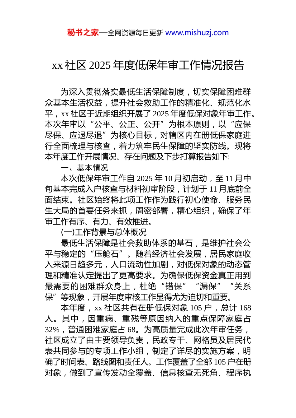 秘书之家—全网资源每日更新 www.mishuzj.comxx 社区 2025 年度低保年审工作情况报告为深入贯彻落实最低生活保障制度,切实保障困难群众基本生活权益,提升社会救助工作的精准化、规范化水平,xx 社区于近期组织开展了 2025 年度低保对象年审工作。本次年审以“公平、公正、公开”为根本原则,以“应保尽保、应退尽退”为核心目标,对辖区内在册低保家庭进行全面梳理与核查,着力筑牢民生保障的坚实防线。现将本年度工作开展情况、存在问题及下步打算报告如下:一、基本情况本次低保年审工作自 2025 年 10 月初启动,至 11 月中旬基本完成入户核查与材料初审阶段,计划于 11 月底前全面结束。社区始终将此项工作作为践行初心使命、服务民生大局的首要任务来抓,周密部署,精心组织,确保了年审工作有序、有力、有效推进。(一)工作背景与总体概况最低生活保障是社会救助体系的基石,是维护社会公平与稳定的“压舱石”。随着经济社会发展,居民家庭收入来源日趋多元,人口流动性加剧,对低保对象的动态管理和精准认定提出了更高要求。为确保低保资金真正用到最需要的困难群众身上,杜绝“错保”“漏保”“关系保”等现象,开展年度审核工作显得尤为迫切和重要。本年度,xx 社区共有在册低保对象 105 户,总计 168人。其中,因重病、重残等原因纳入的重点保障家庭占32%,普通困难家庭占 68。为高质量完成此次年审任务,社区成立了由主要领导负责,民政专干、网格员及居民代表共同参与的专项工作小组,制定了详尽的实施方案,明确了时间表、路线图和责任人。工作覆盖了全部 105 户在册对象,做到了宣传发动全覆盖、信息核查无死角、程序执秘书之家—全网资源每日更新 www.mishuzj.com行不走样。截至报告撰写之日,已完成入户核查 102 户,占比 97.1;收集并初审各类证明材料 300 余份,对初步核实的家庭情况已全部录入民政信息系统,为后续的民主评议与审批公示奠定了坚实基础。(二)主要工作措施与方法为确保年审工作深入、彻底、扎实,社区采取了多项务实举措,将工作做细做实。1.多渠道宣传动员,确保政策知晓无死角。年审工作启动之初,社区便构建了线上线下相结合的立体化宣传网络。线上,充分利用社区 6 个居民微信群,累计发布年审通知及政策解读信息 20 余条,覆盖居民超 3000人次,确保年轻及智能手机用户群体及时获取信息。线下在社区公告栏、各楼栋单元门口张贴正式书面通知 45 份;对于不熟悉线上操作的老年群体,工作人员采取“一对一”电话通知方式,累计拨打电话超过 200 通,详细告知年审时间、所需材料清单及注意事项。针对部分对政策存在疑问的居民,社区设立咨询窗口,累计接待现场咨询 50 余人次,发放《低保政策解读手册》150 余份,有效提高了政策的透明度和居民的配合度。2.精准化入户核查,确保信息采集无遗漏。入户核查是年审工作的核心环节。社区依托网格化管理体系,将核查任务分解至各网格,由网格员带队,组成核查小组。核查过程中,工作人员坚持“一看、二问、三查、四访”的工作方法。一看,即实地观察低保家庭的居住环境、生活设施、大件耐用消费品等,直观评估其生活水平;二问,即与家庭成员深入交谈,详细了解其家庭成员结构、健康状况、就业就学情况及家庭实际收支;三查,即仔细核对户口本、身份证、残疾证、病历诊断、收入证明房产证明等关键原始材料,确保信息真实准确;四访,即适当走访左邻右舍,从侧面了解低保家庭的日常消费情况和实际困难。针对 15 户因年老体弱、身患重病行动不便的低秘书之家—全网资源每日更新 www.mishuzj.com保对象,核查小组主动携带相关表格上门服务,在床边完成信息采集与材料核对,确保年审工作不漏一人、不缺一户。3.严格化评审程序,确保过程结果全公开。社区将“公平、公正、公开”原则贯穿于年审全过程。在完成初步核查后,社区组织召开了由“两委”成员、*员代表、居民代表、民政专干等 15 人组成的低保评审委员会会议。会上,核查小组逐一汇报每户家庭的核查情况,委员会成员依据政策标准,对家庭人口、收入和财产状况进行集体研判和综合评议,初步提出保留、增减...