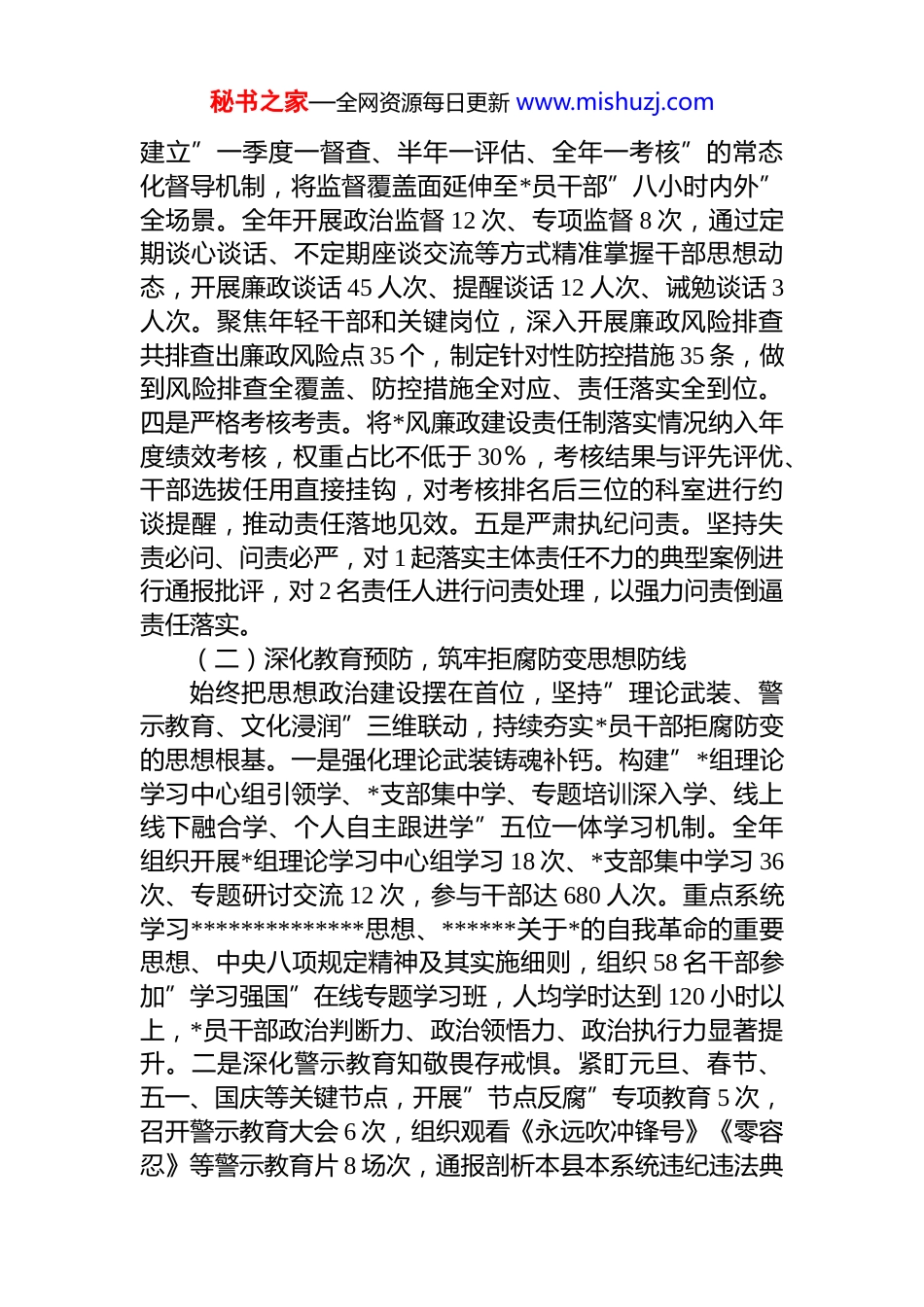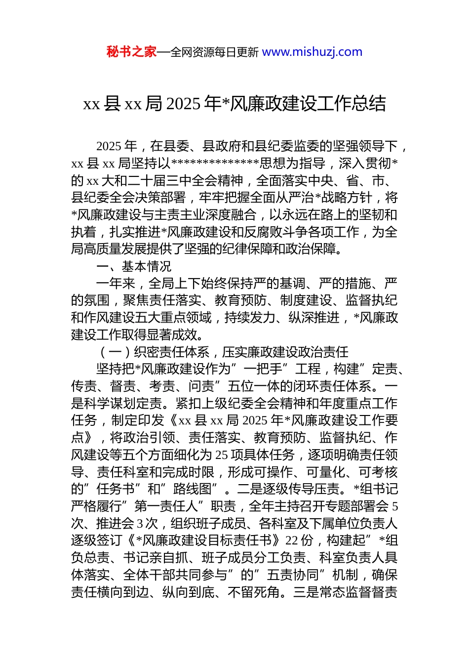 秘书之家—全网资源每日更新 www.mishuzj.comxx 县 xx 局 2025 年*风廉政建设工作总结2025 年,在县委、县政府和县纪委监委的坚强领导下,xx 县 xx 局坚持以**************思想为指导,深入贯彻*的 xx 大和二十届三中全会精神,全面落实中央、省、市、县纪委全会决策部署,牢牢把握全面从严治*战略方针,将*风廉政建设与主责主业深度融合,以永远在路上的坚韧和执着,扎实推进*风廉政建设和反腐败斗争各项工作,为全局高质量发展提供了坚强的纪律保障和政治保障。一、基本情况一年来,全局上下始终保持严的基调、严的措施、严的氛围,聚焦责任落实、教育预防、制度建设、监督执纪和作风建设五大重点领域,持续发力、纵深推进,*风廉政建设工作取得显著成效。(一)织密责任体系,压实廉政建设政治责任坚持把*风廉政建设作为”一把手”工程,构建”定责、传责、督责、考责、问责”五位一体的闭环责任体系。一是科学谋划定责。紧扣上级纪委全会精神和年度重点工作任务,制定印发《xx 县 xx 局 2025 年*风廉政建设工作要点》,将政治引领、责任落实、教育预防、监督执纪、作风建设等五个方面细化为 25 项具体任务,逐项明确责任领导、责任科室和完成时限,形成可操作、可量化、可考核的”任务书”和”路线图”。二是逐级传导压责。*组书记严格履行”第一责任人”职责,全年主持召开专题部署会 5次、推进会 3 次,组织班子成员、各科室及下属单位负责人逐级签订《*风廉政建设目标责任书》22 份,构建起”*组负总责、书记亲自抓、班子成员分工负责、科室负责人具体落实、全体干部共同参与”的”五责协同”机制,确保责任横向到边、纵向到底、不留死角。三是常态监督督责秘书之家—全网资源每日更新 www.mishuzj.com建立”一季度一督查、半年一评估、全年一考核”的常态化督导机制,将监督覆盖面延伸至*员干部”八小时内外”全场景。全年开展政治监督 12 次、专项监督 8 次,通过定期谈心谈话、不定期座谈交流等方式精准掌握干部思想动态,开展廉政谈话 45 人次、提醒谈话 12 人次、诫勉谈话 3人次。聚焦年轻干部和关键岗位,深入开展廉政风险排查共排查出廉政风险点 35 个,制定针对性防控措施 35 条,做到风险排查全覆盖、防控措施全对应、责任落实全到位。四是严格考核考责。将*风廉政建设责任制落实情况纳入年度绩效考核,权重占比不低于 30%,考核结果与评先评优、干部选拔任用直接挂钩,对考核排名后三位的科室进行约谈提醒,推动责任落地见效。五是严肃执纪问责。坚持失责必问、问责必严,对 1 起落实主体责任不力的典型案例进行通报批评,对 2 名责任人进行问责处理,以强力问责倒逼责任落实。(二)深化教育预防,筑牢拒腐防变思想防线始终把思想政治建设摆在首位,坚持”理论武装、警示教育、文化浸润”三维联动,持续夯实*员干部拒腐防变的思想根基。一是强化理论武装铸魂补钙。构建”*组理论学习中心组引领学、*支部集中学、专题培训深入学、线上线下融合学、个人自主跟进学”五位一体学习机制。全年组织开展*组理论学习中心组学习 18 次、*支部集中学习 36次、专题研讨交流 12 次,参与干部达 680 人次。重点系统学习**************思想、******关于*的自我革命的重要思想、中央八项规定精神及其实施细则,组织 58 名干部参加”学习强国”在线专题学习班,人均学时达到 120 小时以上,*员干部政治判断力、政治领悟力、政治执行力显著提升。二是深化警示教育知敬畏存戒惧。紧盯元旦、春节、五一、国庆等关键节点,开展”节点反腐”专项教育 5 次,召开警示教育大会 6 次,组织观看《永远吹冲锋号》《零容忍》等警示教育片 8 场次,通报剖析本县本系统违纪违法典秘书之家—全网资源每日更新 www.mishuzj.com型案例 15 起。组织*员干部赴县廉政教育基地开展现场教学4 次,旁听法院庭审 2 次,到监狱开展警示教育活动 1 次,签订廉政承诺书 56 份、家庭助廉承诺书 56 份,实现以案示警、以案明纪、以案促改,让*员干部知敬畏、存戒惧、守底线。三是厚植廉洁文化涵养清风正气。充分挖掘本地红色资源和...