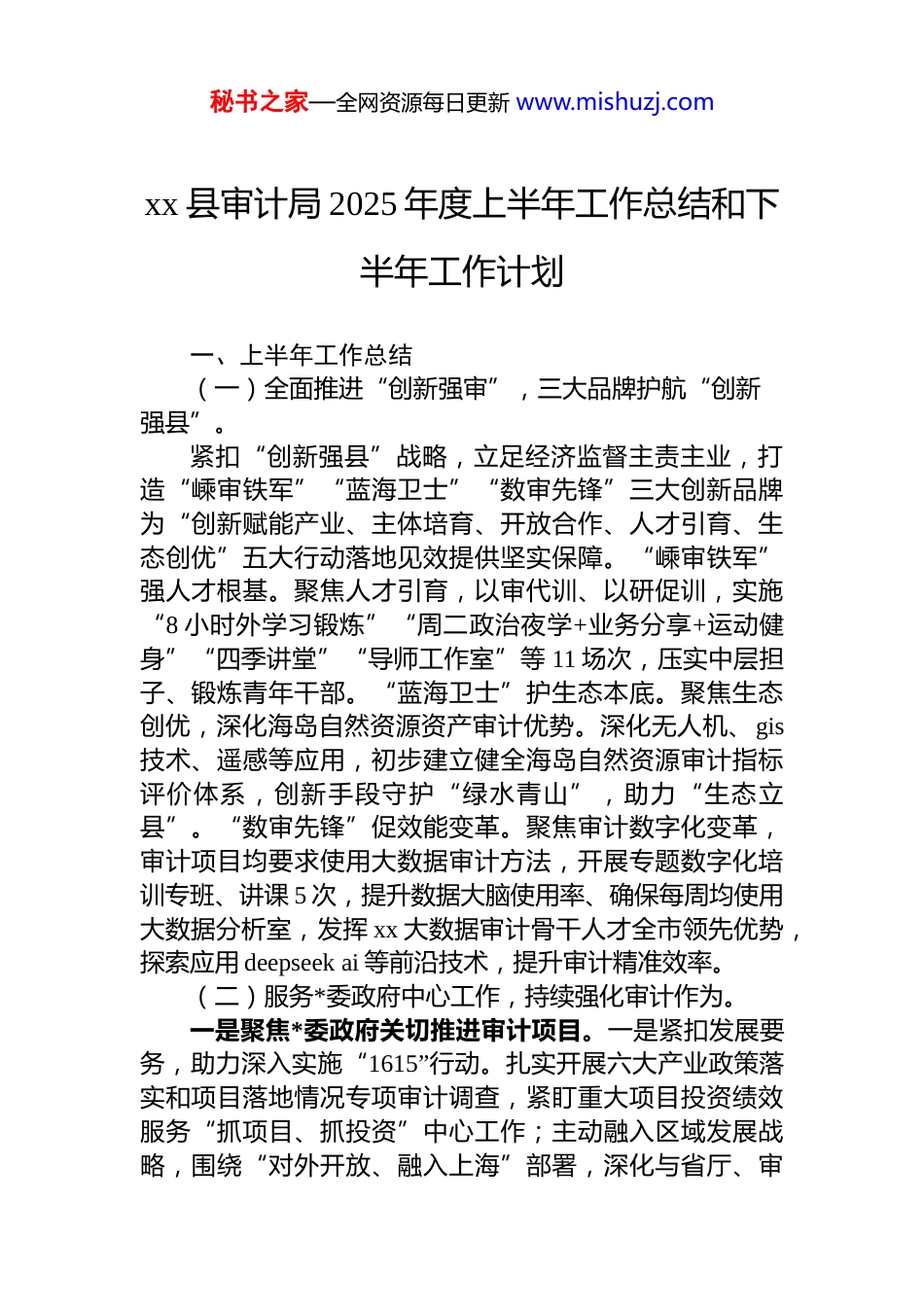 秘书之家—全网资源每日更新 www.mishuzj.comxx 县审计局 2025 年度上半年工作总结和下半年工作计划一、上半年工作总结(一)全面推进“创新强审”,三大品牌护航“创新强县”。紧扣“创新强县”战略,立足经济监督主责主业,打造“嵊审铁军”“蓝海卫士”“数审先锋”三大创新品牌为“创新赋能产业、主体培育、开放合作、人才引育、生态创优”五大行动落地见效提供坚实保障。“嵊审铁军”强人才根基。聚焦人才引育,以审代训、以研促训,实施“8 小时外学习锻炼”“周二政治夜学+业务分享+运动健身”“四季讲堂”“导师工作室”等 11 场次,压实中层担子、锻炼青年干部。“蓝海卫士”护生态本底。聚焦生态创优,深化海岛自然资源资产审计优势。深化无人机、gis技术、遥感等应用,初步建立健全海岛自然资源审计指标评价体系,创新手段守护“绿水青山”,助力“生态立县”。“数审先锋”促效能变革。聚焦审计数字化变革,审计项目均要求使用大数据审计方法,开展专题数字化培训专班、讲课 5 次,提升数据大脑使用率、确保每周均使用大数据分析室,发挥 xx 大数据审计骨干人才全市领先优势,探索应用 deepseek ai 等前沿技术,提升审计精准效率。(二)服务*委政府中心工作,持续强化审计作为。一是聚焦*委政府关切推进审计项目。一是紧扣发展要务,助力深入实施“1615”行动。扎实开展六大产业政策落实和项目落地情况专项审计调查,紧盯重大项目投资绩效服务“抓项目、抓投资”中心工作;主动融入区域发展战略,围绕“对外开放、融入上海”部署,深化与省厅、审秘书之家—全网资源每日更新 www.mishuzj.com计署驻上海办等对接,协调涉嵊项目审计监督,已完成全省高质量发展专项审计调查、全省中小学教育资源资金配置情况专项审计调查配合协同。二是着眼城乡协调,助推融合高质量发展。深化财政“同级审”,查实管理不规范金额 1.84 亿元,发现金额类和非金额类问题各 8 项,重点关注财政资源统筹配置效率;聚焦农业农村发展短板和城镇环境治理难点,强化对城镇垃圾处理等关键环节的审计查实管理不规范金额 122 万元,发现金额类 5 项和非金额类问题 11 项,服务城乡一体化建设。三是护航改革深化。完成交投审计,查实管理不规范金额 234 万、损失浪费 20 万,发现金额类 8 项和非金额类问题 13 项,推动出台《国有企业总审计师制度试点工作实施方案》,强化国企现代化改革、国企审委会改革、内部审计监督深化,服务国企提质增效。二是全力配合完成重点专班任务。完成蓝湾生态修复项目全过程审计咨询服务等 5 项重点专班工作或临时性紧急任务。聚焦蓝湾生态修复项目,参加全县例会 2 次、主动督导 2 次,提供系列审计建议,嵌入式实施全过程审计咨询服务;深入推进招投标领域治理改革,完成专班部署工作在各审计项目中重点关注招投标,着力规范市场秩序;扎实开展拖欠企业款项清理核查工作,积极助力优化营商环境,缓解企业资金压力;配合巡察全职抽调 1 名副科级干部,临时增派 1 个审计组 3 人协助巡察殡葬领域改革巡察工作;对县内重大民生工程人民医院新建扩建项目提供及时专业审计咨询服务,强化项目前期跟踪监督。三是大力推进各类监督贯通协同。深化审计监督与人大监督的全方位贯通协同,配合人大专题调研 2 次,做好审计工作报告与人大沟通协调,研究出台审计查出问题整改建立人大财经监督与审计监督贯通协调工作机制。贯彻特约审计员制度,开展县委统战部县审计局第一届特约审计员签约仪式,特聘 2 名民主*派人士参与审计监督。发挥全市首创的审计财会监督协同优势,紧盯“过紧日子”对全县各部门强化协同监督秘书之家—全网资源每日更新 www.mishuzj.com部署全县非税收入彻查专项行动。加强与检察公益诉讼贯通协同,开展碰头会 1 次,在自然资源和生态领域服务保障“生态立县”首位战略。履行反腐败领导小组成员单位职能,强化审计监督执法力度,从严做好审计线索移送,上半年移送纪检监察部门、业务主管部门案件线索 3 条。(三)加强*的全面领导,审计监督保障从严治*。履行议事协调机构职能。协助召开十四届县委...