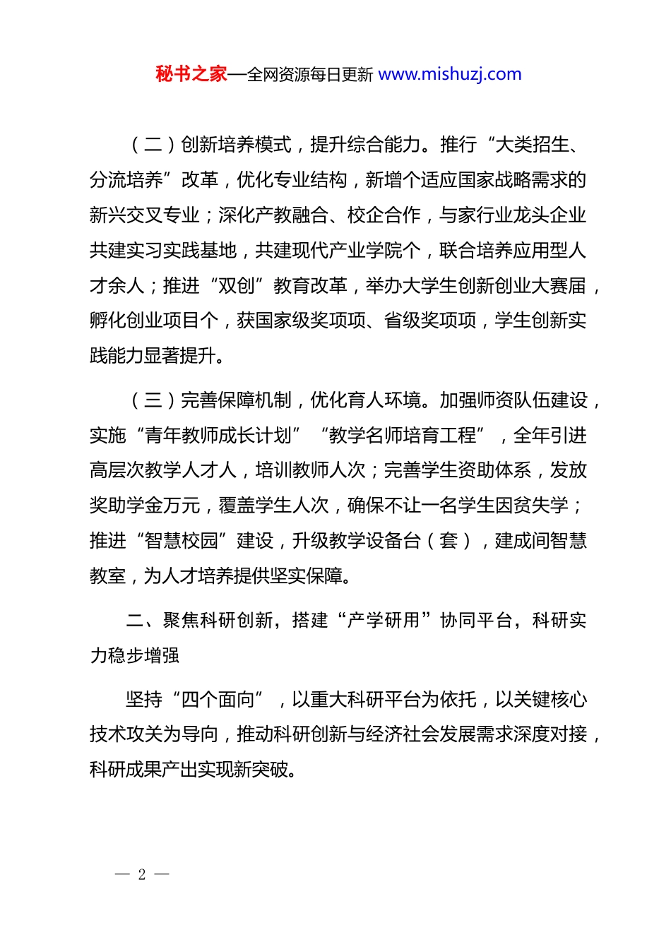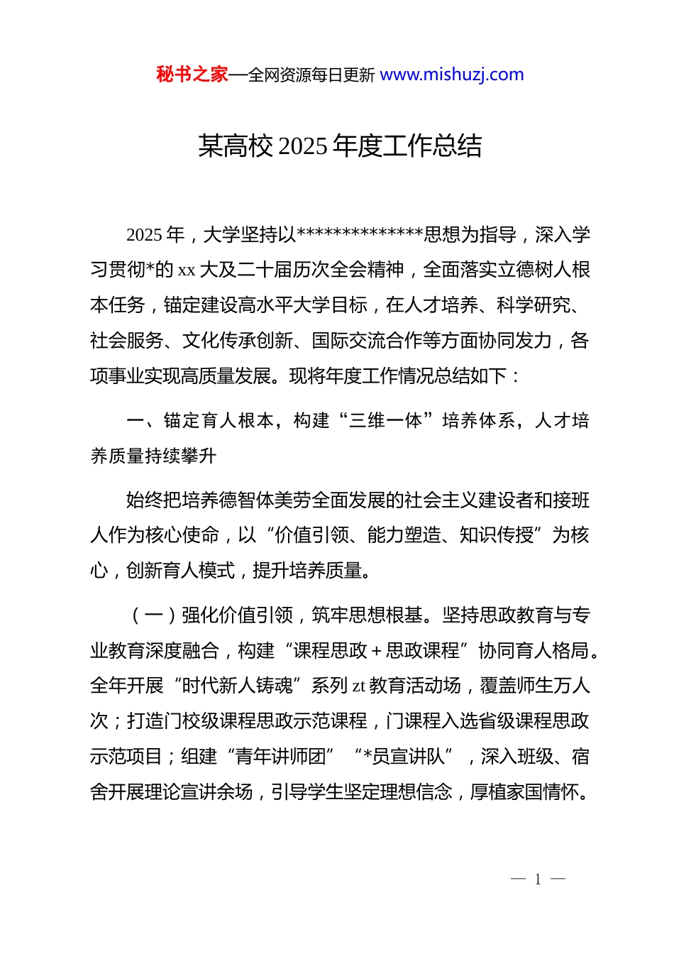 秘书之家—全网资源每日更新 www.mishuzj.com某高校 2025 年度工作总结2025 年,大学坚持以**************思想为指导,深入学习贯彻*的 xx 大及二十届历次全会精神,全面落实立德树人根本任务,锚定建设高水平大学目标,在人才培养、科学研究、社会服务、文化传承创新、国际交流合作等方面协同发力,各项事业实现高质量发展。现将年度工作情况总结如下:一、锚定育人根本,构建“三维一体”培养体系,人才培养质量持续攀升始终把培养德智体美劳全面发展的社会主义建设者和接班人作为核心使命,以“价值引领、能力塑造、知识传授”为核心,创新育人模式,提升培养质量。(一)强化价值引领,筑牢思想根基。坚持思政教育与专业教育深度融合,构建“课程思政+思政课程”协同育人格局。全年开展“时代新人铸魂”系列 zt 教育活动场,覆盖师生万人次;打造门校级课程思政示范课程,门课程入选省级课程思政示范项目;组建“青年讲师团”“*员宣讲队”,深入班级、宿舍开展理论宣讲余场,引导学生坚定理想信念,厚植家国情怀。— 1 —秘书之家—全网资源每日更新 www.mishuzj.com(二)创新培养模式,提升综合能力。推行“大类招生、分流培养”改革,优化专业结构,新增个适应国家战略需求的新兴交叉专业;深化产教融合、校企合作,与家行业龙头企业共建实习实践基地,共建现代产业学院个,联合培养应用型人才余人;推进“双创”教育改革,举办大学生创新创业大赛届,孵化创业项目个,获国家级奖项项、省级奖项项,学生创新实践能力显著提升。(三)完善保障机制,优化育人环境。加强师资队伍建设,实施“青年教师成长计划”“教学名师培育工程”,全年引进高层次教学人才人,培训教师人次;完善学生资助体系,发放奖助学金万元,覆盖学生人次,确保不让一名学生因贫失学;推进“智慧校园”建设,升级教学设备台(套),建成间智慧教室,为人才培养提供坚实保障。二、聚焦科研创新,搭建“产学研用”协同平台,科研实力稳步增强坚持“四个面向”,以重大科研平台为依托,以关键核心技术攻关为导向,推动科研创新与经济社会发展需求深度对接,科研成果产出实现新突破。— 2 —秘书之家—全网资源每日更新 www.mishuzj.com(一)建强科研平台,汇聚创新资源。新增个省级重点实验室、个省级工程技术研究中心,获批个国家级科研平台培育项目;优化科研资源配置,整合学科优势力量,组建个交叉学科研究团队,围绕人工智能、生物医药、新材料等领域开展协同创新,全年科研经费到账亿元,同比增长%。(二)主攻关键领域,突破技术瓶颈。聚焦国家重大战略需求和区域经济发展痛点,承担国家级科研项目项(其中重大重点项目项)、省部级科研项目项;在等领域取得一批标志性成果,发表高水平学术论文篇(其中 sci/ei 收录篇),获得国家发明专利授权项,项成果获省部级科技奖励。(三)深化成果转化,服务社会发展。建立健全科技成果转化机制,与地方政府、企业签订合作协议项,技术合同成交额达亿元;选派名专家学者深入基层、企业开展技术指导和服务,助力地方产业升级和乡村振兴;依托学校智库平台,提交政策咨询报告份,份获省部级以上领导批示,为政府决策提供智力支持。三、坚持引育并举,打造“德才兼备”师资队伍,人才支撑作用凸显— 3 —秘书之家—全网资源每日更新 www.mishuzj.com把师资队伍建设作为学校发展的核心战略,坚持“引才、育才、用才、留才”多措并举,着力打造一支政治素质过硬、业务能力精湛、育人水平高超的教师队伍。(一)精准引才,汇聚高端智力。实施“顶尖人才引育计划”“青年英才集聚计划”,全年引进国家级人才人、省部级人才人、青年博士人;通过“柔性引才”方式,聘请国内外知名专家学者人担任兼职教授、讲座教授,为学科建设和科研创新注入新活力。(二)系统育才,提升综合素养。完善教师培养培训体系开展新教师岗前培训、青年教师教学能力提升培训、骨干教师研修等各类培训场次,覆盖教师人次;选派名教师赴国内外知名高校、科研机构访学交流,支持名教师参与国家级、省部级学术会议,教师专业能力和学术水平持续提升。(三)优化机制...