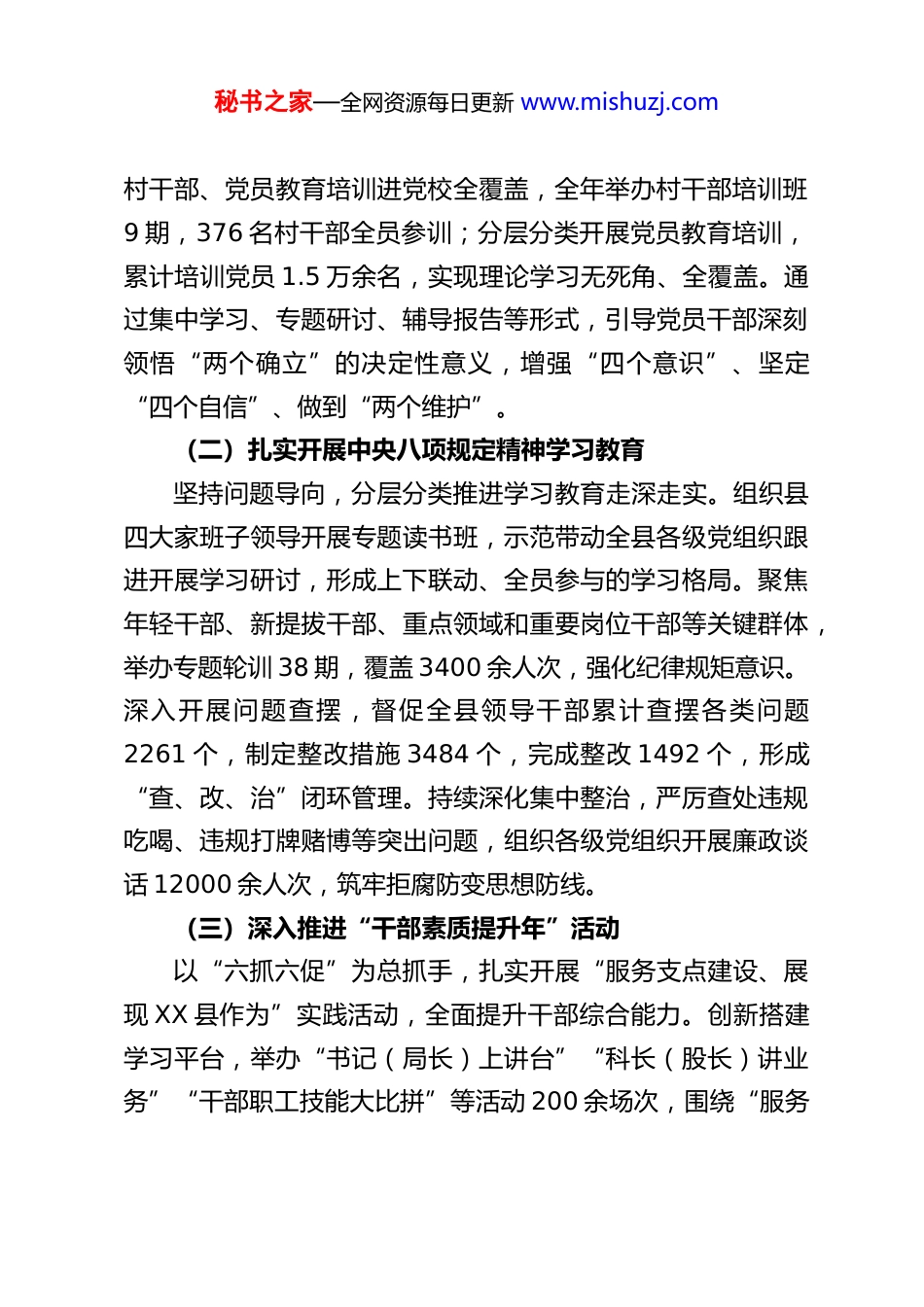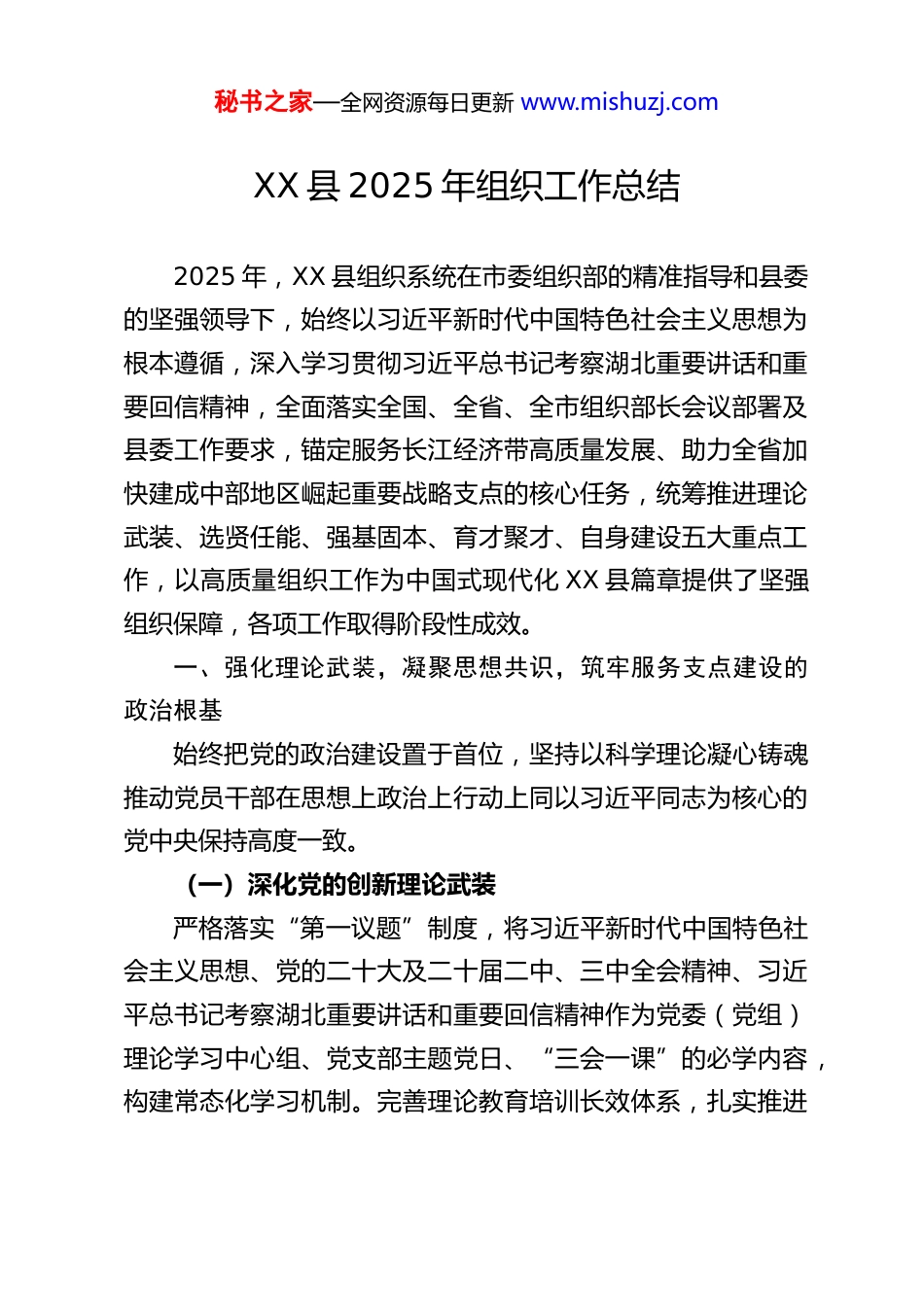 秘书之家—全网资源每日更新 www.mishuzj.comXX 县 2025 年组织工作总结2025 年,XX 县组织系统在市委组织部的精准指导和县委的坚强领导下,始终以习近平新时代中国特色社会主义思想为根本遵循,深入学习贯彻习近平总书记考察湖北重要讲话和重要回信精神,全面落实全国、全省、全市组织部长会议部署及县委工作要求,锚定服务长江经济带高质量发展、助力全省加快建成中部地区崛起重要战略支点的核心任务,统筹推进理论武装、选贤任能、强基固本、育才聚才、自身建设五大重点工作,以高质量组织工作为中国式现代化 XX 县篇章提供了坚强组织保障,各项工作取得阶段性成效。一、强化理论武装,凝聚思想共识,筑牢服务支点建设的政治根基始终把党的政治建设置于首位,坚持以科学理论凝心铸魂推动党员干部在思想上政治上行动上同以习近平同志为核心的党中央保持高度一致。(一)深化党的创新理论武装严格落实“第一议题”制度,将习近平新时代中国特色社会主义思想、党的二十大及二十届二中、三中全会精神、习近平总书记考察湖北重要讲话和重要回信精神作为党委(党组)理论学习中心组、党支部主题党日、“三会一课”的必学内容,构建常态化学习机制。完善理论教育培训长效体系,扎实推进秘书之家—全网资源每日更新 www.mishuzj.com村干部、党员教育培训进党校全覆盖,全年举办村干部培训班9 期,376 名村干部全员参训;分层分类开展党员教育培训,累计培训党员 1.5 万余名,实现理论学习无死角、全覆盖。通过集中学习、专题研讨、辅导报告等形式,引导党员干部深刻领悟“两个确立”的决定性意义,增强“四个意识”、坚定“四个自信”、做到“两个维护”。(二)扎实开展中央八项规定精神学习教育坚持问题导向,分层分类推进学习教育走深走实。组织县四大家班子领导开展专题读书班,示范带动全县各级党组织跟进开展学习研讨,形成上下联动、全员参与的学习格局。聚焦年轻干部、新提拔干部、重点领域和重要岗位干部等关键群体,举办专题轮训 38 期,覆盖 3400 余人次,强化纪律规矩意识。深入开展问题查摆,督促全县领导干部累计查摆各类问题2261 个,制定整改措施 3484 个,完成整改 1492 个,形成“查、改、治”闭环管理。持续深化集中整治,严厉查处违规吃喝、违规打牌赌博等突出问题,组织各级党组织开展廉政谈话 12000 余人次,筑牢拒腐防变思想防线。(三)深入推进“干部素质提升年”活动以“六抓六促”为总抓手,扎实开展“服务支点建设、展现 XX 县作为”实践活动,全面提升干部综合能力。创新搭建学习平台,举办“书记(局长)上讲台”“科长(股长)讲业务”“干部职工技能大比拼”等活动 200 余场次,围绕“服务秘书之家—全网资源每日更新 www.mishuzj.com建成支点、建设大山里的深圳”等核心主题开展集中研讨 80余期,推动干部互学互鉴、共同提升。聚焦数字经济、“两山”转化等前沿领域和重点工作,精准邀请清华大学、湖北中医药大学等高校专家来房授课 13 次,邀请湖北永业行、县属国企负责人开展业务培训 9 期,有效开拓干部视野、提升专业思维。县委常委、组织部长王斌带头深入门古寺镇讲授专题党课,带动各级领导干部上讲台、讲政策、传经验,营造比学赶超的浓厚氛围。二、夯实基层基础,建强战斗堡垒,巩固服务支点建设的组织支撑坚持大抓基层的鲜明导向,以提升政治功能和组织功能为核心,推动基层党组织全面进步、全面过硬,为县域发展筑牢根基。(一)压实党建责任,健全工作体系充分发挥县委党建工作领导小组议事协调作用,全年召开基层党建工作专题会议 3 次,研究部署重点任务、破解难点问题。制定县委和县委常委同志 2025 年落实全面从严治党主体责任清单,严格落实抓基层党建“三个一”制度,构建权责清晰、齐抓共管的党建工作格局。扎实推进 2024 年度省市党建述职评议会议点评问题整改,建立整改台账、实行销号管理,推动各级党组织党建责任上肩、压力传导到位。全年先后迎接省委常委、组织部长,市委常委、组织部长来房调研指导,县秘书之家—全网资源每日更新 www.mishuzj.com委书记谢晓鸣署名文章《增强基层...