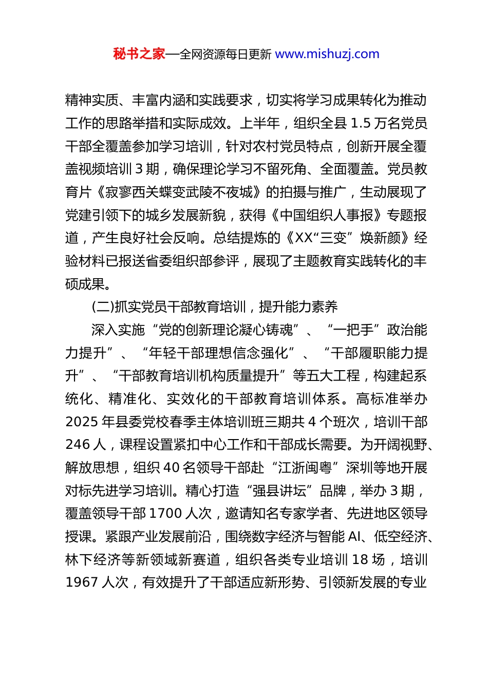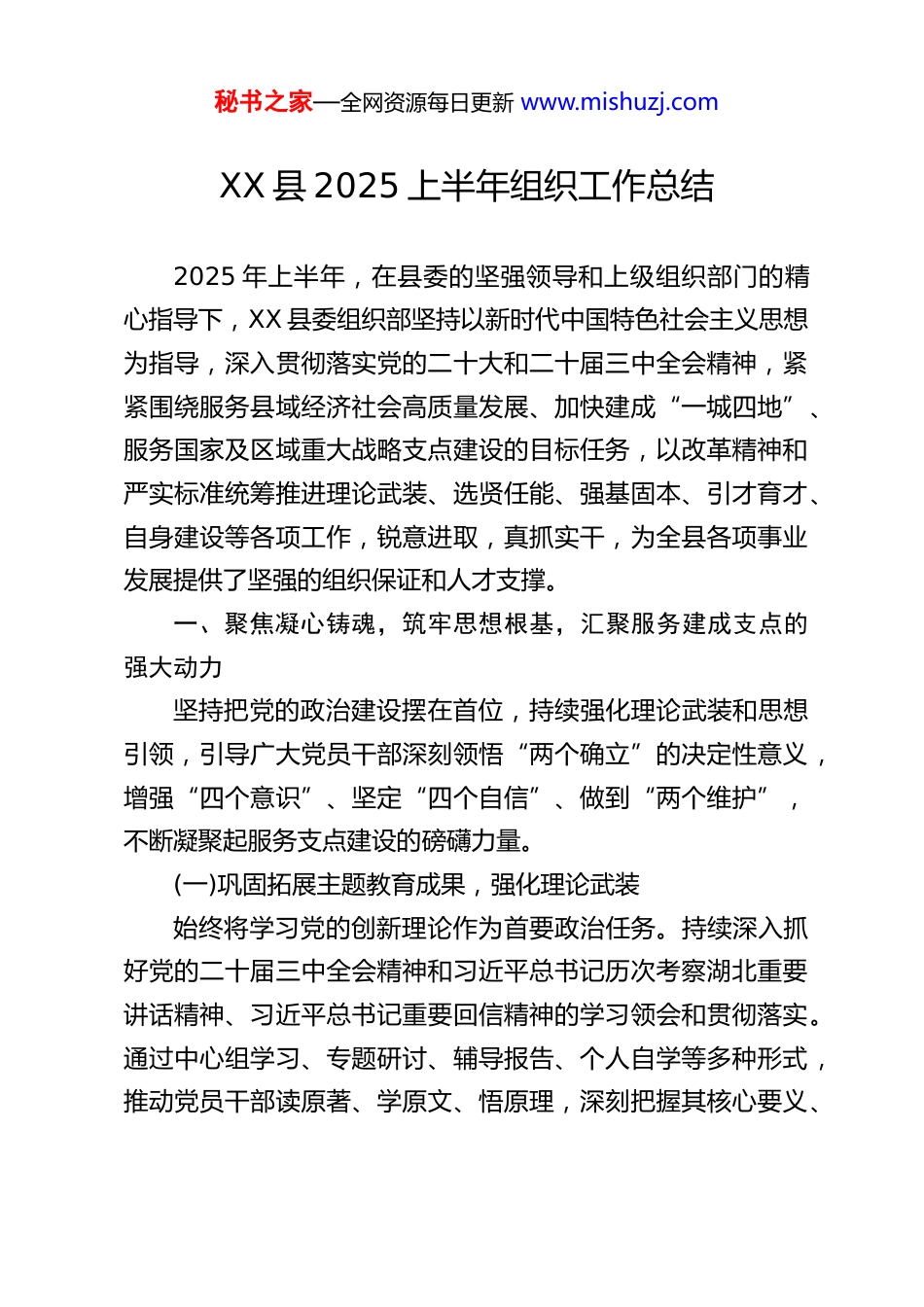 秘书之家—全网资源每日更新 www.mishuzj.comXX 县 2025 上半年组织工作总结2025 年上半年,在县委的坚强领导和上级组织部门的精心指导下,XX 县委组织部坚持以新时代中国特色社会主义思想为指导,深入贯彻落实党的二十大和二十届三中全会精神,紧紧围绕服务县域经济社会高质量发展、加快建成“一城四地”、服务国家及区域重大战略支点建设的目标任务,以改革精神和严实标准统筹推进理论武装、选贤任能、强基固本、引才育才、自身建设等各项工作,锐意进取,真抓实干,为全县各项事业发展提供了坚强的组织保证和人才支撑。一、聚焦凝心铸魂,筑牢思想根基,汇聚服务建成支点的强大动力坚持把党的政治建设摆在首位,持续强化理论武装和思想引领,引导广大党员干部深刻领悟“两个确立”的决定性意义,增强“四个意识”、坚定“四个自信”、做到“两个维护”,不断凝聚起服务支点建设的磅礴力量。(一)巩固拓展主题教育成果,强化理论武装始终将学习党的创新理论作为首要政治任务。持续深入抓好党的二十届三中全会精神和习近平总书记历次考察湖北重要讲话精神、习近平总书记重要回信精神的学习领会和贯彻落实。通过中心组学习、专题研讨、辅导报告、个人自学等多种形式,推动党员干部读原著、学原文、悟原理,深刻把握其核心要义、秘书之家—全网资源每日更新 www.mishuzj.com精神实质、丰富内涵和实践要求,切实将学习成果转化为推动工作的思路举措和实际成效。上半年,组织全县 1.5 万名党员干部全覆盖参加学习培训,针对农村党员特点,创新开展全覆盖视频培训 3 期,确保理论学习不留死角、全面覆盖。党员教育片《寂寥西关蝶变武陵不夜城》的拍摄与推广,生动展现了党建引领下的城乡发展新貌,获得《中国组织人事报》专题报道,产生良好社会反响。总结提炼的《XX“三变”焕新颜》经验材料已报送省委组织部参评,展现了主题教育实践转化的丰硕成果。(二)抓实党员干部教育培训,提升能力素养深入实施“党的创新理论凝心铸魂”、“一把手”政治能力提升”、“年轻干部理想信念强化”、“干部履职能力提升”、“干部教育培训机构质量提升”等五大工程,构建起系统化、精准化、实效化的干部教育培训体系。高标准举办2025 年县委党校春季主体培训班三期共 4 个班次,培训干部246 人,课程设置紧扣中心工作和干部成长需要。为开阔视野、解放思想,组织 40 名领导干部赴“江浙闽粤”深圳等地开展对标先进学习培训。精心打造“强县讲坛”品牌,举办 3 期,覆盖领导干部 1700 人次,邀请知名专家学者、先进地区领导授课。紧跟产业发展前沿,围绕数字经济与智能 AI、低空经济、林下经济等新领域新赛道,组织各类专业培训 18 场,培训1967 人次,有效提升了干部适应新形势、引领新发展的专业秘书之家—全网资源每日更新 www.mishuzj.com能力。创新创办“武陵组工”写作营,组织 251 名组工干部常态化开展信息写作、调查研究等练兵活动,着力提升以文辅政水平。相关工作经验《湖北 XX 县:党员春训助力“支点建设”》获《中国组织人事报》推介。(三)推动学习教育走深走实,严明纪律规矩将纪律教育和作风建设贯穿始终。深入开展中央八项规定及其实施细则精神再学习、再落实,县委带头召开专题学习研究会 8 次,县“四大家”领导班子以身作则,带头查摆问题 32条,示范带动全县 530 名乡镇和县直单位领导班子成员深刻开展自我剖析,754 个基层党组织开展全覆盖学习研讨,举办专题轮训 9 期 1141 人次,推动纪律规矩内化于心、外化于行。坚持严的基调不动摇,出台“整治违规吃喝十条”硬措施,重拳整治“吃喝风”,上半年查处违规吃喝问题 5 起,给予党纪政务处分 7 人;同时,严肃查处酒驾醉驾问题 23 起,处分 16人,持续释放越往后执纪越严的强烈信号。深化以案为鉴、以案促改,组织全县党员干部 1 万余人次参观警示教育基地,用身边事教育身边人,引导党员干部知敬畏、存戒惧、守底线。二、聚焦选育管用,树立鲜明导向,锻造服务建成支点的骨干力量坚持党管干部原则,落实新时代好干部标准,树立重实干重实绩、重担当的鲜明用人导向,着力建设...