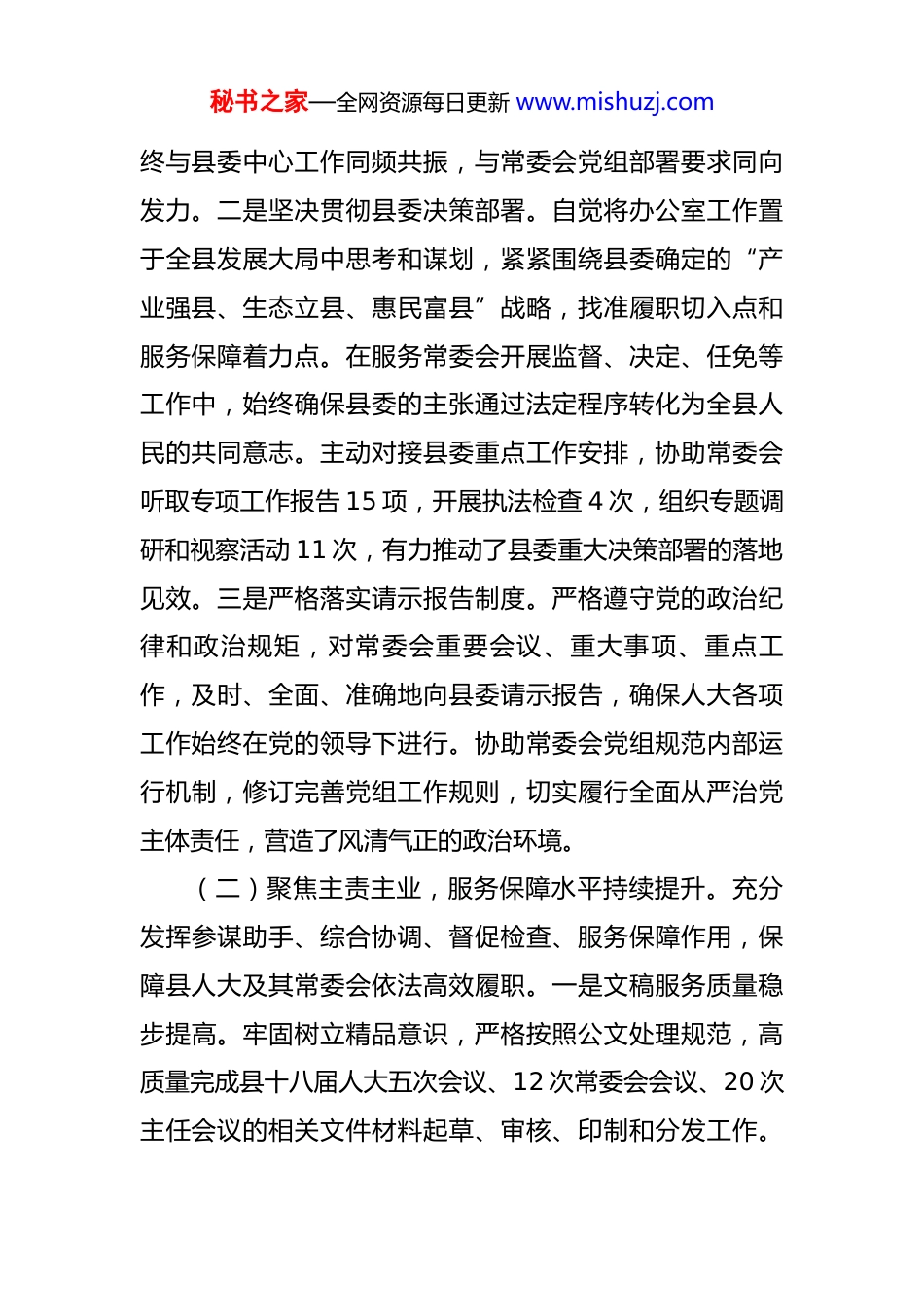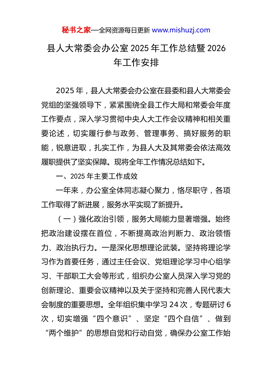 秘书之家—全网资源每日更新 www.mishuzj.com县人大常委会办公室 2025 年工作总结暨 2026年工作安排 2025 年,县人大常委会办公室在县委和县人大常委会党组的坚强领导下,紧紧围绕全县工作大局和常委会年度工作要点,深入学习贯彻中央人大工作会议精神和相关重要论述,切实履行参与政务、管理事务、搞好服务的职能,锐意进取,扎实工作,为县人大及其常委会依法高效履职提供了坚实保障。现将全年工作情况总结如下。一、2025 年主要工作成效一年来,办公室全体同志凝心聚力,恪尽职守,各项工作取得了新进展,服务水平实现了新提升。(一)强化政治引领,服务大局能力显著增强。始终把政治建设摆在首位,不断提高政治判断力、政治领悟力、政治执行力。一是深化思想理论武装。坚持将理论学习作为首要任务,通过主任会议、党组理论学习中心组学习、干部职工大会等形式,组织办公室人员深入学习党的创新理论、重要会议精神以及关于坚持和完善人民代表大会制度的重要思想。全年组织集中学习 24 次,专题研讨 6次,切实增强“四个意识”、坚定“四个自信”、做到“两个维护”的思想自觉和行动自觉,确保办公室工作始秘书之家—全网资源每日更新 www.mishuzj.com终与县委中心工作同频共振,与常委会党组部署要求同向发力。二是坚决贯彻县委决策部署。自觉将办公室工作置于全县发展大局中思考和谋划,紧紧围绕县委确定的“产业强县、生态立县、惠民富县”战略,找准履职切入点和服务保障着力点。在服务常委会开展监督、决定、任免等工作中,始终确保县委的主张通过法定程序转化为全县人民的共同意志。主动对接县委重点工作安排,协助常委会听取专项工作报告 15 项,开展执法检查 4 次,组织专题调研和视察活动 11 次,有力推动了县委重大决策部署的落地见效。三是严格落实请示报告制度。严格遵守党的政治纪律和政治规矩,对常委会重要会议、重大事项、重点工作,及时、全面、准确地向县委请示报告,确保人大各项工作始终在党的领导下进行。协助常委会党组规范内部运行机制,修订完善党组工作规则,切实履行全面从严治党主体责任,营造了风清气正的政治环境。(二)聚焦主责主业,服务保障水平持续提升。充分发挥参谋助手、综合协调、督促检查、服务保障作用,保障县人大及其常委会依法高效履职。一是文稿服务质量稳步提高。牢固树立精品意识,严格按照公文处理规范,高质量完成县十八届人大五次会议、12 次常委会会议、20 次主任会议的相关文件材料起草、审核、印制和分发工作。秘书之家—全网资源每日更新 www.mishuzj.com全年共起草、审核各类工作报告、决议决定、审议意见、领导讲话、通知函件等文稿 380 余份,约 120 万字。文稿做到了观点鲜明、逻辑严谨、文字精炼、符合规范,有效传达了常委会的决策意图。二是会议服务保障精细有序。坚持周密筹划、精心组织、责任到人,圆满完成了县十八届人大五次会议的各项服务保障工作。高标准做好常委会会议、主任会议的服务工作,优化会议流程,细化会场布置、材料分发、录音录像、食宿交通等环节,确保会议零差错、零失误。全年服务保障各类会议 40 余场次,参会人员达 1800 余人次,会议组织工作得到与会代表和委员的充分肯定。三是协调联络高效畅通。积极做好与县委办、县政府办、县政协办以及各乡镇(街道)人大、县直各部门的沟通协调,确保信息上传下达准确及时,工作衔接顺畅有序。加强与上级人大办公室的联系,争取工作指导。认真做好代表联络服务工作,协助代表小组开展活动,畅通代表知情知政途径。全年处理各类来文来电 2100 余件,安排协调重要公务活动 150 余次,做到了承上启下、联系左右、协调内外。四是调查研究深入扎实。围绕常委会审议议题和全县经济社会发展中的热点难点问题,办公室组织或参与开展了多项专题调研。形成了关于优化营商环境、乡村振兴示范建设、基础教育优质均衡发展、民生实事项秘书之家—全网资源每日更新 www.mishuzj.com目落实情况等高质量调研报告 8 篇,为常委会审议决策提供了有益参考。调研报告所反映的部分问题和建议,已转化为常委会的审议意见,交由县政府研...