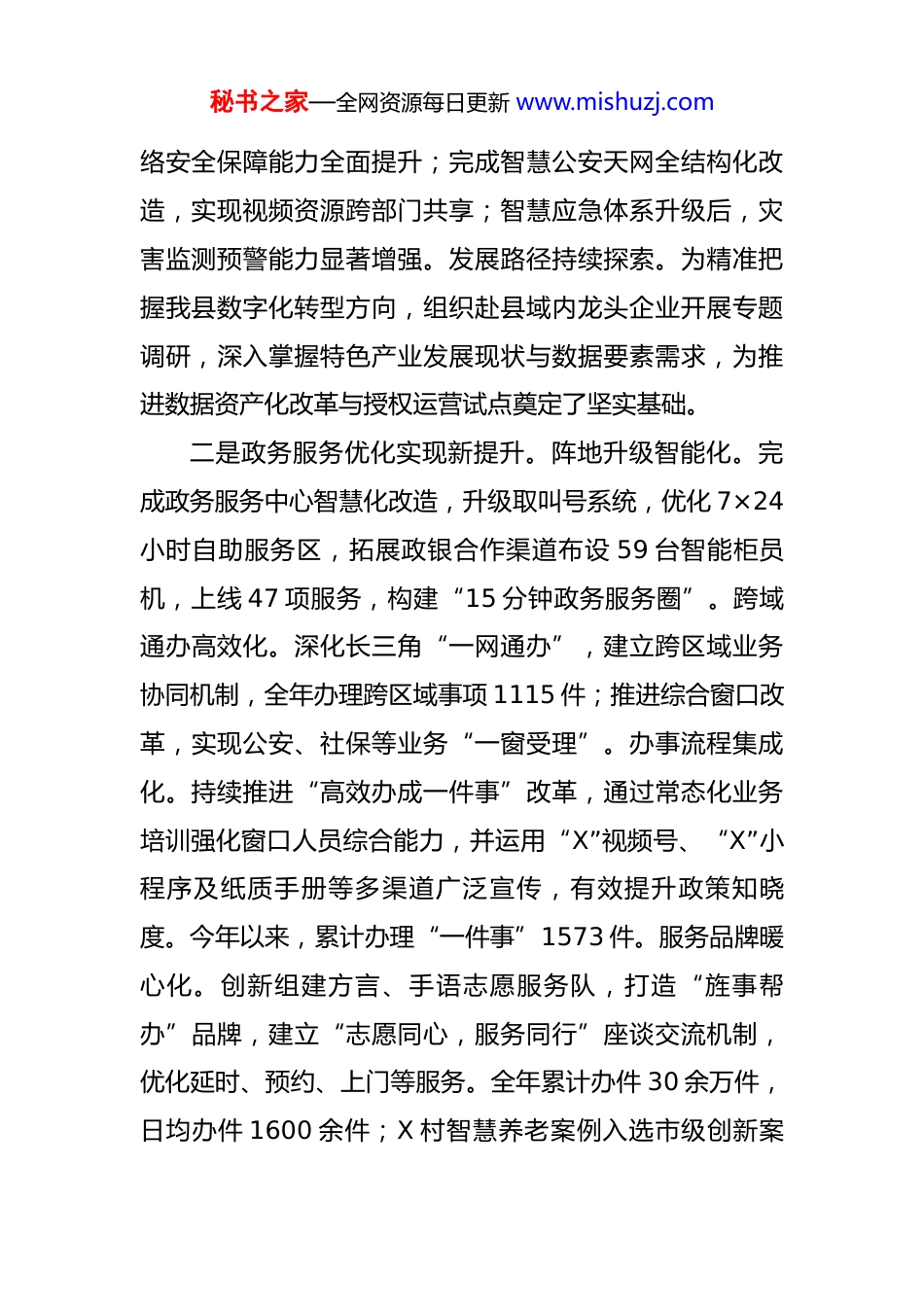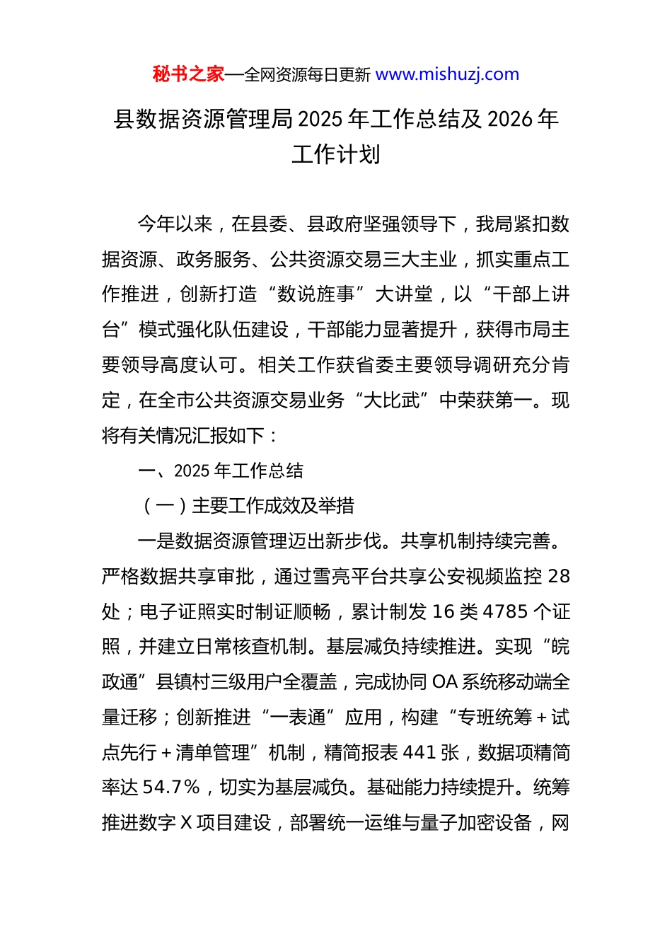 秘书之家—全网资源每日更新 www.mishuzj.com县数据资源管理局 2025 年工作总结及 2026 年工作计划 今年以来,在县委、县政府坚强领导下,我局紧扣数据资源、政务服务、公共资源交易三大主业,抓实重点工作推进,创新打造“数说旌事”大讲堂,以“干部上讲台”模式强化队伍建设,干部能力显著提升,获得市局主要领导高度认可。相关工作获省委主要领导调研充分肯定,在全市公共资源交易业务“大比武”中荣获第一。现将有关情况汇报如下:一、2025 年工作总结(一)主要工作成效及举措一是数据资源管理迈出新步伐。共享机制持续完善。严格数据共享审批,通过雪亮平台共享公安视频监控 28处;电子证照实时制证顺畅,累计制发 16 类 4785 个证照,并建立日常核查机制。基层减负持续推进。实现“皖政通”县镇村三级用户全覆盖,完成协同 OA 系统移动端全量迁移;创新推进“一表通”应用,构建“专班统筹+试点先行+清单管理”机制,精简报表 441 张,数据项精简率达 54.7%,切实为基层减负。基础能力持续提升。统筹推进数字 X 项目建设,部署统一运维与量子加密设备,网秘书之家—全网资源每日更新 www.mishuzj.com络安全保障能力全面提升;完成智慧公安天网全结构化改造,实现视频资源跨部门共享;智慧应急体系升级后,灾害监测预警能力显著增强。发展路径持续探索。为精准把握我县数字化转型方向,组织赴县域内龙头企业开展专题调研,深入掌握特色产业发展现状与数据要素需求,为推进数据资产化改革与授权运营试点奠定了坚实基础。二是政务服务优化实现新提升。阵地升级智能化。完成政务服务中心智慧化改造,升级取叫号系统,优化 7×24小时自助服务区,拓展政银合作渠道布设 59 台智能柜员机,上线 47 项服务,构建“15 分钟政务服务圈”。跨域通办高效化。深化长三角“一网通办”,建立跨区域业务协同机制,全年办理跨区域事项 1115 件;推进综合窗口改革,实现公安、社保等业务“一窗受理”。办事流程集成化。持续推进“高效办成一件事”改革,通过常态化业务培训强化窗口人员综合能力,并运用“X”视频号、“X”小程序及纸质手册等多渠道广泛宣传,有效提升政策知晓度。今年以来,累计办理“一件事”1573 件。服务品牌暖心化。创新组建方言、手语志愿服务队,打造“旌事帮办”品牌,建立“志愿同心,服务同行”座谈交流机制,优化延时、预约、上门等服务。全年累计办件 30 余万件,日均办件 1600 余件;X 村智慧养老案例入选市级创新案秘书之家—全网资源每日更新 www.mishuzj.com例。三是公共资源交易规范取得新成效。模式机制双优升级。今年以来,累计开展进场交易 287 宗,交易总额达20.18 亿 元 。 推 广 电 子 ( 纸 质 ) 保 函 3545 笔 ( 占 比69%),盘活企业流动资金 6.26 亿元;全流程电子化交易占比、信息公开率均达 100%,实现“交易不见面、服务不打烊”。严格落实省市“双盲”评标要求,全年完成远程异地评标项目 137 个,其中服务客场隔夜项目 19 个。源头主体同步强化。建立招标文件“三清单”核查制度,完成 31 个依法必须公开招标的工程建设项目“双随机、一公开”检查,整改倾向性、排他性问题 2 个;强化代理机构监管,对 13 家代理机构开展专项检查、组织业务培训 2次,约谈代理机构 4 家,信用处理 1 家;加强评标专家警示教育,对 6 名违规专家记分处理,全面规范交易参与主体行为。全程监管持续完善。构建“事前预警、事中管控、事后核查”闭环监管体系,积极参与重点项目标前会商 6 次、开展中标人约谈 24 次,网络考勤录入关键人员信息 38 人次,信用处理网络考勤造假企业 1 家;开展标后履约专项检查 3 次,覆盖项目 23 个,现场教育轻微违规企业5 家。系统整治稳步推进。成立书记、局长双组长工作专班,构建“1+1+9+2”(即纪委+公管+9 个部门+公秘书之家—全网资源每日更新 www.mishuzj.com安、市场监管)工作体系及“3+1”督查调度机制,召开专题会 3 次,明确 9 项重点任务,开展 5 次交流指导。各单位摸排项目 99 个、核查 55...