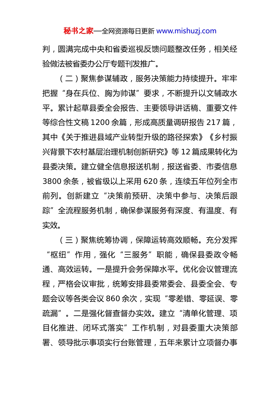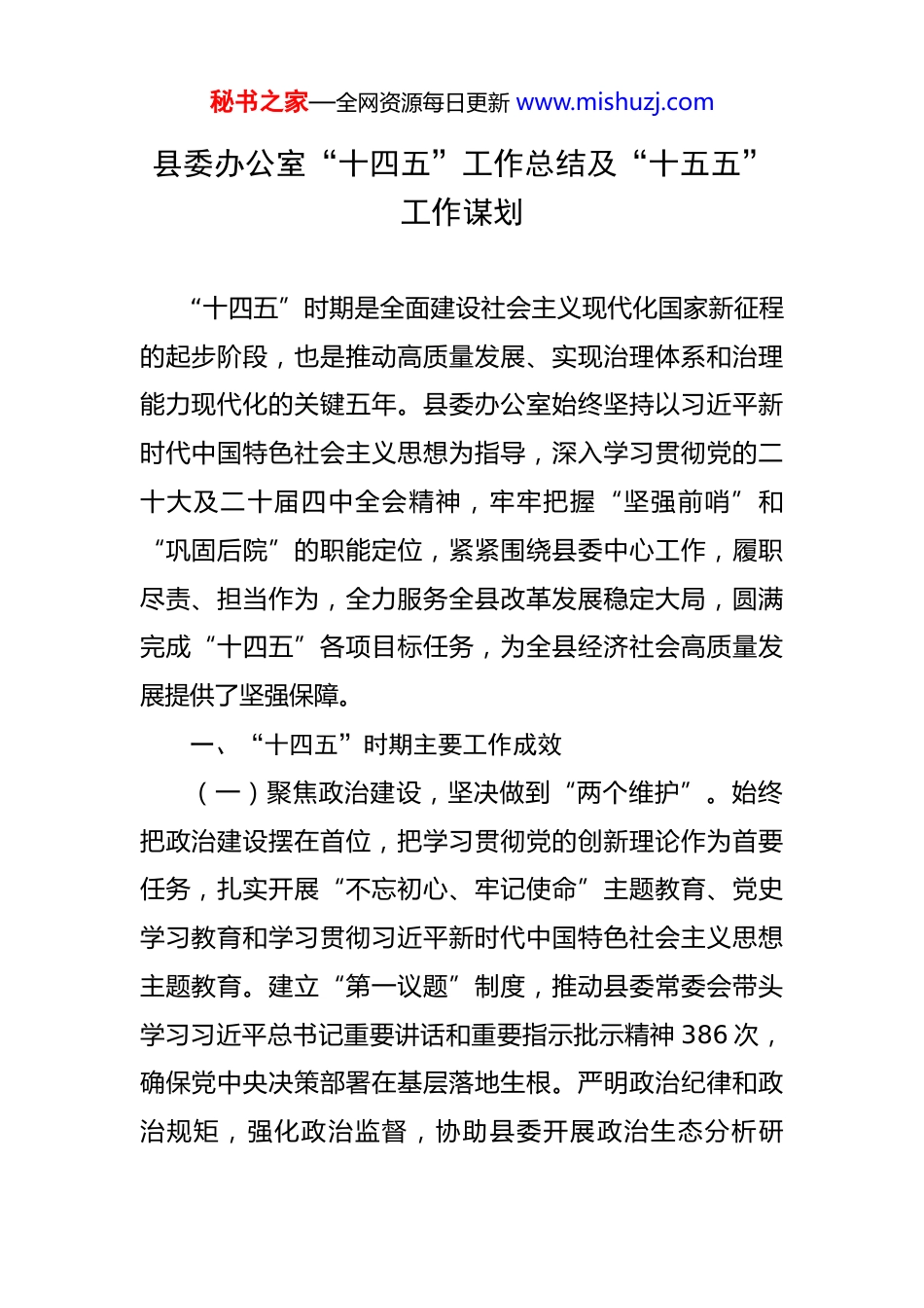 秘书之家—全网资源每日更新 www.mishuzj.com县委办公室“十四五”工作总结及“十五五”工作谋划 “十四五”时期是全面建设社会主义现代化国家新征程的起步阶段,也是推动高质量发展、实现治理体系和治理能力现代化的关键五年。县委办公室始终坚持以习近平新时代中国特色社会主义思想为指导,深入学习贯彻党的二十大及二十届四中全会精神,牢牢把握“坚强前哨”和“巩固后院”的职能定位,紧紧围绕县委中心工作,履职尽责、担当作为,全力服务全县改革发展稳定大局,圆满完成“十四五”各项目标任务,为全县经济社会高质量发展提供了坚强保障。一、“十四五”时期主要工作成效(一)聚焦政治建设,坚决做到“两个维护”。始终把政治建设摆在首位,把学习贯彻党的创新理论作为首要任务,扎实开展“不忘初心、牢记使命”主题教育、党史学习教育和学习贯彻习近平新时代中国特色社会主义思想主题教育。建立“第一议题”制度,推动县委常委会带头学习习近平总书记重要讲话和重要指示批示精神 386 次,确保党中央决策部署在基层落地生根。严明政治纪律和政治规矩,强化政治监督,协助县委开展政治生态分析研秘书之家—全网资源每日更新 www.mishuzj.com判,圆满完成中央和省委巡视反馈问题整改任务,相关经验做法被省委办公厅专题刊发推广。(二)聚焦参谋辅政,服务决策能力持续提升。牢牢把握“身在兵位、胸为帅谋”要求,不断提升以文辅政水平。累计起草县委全会报告、主要领导讲话稿、重要文件等综合性文稿 1200 余篇,形成高质量调研报告 217 篇,其中《关于推进县域产业转型升级的路径探索》《乡村振兴背景下农村基层治理机制创新研究》等 12 篇成果转化为县委决策。建立健全信息报送机制,报送省委、市委信息3800 余条,被省级以上采用 620 条,连续五年位列全市前列。创新建立“决策前预研、决策中参与、决策后跟踪”全流程服务机制,确保参谋服务有深度、有温度、有实效。(三)聚焦统筹协调,保障运转高效顺畅。充分发挥“枢纽”作用,强化“三服务”职能,确保县委政令畅通、高效运转。一是提升会务保障水平。优化会议管理流程,严格会议审批,统筹安排县委常委会、县委全会、专题会议等各类会议 860 余次,实现“零差错、零延误、零疏漏”。二是强化督查督办实效。建立“清单化管理、项目化推进、闭环式落实”工作机制,对县委重大决策部署、领导批示事项实行台账管理,五年来累计立项督办事秘书之家—全网资源每日更新 www.mishuzj.com项 1860 项,办结率 99.6%,推动解决群众急难愁盼问题430 余件。三是推进改革任务落地。牵头或协调推进党的建设、基层治理、“放管服”改革等重点领域改革任务276 项,形成“党建引领网格治理”“政务服务一网通办”等一批具有县域特色的改革成果,3 项经验被省委改革办简报刊发。(四)聚焦作风建设,机关运行更加规范有序。深入贯彻纪律规定及其要求,持续推进机关规范化、制度化建设。修订完善《县委办公室工作规则》《机关内部管理制度汇编》等制度 48 项,覆盖文秘、保密、接待、财务、后勤等各环节。高标准完成党政机关事业单位办公用房清理整改任务,推进节约型机关建设,县本级“三公”经费连续五年实现压减。扎实开展“对标先进、提升效能”专项行动,组织业务培训、岗位练兵、轮岗交流等活动 56 场次,干部综合素质明显提升。2023 年,县委办公室被评为“全省党委系统办公室工作先进单位”。(五)聚焦基层减负,推动治理效能不断提升。深入贯彻落实中央和省市关于整治形式主义为基层减负的决策部署,协助县委制定出台《关于持续解决形式主义突出问题为基层减负的若干措施》,建立基层负担动态监测机制。五年来,全县会议、文件数量年均压减 15%以上,督秘书之家—全网资源每日更新 www.mishuzj.com查检查考核事项整合率超过 50%。推动“指尖上的形式主义”专项整治,清理整合政务类 APP、工作群组 132 个。强化数字赋能,建成县级政务数据共享平台,推动“一网通办”事项覆盖率达 98%,基层办事效率提升 60%以上,相关做法在全市作风建设大会上作交流发言。二、“十五五”时期工作谋划面向...