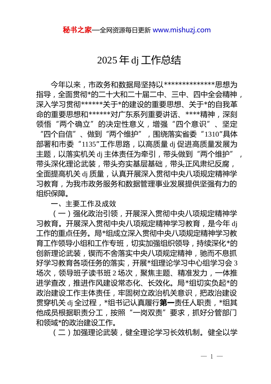 秘书之家—全网资源每日更新 www.mishuzj.com2025 年 dj 工作总结今年以来,市政务和数据局坚持以**************思想为指导,全面贯彻*的二十大和二十届二中、三中、四中全会精神,深入学习贯彻******关于*的建设的重要思想、关于*的自我革命的重要思想和******对广东系列重要讲话、****精神,深刻领悟“两个确立”的决定性意义,增强“四个意识”、坚定“四个自信”、做到“两个维护”,围绕落实省委“1310”具体部署和市委“1135”工作思路,以高质量 dj 促进高质量发展为主题,以落实机关 dj 主体责任为牵引,带头做到“两个维护”,带头深化理论武装,带头夯实基层基础,带头正风肃纪反腐,全面提高机关 dj 质量,认真开展深入贯彻中央八项规定精神学习教育,为我市政务服务和数据管理事业发展提供坚强有力的组织保障。一、主要工作及成效(一)强化政治引领,开展深入贯彻中央八项规定精神学习教育。开展深入贯彻中央八项规定精神学习教育,是今年 dj工作的重点任务。局*组成立深入贯彻中央八项规定精神学习教育工作领导小组和工作专班,切实加强组织领导,持续深化*的创新理论武装,锲而不舍落实中央八项规定精神,驰而不息抓好学习教育各项任务的落实,开展*组理论学习中心组学习会 3场次,领导班子读书班 2 场次,聚焦主题、精准发力,一体推进学查改,推进作风建设常态化、长效化。局*组切实负起*的政治建设工作主体责任,牢固树立政治机关意识,把政治建设贯穿机关 dj 全过程,*组书记认真履行第一责任人职责,*组其他成员根据职责分工,按照“一岗双责”要求,抓好分管部门和领域*的政治建设工作。(二)加强理论武装,健全理论学习长效机制。健全以学— 1 —秘书之家—全网资源每日更新 www.mishuzj.com铸魂、以学增智、以学正风、以学促干长效机制,落实“第一议题”“三会一课”、主题*日等制度,完善“五学联动”机制,把*的创新理论作为基层学习教育培训的首课、主课、必修课抓实抓好,推动*的创新理论入脑入心、见行见效。认真落实《中国共产**委(*组)理论学习中心组学习规则》,提升理论学习质效,发挥领学促学作用。开展深入贯彻中央八项规定精神学习教育期间,7 个*支部通过“三会一课”学习 80 场次,主题*日活动 31 场次。加强年轻干部教育引领,建强用好青年理论学习小组,持续开展“青年学思行”活动,深度凝聚青年干部智慧,着力提升青年干部的政治素养,今年以来通过青年理论学习小组学习 5 场次。(三)夯实组织建设,推进机关 dj 工作见实见效。一是开展“两比两论”活动,优化便民服务。贯彻落实市委七届七次全会和全市大抓产业大抓招商大抓项目苦干实干加快推进高质量发展大会精神,结合我局工作实际,在*员、干部中开展“两比两论”活动,围绕优化营商环境、阳光交易建设、数字赋能基层治理、改善人居环境、重点工作争先进位、发挥 dj 引领作用、办好民生实事等方面,适时集中研讨并凝聚共识,聚焦群众急难愁盼,找准工作重点,查实工作差距,狠抓工作落实,压实具体责任,倡导苦干实干。二是加强组织建设,做好机关*委和机关*支部换届选举工作,并把好*员入口关,有序发展新*员,共培养发展对象 2 名,为*组织输入“新鲜血液”。三是参加 2025 年揭阳市“先锋杯”工作创新大赛。我局选送作品《dj引领打造一流公共资源交易平台》晋级第十三届广东省“先锋杯”工作创新赛初赛项目。(四)创新活动载体,引导*员干部增强宗旨意识。一是扎实开展“先锋引领双报到”活动。经常组织*员志愿者到挂钩联系村榕城区西郊社区开展志愿活动;植树节之际与中国联通揭阳市分公司到“双报到”挂钩联系点榕城区西马街道西郊社区— 2 —秘书之家—全网资源每日更新 www.mishuzj.com开展“共绘绿美榕城,共建幸福家园”义务植树活动;与中国移动揭阳市分公司到揭西县钱坑镇开展“联合共建、绿美揭阳”植树主题*日活动,共同种植 150 棵树苗,助力绿美揭阳生态建设。二是组织干部职工参观“书香润机关鉴往启新程”史志文化展。结合深入贯彻中央八项规定精神学习教育,通过观展与阅读,引导*员干部永葆初心使命、提升文化传承...