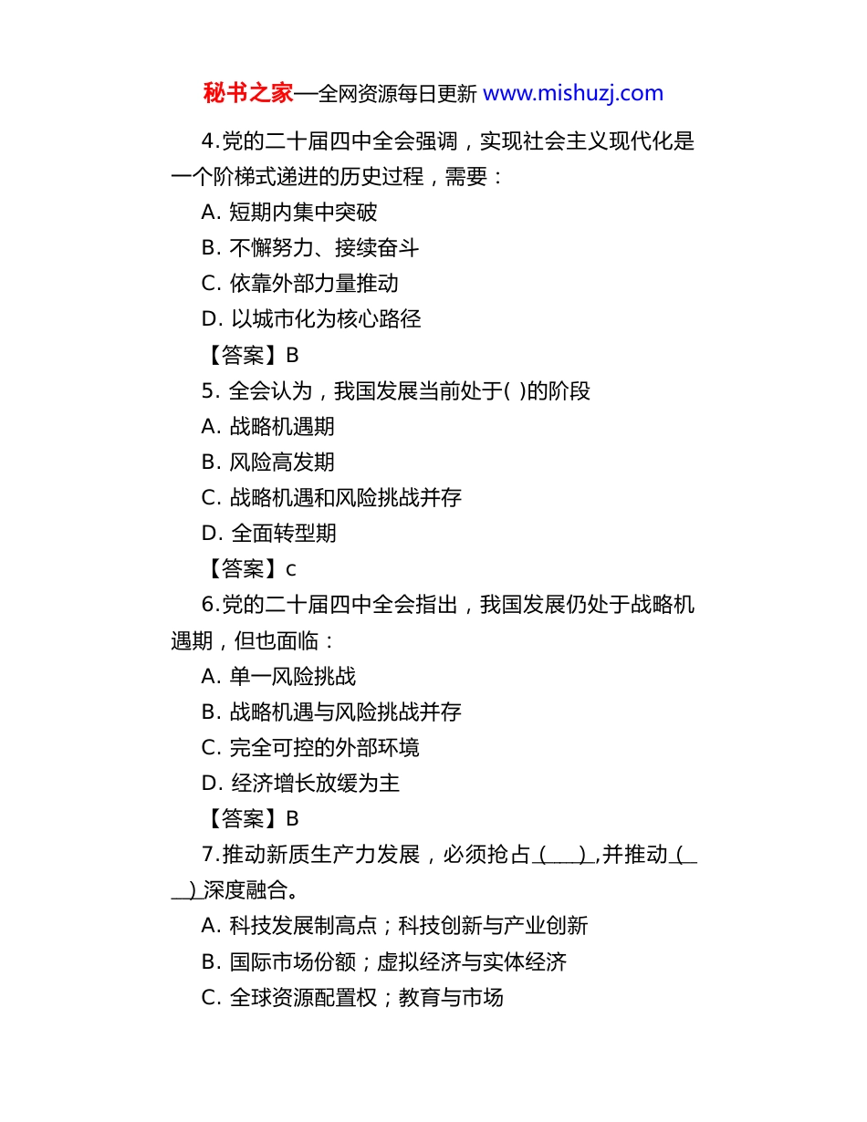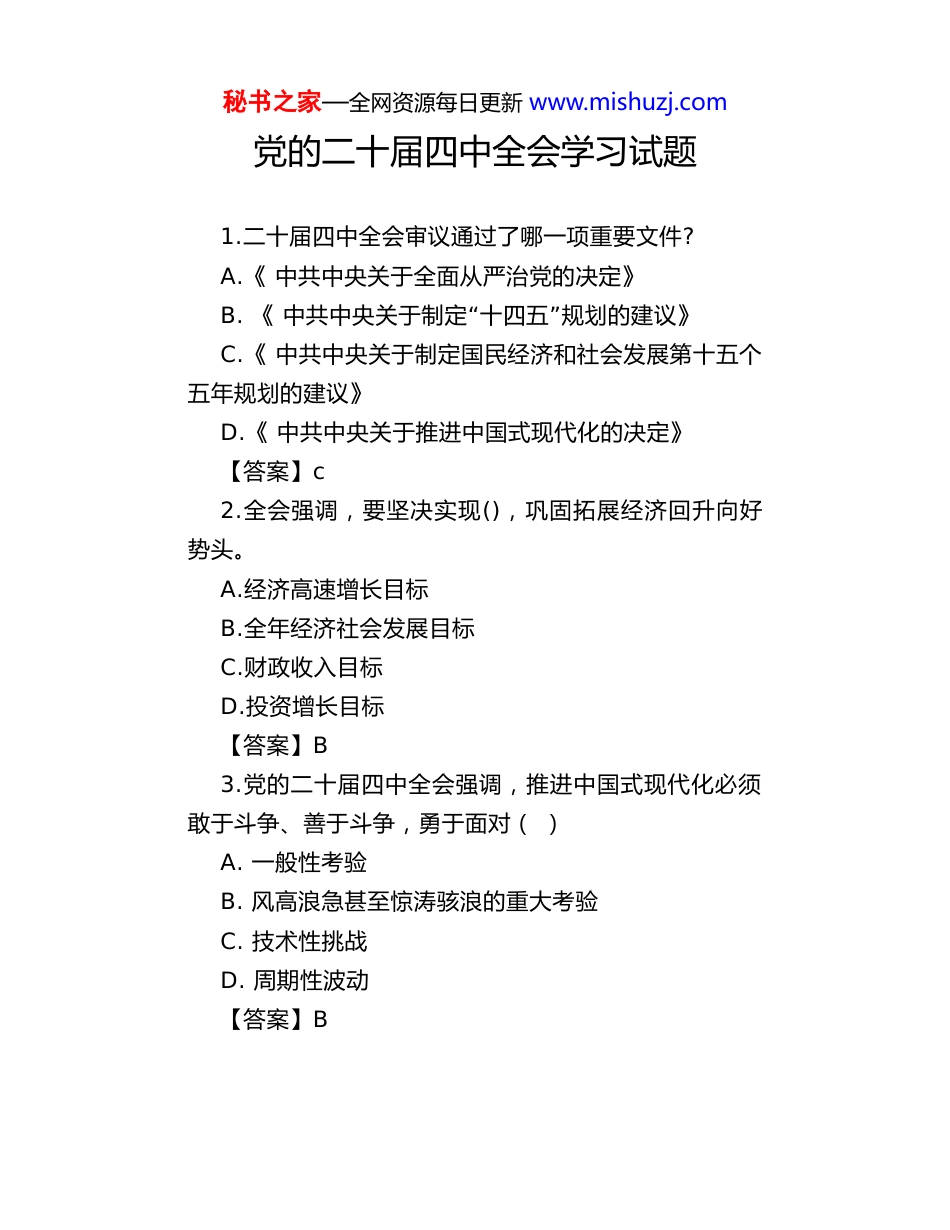 秘书之家—全网资源每日更新 www.mishuzj.com党的二十届四中全会学习试题1.二十届四中全会审议通过了哪一项重要文件?A. 《 中共中央关于全面从严治党的决定》B. “”《 中共中央关于制定 十四五 规划的建议》C. 《 中共中央关于制定国民经济和社会发展第十五个五年规划的建议》D. 《 中共中央关于推进中国式现代化的决定》【答案】c2.全会强调,要坚决实现(),巩固拓展经济回升向好势头。A.经济高速增长目标B.全年经济社会发展目标C.财政收入目标D.投资增长目标【答案】B3.党的二十届四中全会强调,推进中国式现代化必须敢于斗争、善于斗争,勇于面对( )A. 一般性考验B. 风高浪急甚至惊涛骇浪的重大考验C. 技术性挑战D. 周期性波动【答案】B秘书之家—全网资源每日更新 www.mishuzj.com4.党的二十届四中全会强调,实现社会主义现代化是一个阶梯式递进的历史过程,需要:A. 短期内集中突破B. 不懈努力、接续奋斗C. 依靠外部力量推动D. 以城市化为核心路径【答案】B5. 全会认为,我国发展当前处于( )的阶段A. 战略机遇期B. 风险高发期C. 战略机遇和风险挑战并存D. 全面转型期【答案】c6.党的二十届四中全会指出,我国发展仍处于战略机遇期,但也面临:A. 单一风险挑战B. 战略机遇与风险挑战并存C. 完全可控的外部环境D. 经济增长放缓为主【答案】B7.推动新质生产力发展,必须抢占( ) ,并推动( ) 深度融合。A. 科技发展制高点;科技创新与产业创新B. 国际市场份额;虚拟经济与实体经济C. 全球资源配置权;教育与市场秘书之家—全网资源每日更新 www.mishuzj.comD. 产业链高端;制造业与金融业【答案】A8.党的二十届四中全会提出,推动全体人民共同富裕要:A. 一步到位B. 先富带动后富C. 稳步推进D. 以城市为中心【答案】c9.党的二十届四中全会提出,建设美丽中国必须牢固树立的理念是:A. 工业优先B. 绿水青山就是金山银山C. 城市化主导D. 高速增长优先【答案】B10.党的二十届四中全会指出,我国长期向好的基本趋势()A. 已经改变B. 没有变C. 正在逆转D. 难以判断【答案】B11. 全会强调,推动经济实现质的有效提升和量的合理增长,必须以什么为中心?秘书之家—全网资源每日更新 www.mishuzj.comA. 政治建设B. 文化建设C. 经济建设D. 社会建设【答案】c12.党的二十届四中全会强调,实现社会主义现代化是一个阶梯式递进的历史过程,需要:A. 短期内集中突破B. 不懈努力、接续奋斗C. 依靠外部力量推动D. 以城市化为核心路径【答案】B13.“”以下哪项不是 十五五 时期经济社会发展必须遵循的原则?A. 坚持党的全面领导B. 坚持人民至上C. 坚持市场优先D. 坚持高质量发展【答案】c14.全会提出,构建现代化产业体系要坚持()方向,并以()为骨干。A. 智能化、绿色化、融合化;现代服务业B. 高端化、数字化、国际化;战略性新兴产业C. 智能化、绿色化、融合化;先进制造业D. 绿色化、服务化、虚拟化;数字经济秘书之家—全网资源每日更新 www.mishuzj.com【答案】c15.全会指出,国家安全是中国式现代化:A. 最终目标B. 行稳致远的重要基础C. 经济建设的补充D. 外交工作的延伸【答案】B16.全会提出,推进中国式现代化的根本保障是()A. 教育B. 科技C. 党的领导D.市场机制【答案】c17.党的二十届四中全会提出,要增强国内大循环的()A. 外部依赖性B. 内生动力和可靠性C. 出口导向性D. 投资拉动性 【答案】B18.全会提出,现代化产业体系的骨干是:A. 服务业B. 数字经济C. 先进制造业D. 房地产【答案】c秘书之家—全网资源每日更新 www.mishuzj.com19.党的二十届四中全会提出,推动新质生产力发展的关键是:A. 扩大出口B. 科技创新C. 降低税收D. 增加劳动力【答案】B20.全会提出,保障和改善民生的基本原则是:A. 尽力而为、量力而行B. 全民免费、全面覆盖C. 市场主导、政府辅助D. 以城市为重点【答案】A21.下列哪项是“增强国内大 循环内生动力和可靠”性 的直接举措?A.织牢社会保障安全网B.大力提振消费,扩大有效投资C.加强国防和军队现代化建设D.做好稳外贸工作【答案】B22.构建新...