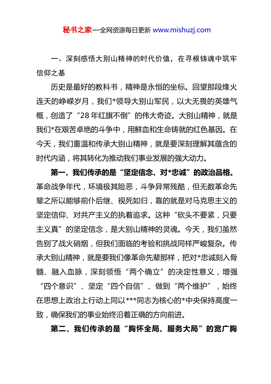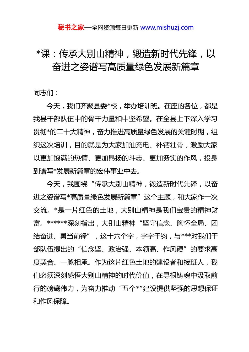 秘书之家—全网资源每日更新 www.mishuzj.com*课:传承大别山精神,锻造新时代先锋,以奋进之姿谱写高质量绿色发展新篇章同志们:今天,我们齐聚县委*校,举办培训班。在座的各位,都是我县干部队伍中的骨干力量和中坚希望。在全县上下深入学习贯彻*的二十大精神,奋力推进高质量绿色发展的关键时期,组织这次培训,目的就是为大家加油充电、补钙壮骨,激励大家以更加饱满的热情、更加昂扬的斗志、更加务实的作风,投身到谱写*发展新篇章的宏伟事业中去。今天,我围绕“传承大别山精神,锻造新时代先锋,以奋进之姿谱写*高质量绿色发展新篇章”这个主题,和大家作一次交流。*是一片红色的土地,大别山精神是我们宝贵的精神财富。******深刻指出,大别山精神“坚守信念、胸怀全局、团结奋进、勇当前锋”,这十六个字,字字千钧,与***对我们干部队伍提出的“信念坚、政治强、本领高、作风硬”的要求高度契合、一脉相承。作为这片红色土地的建设者和接班人,我们必须深刻感悟大别山精神的时代价值,在寻根铸魂中汲取前行的磅礴伟力,为奋力推动“五个*”建设提供坚强的思想保证和作风保障。秘书之家—全网资源每日更新 www.mishuzj.com一、深刻感悟大别山精神的时代价值,在寻根铸魂中筑牢信仰之基历史是最好的教科书,精神是永恒的坐标。回望那段烽火连天的峥嵘岁月,我们*领导大别山军民,以大无畏的英雄气概,创造了“28 年红旗不倒”的伟大奇迹。大别山精神,就是我们*在艰苦卓绝的斗争中,用鲜血和生命铸就的红色基因。在今天,我们重温和传承大别山精神,就是要深刻理解其蕴含的时代内涵,将其转化为推动我们事业发展的强大动力。第一,我们传承的是“坚定信念、对*忠诚”的政治品格。革命战争年代,环境极其险恶,斗争异常残酷,但无数革命先辈之所以能够前仆后继、视死如归,靠的就是对马克思主义的坚定信仰、对共产主义的执着追求。这种“砍头不要紧,只要主义真”的坚定信念,是大别山精神的灵魂。今天,我们虽然告别了战火硝烟,但我们面临的考验和挑战同样严峻复杂。传承大别山精神,就是要我们像革命先辈那样,把对*忠诚刻入骨髓、融入血脉,深刻领悟“两个确立”的决定性意义,增强“四个意识”、坚定“四个自信”、做到“两个维护”,始终在思想上政治上行动上同以***同志为核心的*中央保持高度一致,确保我们的事业始终沿着正确的方向前进。第二,我们传承的是“胸怀全局、服务大局”的宽广胸秘书之家—全网资源每日更新 www.mishuzj.com襟。在革命斗争中,大别山根据地作为鄂豫皖革命根据地的中心区域,始终服从服务于全国革命斗争的大局。无论是战略转移,还是支援其他根据地,大别山军民都以大局为重,不计较局部得失。这种胸怀全局的战略眼光和无私奉献的崇高境界,是大别山精神的精髓。当前,*的发展正处在转型升级、跨越赶超的关键阶段。我们推动的每一项工作,都与国家发展战略、省市工作部署紧密相连。传承大别山精神,就是要我们自觉跳出一时一域的思维定式,善于从全局和长远来观察、分析和处理问题,把*的发展放到全国、全省、全市的大格局中去谋划和推进,做到既为一域增光、又为全局添彩。第三,我们传承的是“团结奋进、依靠群众”的优良作风。大别山革命根据地之所以能够长期存在并不断发展壮大,一个根本原因就是我们*始终与人民群众心连心、同呼吸、共命运,形成了坚如磐石的军政军民团结。人民群众用小推车推出了革命的胜利,用最后一碗米、最后一块布支援了子弟兵。这种水乳交融、生死与共的干群关系,是大别山精神的力量源泉。今天,我们正在意气风发地迈向第二个百年奋斗目标,人民对美好生活的向往就是我们的奋斗目标。传承大别山精神,就是要我们始终牢记*的根本宗旨,站稳人民立场,厚植为民情怀,把群众的安危冷暖时刻放在心上,用心用情用力解决好群秘书之家—全网资源每日更新 www.mishuzj.com众急难愁盼问题,不断增强人民群众的获得感、幸福感、安全感。第四,我们传承的是“勇当前锋、敢于胜利”的斗争精神。大别山的革命史,就是一部充满斗争、敢于胜利的英雄史诗。面对强敌的反复“围剿”和严酷的白色恐怖,革命先辈们没有退缩...