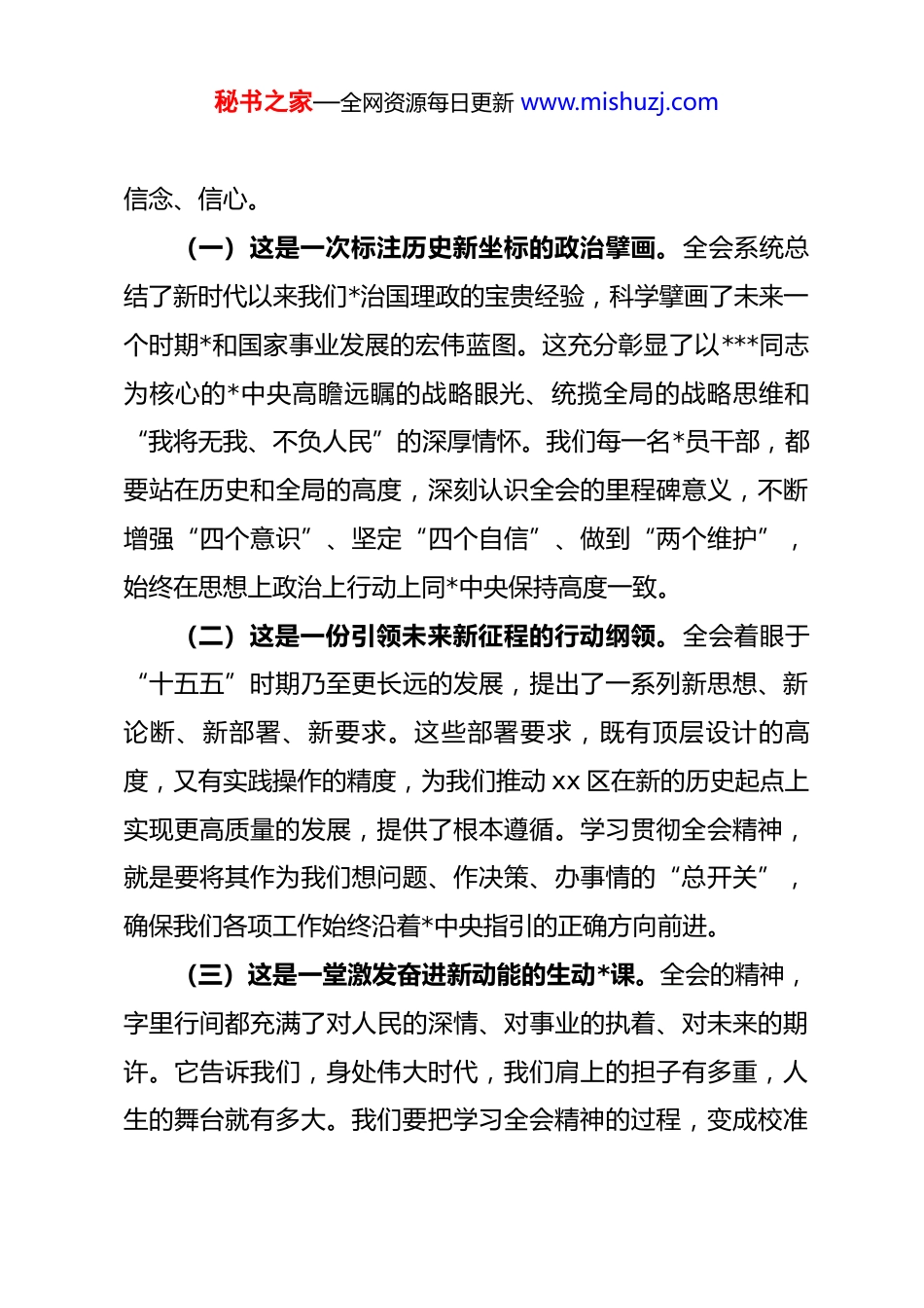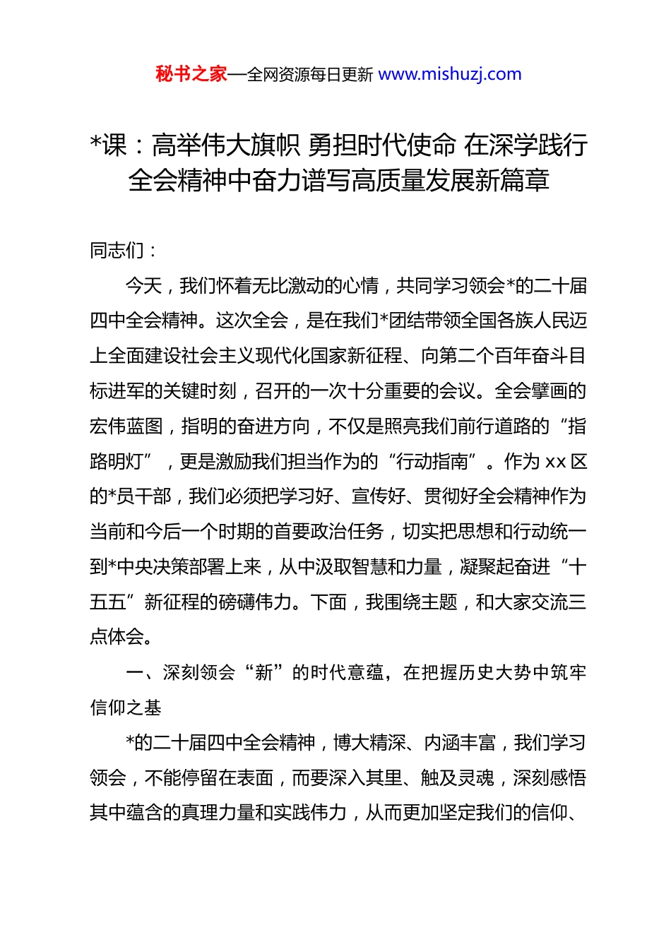 秘书之家—全网资源每日更新 www.mishuzj.com*课:高举伟大旗帜 勇担时代使命 在深学践行全会精神中奋力谱写高质量发展新篇章同志们:今天,我们怀着无比激动的心情,共同学习领会*的二十届四中全会精神。这次全会,是在我们*团结带领全国各族人民迈上全面建设社会主义现代化国家新征程、向第二个百年奋斗目标进军的关键时刻,召开的一次十分重要的会议。全会擘画的宏伟蓝图,指明的奋进方向,不仅是照亮我们前行道路的“指路明灯”,更是激励我们担当作为的“行动指南”。作为 xx 区的*员干部,我们必须把学习好、宣传好、贯彻好全会精神作为当前和今后一个时期的首要政治任务,切实把思想和行动统一到*中央决策部署上来,从中汲取智慧和力量,凝聚起奋进“十五五”新征程的磅礴伟力。下面,我围绕主题,和大家交流三点体会。一、深刻领会“新”的时代意蕴,在把握历史大势中筑牢信仰之基*的二十届四中全会精神,博大精深、内涵丰富,我们学习领会,不能停留在表面,而要深入其里、触及灵魂,深刻感悟其中蕴含的真理力量和实践伟力,从而更加坚定我们的信仰、秘书之家—全网资源每日更新 www.mishuzj.com信念、信心。(一)这是一次标注历史新坐标的政治擘画。全会系统总结了新时代以来我们*治国理政的宝贵经验,科学擘画了未来一个时期*和国家事业发展的宏伟蓝图。这充分彰显了以***同志为核心的*中央高瞻远瞩的战略眼光、统揽全局的战略思维和“我将无我、不负人民”的深厚情怀。我们每一名*员干部,都要站在历史和全局的高度,深刻认识全会的里程碑意义,不断增强“四个意识”、坚定“四个自信”、做到“两个维护”,始终在思想上政治上行动上同*中央保持高度一致。(二)这是一份引领未来新征程的行动纲领。全会着眼于“十五五”时期乃至更长远的发展,提出了一系列新思想、新论断、新部署、新要求。这些部署要求,既有顶层设计的高度,又有实践操作的精度,为我们推动 xx 区在新的历史起点上实现更高质量的发展,提供了根本遵循。学习贯彻全会精神,就是要将其作为我们想问题、作决策、办事情的“总开关”,确保我们各项工作始终沿着*中央指引的正确方向前进。(三)这是一堂激发奋进新动能的生动*课。全会的精神,字里行间都充满了对人民的深情、对事业的执着、对未来的期许。它告诉我们,身处伟大时代,我们肩上的担子有多重,人生的舞台就有多大。我们要把学习全会精神的过程,变成校准秘书之家—全网资源每日更新 www.mishuzj.com思想航向、激发干事热情的过程,把个人的“小目标”融入*和国家的“大蓝图”,在新征程上展现新担当、实现新作为。二、准确把握“进”的核心要义,在服务发展大局中校准前行航向学习的目的全在于运用。贯彻落实*的二十届四中全会精神,关键在于紧密结合 xx 区的发展实际,将其转化为推动工作的具体思路、破解难题的有效办法、惠及群众的实在成果。(一)要在坚持*的全面领导上实现新加强。*的领导是我们的最大优势,也是我们战胜一切艰难险阻的“定海神针”。我们要毫不动摇地坚持和加强*的全面领导,把*的领导贯穿于经济社会发展的各领域、全过程。一是政治引领要更强。要始终把政治建设摆在首位,确保中央的各项决策部署在 xx 区不折不扣地落到实处。二是组织基础要更牢。要持续深化基层*组织建设,把每一个支部都打造成坚强的战斗堡垒,让每一名*员都成为一面鲜红的旗帜,真正做到哪里有群众,哪里就有*的工作;哪里有困难,哪里就有*员站在第一线。(二)要在推动高质量发展上取得新突破。发展是第一要务。我们要完整、准确、全面贯彻新发展理念,在“质”与“量”的统一中,奋力开创高质量发展新局面。一是产业升级要提速。要紧盯科技创新前沿,大力发展新质生产力,让更多秘书之家—全网资源每日更新 www.mishuzj.com科技含量高、市场前景好的项目在 xx 落地生根、开花结果。二是改革开放要深化。要持续优化营商环境,当好服务企业的“店小二”,让国企敢干、民企敢闯、外企敢投。三是城乡融合要协调。要像绣花一样精细管理城市,同时扎实推进乡村全面振兴,让城市有“烟火气”,让乡村有“田园诗”,绘就一幅各美其美...