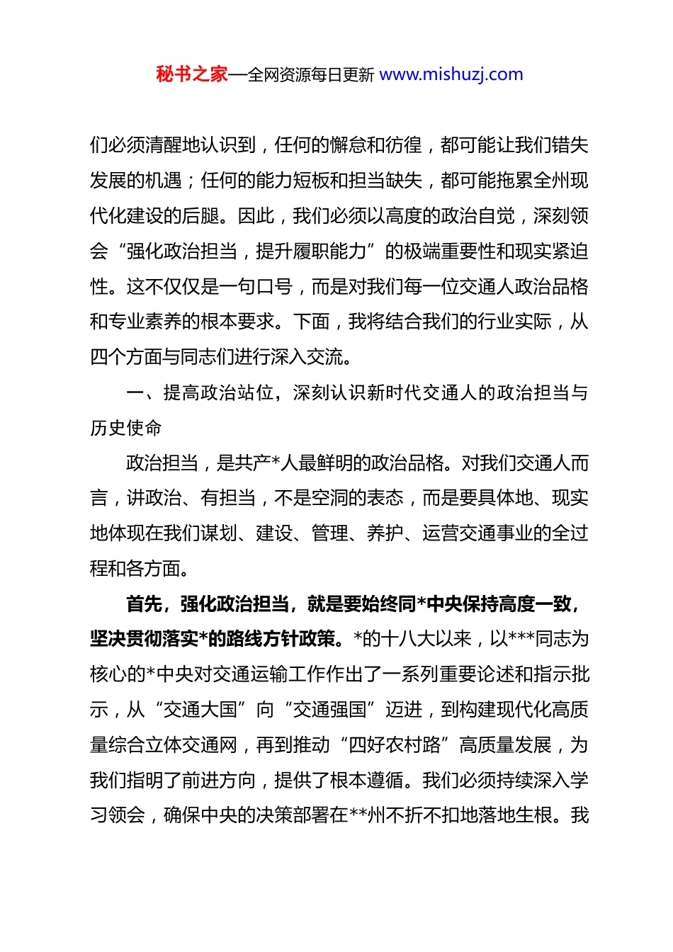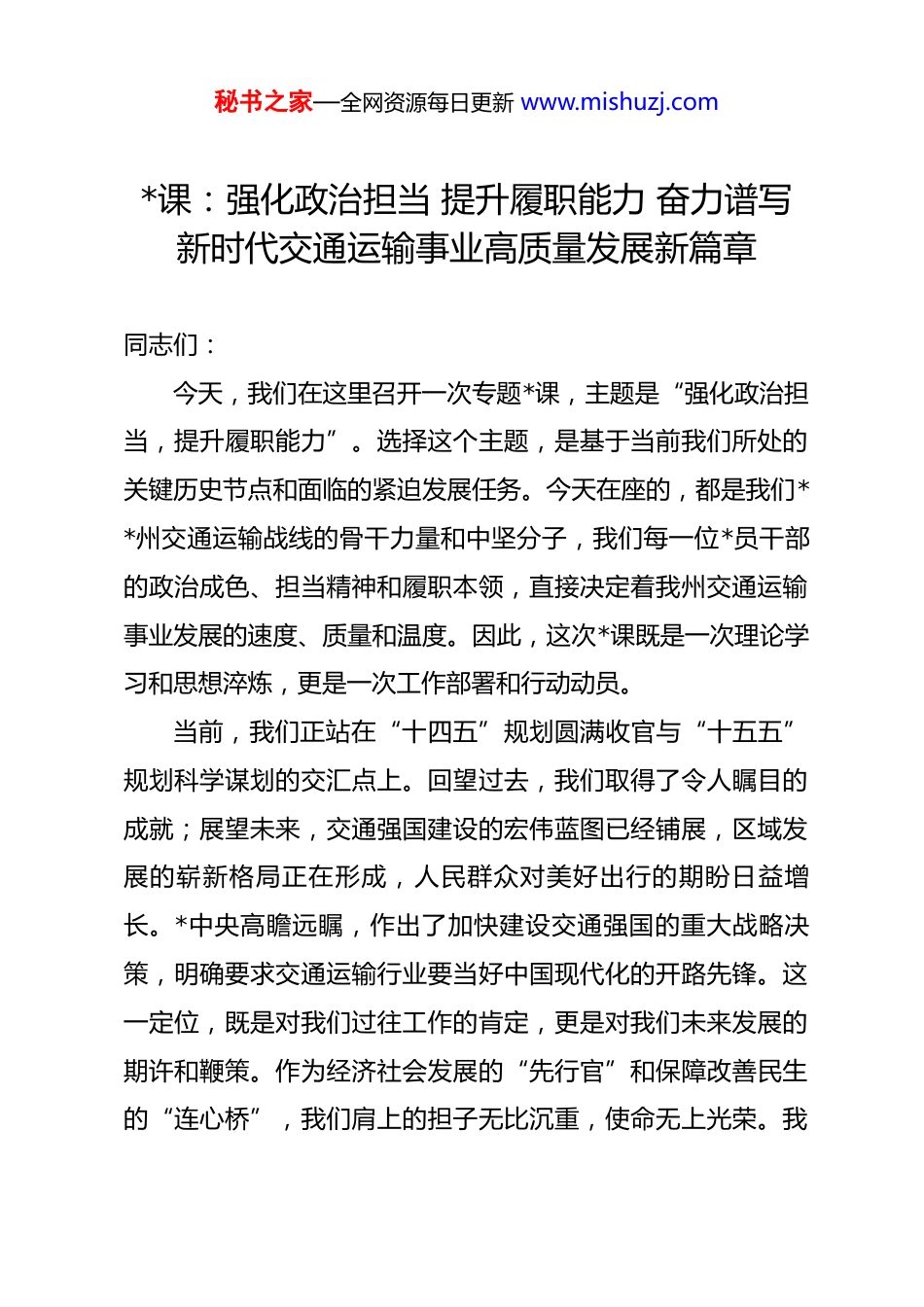 秘书之家—全网资源每日更新 www.mishuzj.com*课:强化政治担当 提升履职能力 奋力谱写新时代交通运输事业高质量发展新篇章同志们:今天,我们在这里召开一次专题*课,主题是“强化政治担当,提升履职能力”。选择这个主题,是基于当前我们所处的关键历史节点和面临的紧迫发展任务。今天在座的,都是我们**州交通运输战线的骨干力量和中坚分子,我们每一位*员干部的政治成色、担当精神和履职本领,直接决定着我州交通运输事业发展的速度、质量和温度。因此,这次*课既是一次理论学习和思想淬炼,更是一次工作部署和行动动员。当前,我们正站在“十四五”规划圆满收官与“十五五”规划科学谋划的交汇点上。回望过去,我们取得了令人瞩目的成就;展望未来,交通强国建设的宏伟蓝图已经铺展,区域发展的崭新格局正在形成,人民群众对美好出行的期盼日益增长。*中央高瞻远瞩,作出了加快建设交通强国的重大战略决策,明确要求交通运输行业要当好中国现代化的开路先锋。这一定位,既是对我们过往工作的肯定,更是对我们未来发展的期许和鞭策。作为经济社会发展的“先行官”和保障改善民生的“连心桥”,我们肩上的担子无比沉重,使命无上光荣。我秘书之家—全网资源每日更新 www.mishuzj.com们必须清醒地认识到,任何的懈怠和彷徨,都可能让我们错失发展的机遇;任何的能力短板和担当缺失,都可能拖累全州现代化建设的后腿。因此,我们必须以高度的政治自觉,深刻领会“强化政治担当,提升履职能力”的极端重要性和现实紧迫性。这不仅仅是一句口号,而是对我们每一位交通人政治品格和专业素养的根本要求。下面,我将结合我们的行业实际,从四个方面与同志们进行深入交流。一、提高政治站位,深刻认识新时代交通人的政治担当与历史使命政治担当,是共产*人最鲜明的政治品格。对我们交通人而言,讲政治、有担当,不是空洞的表态,而是要具体地、现实地体现在我们谋划、建设、管理、养护、运营交通事业的全过程和各方面。首先,强化政治担当,就是要始终同*中央保持高度一致,坚决贯彻落实*的路线方针政策。*的十八大以来,以***同志为核心的*中央对交通运输工作作出了一系列重要论述和指示批示,从“交通大国”向“交通强国”迈进,到构建现代化高质量综合立体交通网,再到推动“四好农村路”高质量发展,为我们指明了前进方向,提供了根本遵循。我们必须持续深入学习领会,确保中央的决策部署在**州不折不扣地落地生根。我秘书之家—全网资源每日更新 www.mishuzj.com们谋划的每一条线路,建设的每一个项目,出台的每一项政策,都必须首先从政治上看,看是否符合中央精神,是否有利于服务国家重大战略,是否有利于推动区域协调发展,是否有利于增进人民福祉。其次,强化政治担当,就是要主动服务于全州经济社会发展大局。交通是经济的脉络,是发展的先行棋。当前,我州正处于产业转型升级、城乡融合发展的关键时期,对交通基础设施的通达深度、覆盖广度、服务效能都提出了前所未有的高要求。我们必须跳出“就交通论交通”的思维定式,将交通发展置于全州“一盘棋”中去考量。我们的规划要与产业布局、城镇规划、旅游发展、乡村振兴等紧密衔接;我们的项目建设要优先保障重点产业园区、重要经济节点、核心景区的通达需求。我们要深刻认识到,打通一条断头路,可能就盘活了一个片区;建设一个枢纽站,可能就催生了一个产业集群。我们要用交通的“先行”为全州发展的“快行”提供最坚实、最可靠的保障。根据初步测算,在即将到来的“十五五”期间,全州交通固定资产投资预计将超过 650 亿元,这不仅是经济数字,更是我们服务大局、支撑发展的沉甸甸的责任状。再者,强化政治担当,就是要始终坚守“人民交通为人民”的根本宗旨。交通运输事业的出发点和落脚点,永远是人秘书之家—全网资源每日更新 www.mishuzj.com民群众。我们工作的成效好不好,最终要由人民来评判。群众的“急难愁盼”就是我们工作的“指南针”和“发力点”。是城市交通拥堵让群众通勤不便,还是农村物流“最后一公里”尚未打通?是客运服务品质有待提升,还是交通执法行为不够规范?这些都是检验我们是否具有为民情...