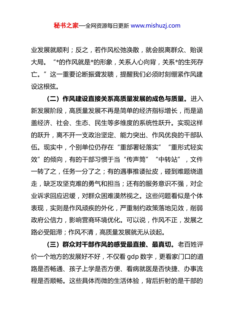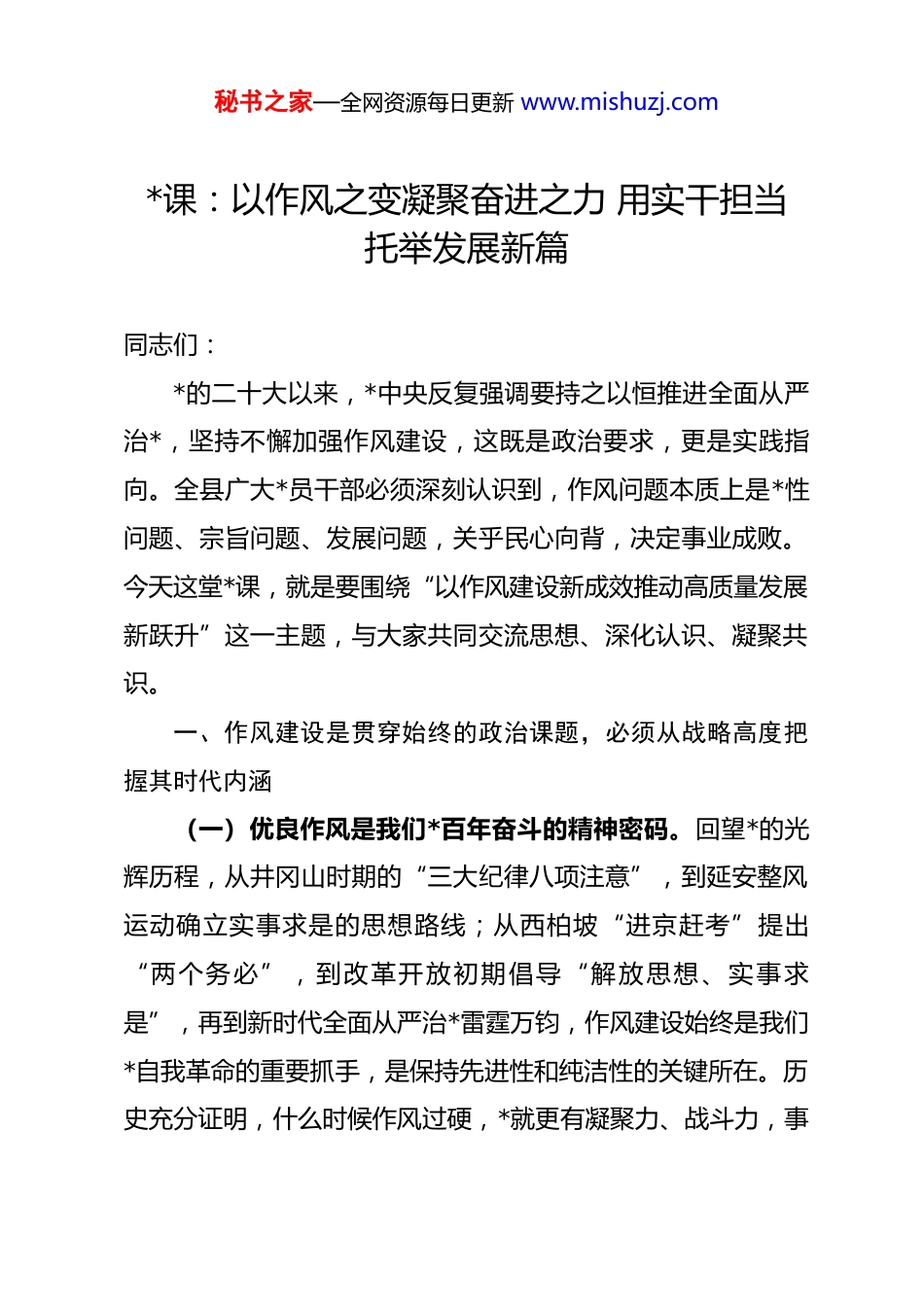 秘书之家—全网资源每日更新 www.mishuzj.com*课:以作风之变凝聚奋进之力 用实干担当托举发展新篇同志们:*的二十大以来,*中央反复强调要持之以恒推进全面从严治*,坚持不懈加强作风建设,这既是政治要求,更是实践指向。全县广大*员干部必须深刻认识到,作风问题本质上是*性问题、宗旨问题、发展问题,关乎民心向背,决定事业成败。今天这堂*课,就是要围绕“以作风建设新成效推动高质量发展新跃升”这一主题,与大家共同交流思想、深化认识、凝聚共识。一、作风建设是贯穿始终的政治课题,必须从战略高度把握其时代内涵(一)优良作风是我们*百年奋斗的精神密码。回望*的光辉历程,从井冈山时期的“三大纪律八项注意”,到延安整风运动确立实事求是的思想路线;从西柏坡“进京赶考”提出“两个务必”,到改革开放初期倡导“解放思想、实事求是”,再到新时代全面从严治*雷霆万钧,作风建设始终是我们*自我革命的重要抓手,是保持先进性和纯洁性的关键所在。历史充分证明,什么时候作风过硬,*就更有凝聚力、战斗力,事秘书之家—全网资源每日更新 www.mishuzj.com业发展就顺利;反之,若作风松弛涣散,就会脱离群众、贻误大局。“*的作风就是*的形象,关系人心向背,关系*的生死存亡。”这一重要论断振聋发聩,提醒我们必须时刻绷紧作风建设这根弦。(二)作风建设直接关系高质量发展的成色与质量。进入新发展阶段,高质量发展不再是简单的经济指标增长,而是涵盖经济、社会、生态、民生等多维度的系统性跃升。实现这样的跃升,离不开一支政治坚定、能力突出、作风优良的干部队伍。现实中,个别单位仍存在“重部署轻落实”“重形式轻实效”的倾向,有的干部习惯于当“传声筒”“中转站”,文件一转了之,任务一分了之;有的遇事推诿扯皮,碰到难题绕道走,缺乏攻坚克难的勇气和担当;还有的服务意识不强,对企业诉求回应迟缓,对群众困难漠然视之。这些问题看似是个体表现,实则是作风顽疾的外化,严重制约政策落地见效,削弱政府公信力,影响营商环境优化。可以说,作风不正,发展之路必受阻滞;作风不清,高质量发展就无从谈起。(三)群众对干部作风的感受最直接、最真切。老百姓评价一个地方的发展好不好,不仅看 gdp 数字,更看家门口的道路是否畅通、孩子上学是否方便、看病就医是否快捷、办事流程是否顺畅。这些具体而微的生活体验,背后折射的是干部的秘书之家—全网资源每日更新 www.mishuzj.com工作态度和服务水平。一位退休教师曾感慨:“现在去政务大厅办事,窗口人员笑脸相迎,材料一次告知,不用来回跑,心里踏实多了。”这样朴素的话语,正是对我们作风建设成果最真实的肯定。相反,如果群众反映的问题长期得不到回应,合理诉求被敷衍塞责,哪怕经济发展再快,也难以赢得真心拥护。因此,作风建设不是抽象概念,而是体现在每一次接待来访、每一份审批办理、每一项惠民政策落实之中,它连接着*心与民心,承载着信任与期待。二、对标新形势新要求,准确识别当前作风建设中的突出问题(一)思想层面仍需进一步破除惯性思维。一是存在“路径依赖”现象。部分干部习惯于按老办法办事,面对新形势新任务缺乏创新意识,在工作中满足于“过得去”,不愿动脑筋想办法,导致一些改革举措停留在纸面,未能转化为实际成效。二是存在“本位主义”倾向。有的部门只顾自己“一亩三分地”,协调配合意识不强,跨领域、跨层级事项推进缓慢,形成“中梗阻”。三是存在“畏难情绪”。面对复杂矛盾和历史遗留问题,个别干部怕担责任、怕惹麻烦,宁可“不干事”也不愿“干错事”,缺乏应有的斗争精神和担当魄力。(二)工作落实中仍有“虚浮空”现象。一是调研不够深秘书之家—全网资源每日更新 www.mishuzj.com入。有的干部下基层走马观花,坐在车上转、隔着玻璃看,听汇报多、问群众少,掌握情况不全面,制定政策脱离实际。某乡镇在推进农村改厕过程中,未充分征求村民意见,统一安装型号不符合使用习惯,结果建成后闲置率高,造成资源浪费。二是执行打折扣。上级决策部署到了基层出现“层层衰减”,有的选择性落实、象征性推进,甚至搞“上有政策、下有对策”。三是督查流...