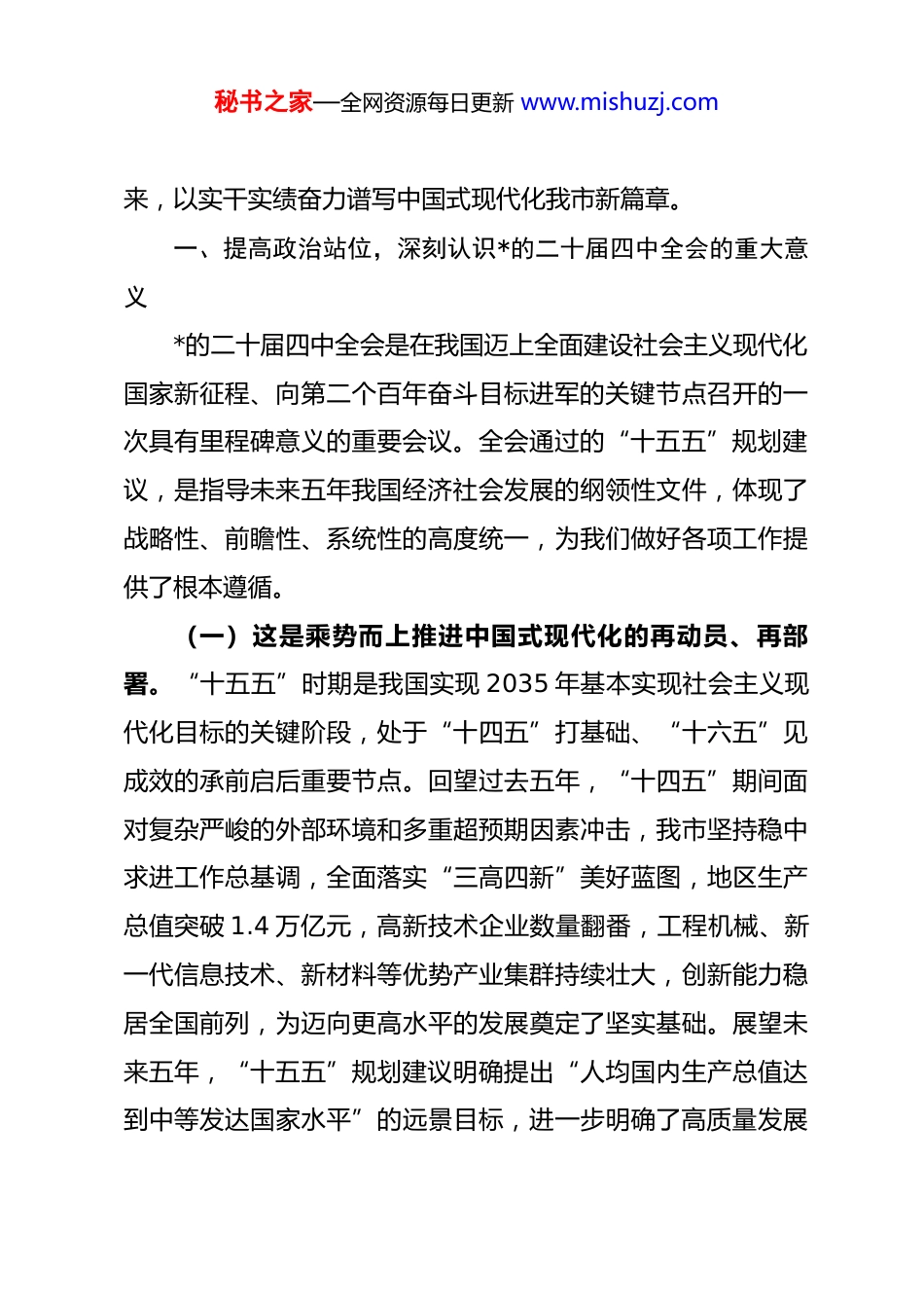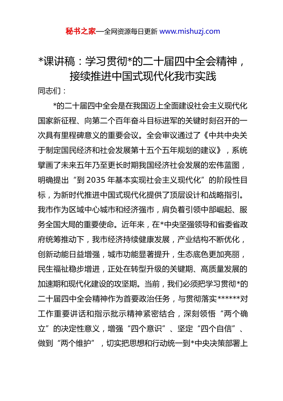秘书之家—全网资源每日更新 www.mishuzj.com*课讲稿:学习贯彻*的二十届四中全会精神,接续推进中国式现代化我市实践同志们:*的二十届四中全会是在我国迈上全面建设社会主义现代化国家新征程、向第二个百年奋斗目标进军的关键时刻召开的一次具有里程碑意义的重要会议。全会审议通过了《中共中央关于制定国民经济和社会发展第十五个五年规划的建议》,系统擘画了未来五年乃至更长时期我国经济社会发展的宏伟蓝图,明确提出“到 2035 年基本实现社会主义现代化”的阶段性目标,为新时代推进中国式现代化提供了顶层设计和战略指引。我市作为区域中心城市和经济强市,肩负着引领中部崛起、服务全国大局的重要使命。近年来,在*中央坚强领导和省委省政府统筹推动下,我市经济持续健康发展,产业结构不断优化,创新动能日益增强,城市功能显著提升,生态底色更加亮丽,民生福祉稳步增进,正处在转型升级的关键期、高质量发展的加速期和现代化建设的攻坚期。当前,我们必须把学习贯彻*的二十届四中全会精神作为首要政治任务,与贯彻落实******对工作重要讲话和指示批示精神紧密结合,深刻领悟“两个确立”的决定性意义,增强“四个意识”、坚定“四个自信”、做到“两个维护”,切实把思想和行动统一到*中央决策部署上秘书之家—全网资源每日更新 www.mishuzj.com来,以实干实绩奋力谱写中国式现代化我市新篇章。一、提高政治站位,深刻认识*的二十届四中全会的重大意义*的二十届四中全会是在我国迈上全面建设社会主义现代化国家新征程、向第二个百年奋斗目标进军的关键节点召开的一次具有里程碑意义的重要会议。全会通过的“十五五”规划建议,是指导未来五年我国经济社会发展的纲领性文件,体现了战略性、前瞻性、系统性的高度统一,为我们做好各项工作提供了根本遵循。(一)这是乘势而上推进中国式现代化的再动员、再部署。“十五五”时期是我国实现 2035 年基本实现社会主义现代化目标的关键阶段,处于“十四五”打基础、“十六五”见成效的承前启后重要节点。回望过去五年,“十四五”期间面对复杂严峻的外部环境和多重超预期因素冲击,我市坚持稳中求进工作总基调,全面落实“三高四新”美好蓝图,地区生产总值突破 1.4 万亿元,高新技术企业数量翻番,工程机械、新一代信息技术、新材料等优势产业集群持续壮大,创新能力稳居全国前列,为迈向更高水平的发展奠定了坚实基础。展望未来五年,“十五五”规划建议明确提出“人均国内生产总值达到中等发达国家水平”的远景目标,进一步明确了高质量发展秘书之家—全网资源每日更新 www.mishuzj.com的方向路径。我市必须抢抓这一历史性机遇,主动对标对表国家战略布局,在构建新发展格局中找准自身定位,以更大作为支撑全国现代化进程。(二)这是准确识变应变求变的战略指引。******指出:“我国发展进入战略机遇和风险挑战并存、不确定难预料因素增多的时期。”这一重大判断深刻揭示了当前国际国内形势的复杂性与艰巨性。从外部看,全球地缘政治博弈加剧,逆全球化思潮抬头,科技竞争日趋白热化;从内部看,经济恢复基础尚不牢固,结构性矛盾依然突出,人口结构转型、能源资源约束等问题日益显现。我市作为外向型经济活跃的城市,进出口总额连续多年保持两位数增长,深度融入全球产业链供应链,面临的外部冲击更为直接。对此,我们要增强忧患意识、底线思维,牢牢把握“危中有机、转危为机”的辩证逻辑,充分发挥我市产业基础厚实、科教资源丰富、市场主体活跃、营商环境优良等综合优势,以自身的确定性应对环境的不确定性,坚定不移办好自己的事。(三)这是擘画高质量发展宏伟蓝图的行动指南。全会围绕统筹推进“五位一体”总体布局、协调推进“四个全面”战略布局,提出了一系列重大战略任务和政策举措,涵盖创新驱动、产业升级、区域协调、绿色转型、民生改善等多个维度。秘书之家—全网资源每日更新 www.mishuzj.com特别是强调加快建设现代化经济体系、大力发展新质生产力、推动人工智能与实体经济深度融合等内容,与我市的发展实际高度契合。近年来,我市聚焦打造国家重要先进制造业中心,加快推进智能制造、数字赋...