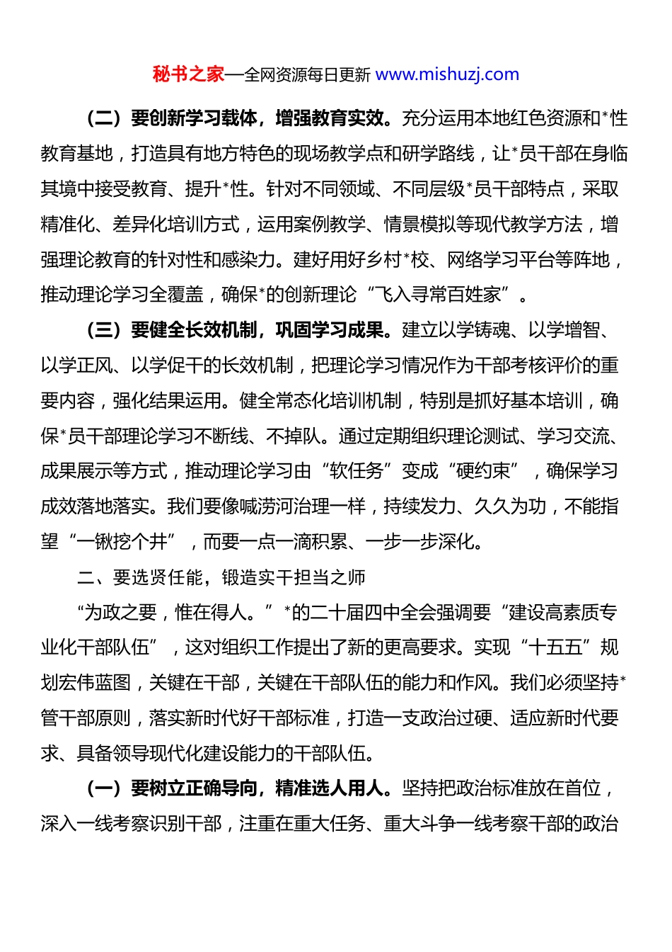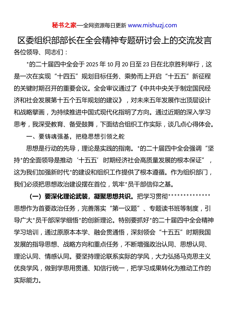 秘书之家—全网资源每日更新 www.mishuzj.com区委组织部部长在全会精神专题研讨会上的交流发言各位领导、同志们:*的二十届四中全会于 2025 年 10 月 20 日至 23 日在北京胜利举行,这是一次在实现“十四五”规划目标任务、乘势而上开启“十五五”新征程的关键时期召开的重要会议。全会审议通过了《中共中央关于制定国民经济和社会发展第十五个五年规划的建议》,对未来五年发展作出顶层设计和战略擘画,为持续推进中国式现代化指明了方向。通过近期的深入学习思考,我深受教育、备受鼓舞,下面结合组织工作实际,谈几点心得体会。一、要铸魂强基,把稳思想引领之舵思想是行动的先导,理论是实践的指南。*的二十届四中全会强调“坚持*的全面领导是推动‘十五五’时期经济社会高质量发展的根本保证”,这为我们加强新时代*的建设和组织工作提供了根本遵循。作为组织部门,我们必须把思想政治建设摆在首位,筑牢*员干部信仰之基。(一)要深化理论武装,凝聚思想共识。把学习贯彻**************思想作为首要政治任务,完善落实“第一议题”、专题读书班等制度,引导广大*员干部深学细悟*的创新理论。特别要抓好*的二十届四中全会精神学习培训,通过原原本本学、融会贯通悟,深刻领会“十五五”时期我国发展的指导思想、战略方向和重点任务,不断增强政治认同、思想认同、理论认同、情感认同。要坚持理论联系实际的学风,大力弘扬马克思主义优良学风,做到学思用贯通、知信行统一,把学习成果转化为推动工作的实际能力。秘书之家—全网资源每日更新 www.mishuzj.com(二)要创新学习载体,增强教育实效。充分运用本地红色资源和*性教育基地,打造具有地方特色的现场教学点和研学路线,让*员干部在身临其境中接受教育、提升*性。针对不同领域、不同层级*员干部特点,采取精准化、差异化培训方式,运用案例教学、情景模拟等现代教学方法,增强理论教育的针对性和感染力。建好用好乡村*校、网络学习平台等阵地,推动理论学习全覆盖,确保*的创新理论“飞入寻常百姓家”。(三)要健全长效机制,巩固学习成果。建立以学铸魂、以学增智、以学正风、以学促干的长效机制,把理论学习情况作为干部考核评价的重要内容,强化结果运用。健全常态化培训机制,特别是抓好基本培训,确保*员干部理论学习不断线、不掉队。通过定期组织理论测试、学习交流、成果展示等方式,推动理论学习由“软任务”变成“硬约束”,确保学习成效落地落实。我们要像喊涝河治理一样,持续发力、久久为功,不能指望“一锹挖个井”,而要一点一滴积累、一步一步深化。二、要选贤任能,锻造实干担当之师“为政之要,惟在得人。”*的二十届四中全会强调要“建设高素质专业化干部队伍”,这对组织工作提出了新的更高要求。实现“十五五”规划宏伟蓝图,关键在干部,关键在干部队伍的能力和作风。我们必须坚持*管干部原则,落实新时代好干部标准,打造一支政治过硬、适应新时代要求、具备领导现代化建设能力的干部队伍。(一)要树立正确导向,精准选人用人。坚持把政治标准放在首位,深入一线考察识别干部,注重在重大任务、重大斗争一线考察干部的政治秘书之家—全网资源每日更新 www.mishuzj.com表现和能力素质。健全干部考核评价机制,强化高质量发展政绩考核,大力选拔政治过硬、敢于担当、锐意改革、实绩突出、清正廉洁的干部。就像农民选种,既要看品种纯度,也要看适应能力,我们要选出最能适应这片土地、最能带领群众发展的“好种子”。(二)要加强实践锻炼,提升专业素养。有计划地选派干部到产业发展、项目建设、乡村振兴、基层治理等重点领域和艰苦复杂环境历练,在实战实干中培养专业精神、丰富专业知识、提升专业能力。围绕现代化产业体系建设、招商引资、数字经济等重点工作,开展精准化培训,帮助干部弥补知识弱项、能力短板、经验盲区。我们要像培养工匠一样,既有系统的理论传授,又有扎实的实践操练,让干部在摸爬滚打中增长才干。(三)要严管厚爱结合,激励担当作为。完善从严管理监督干部制度体系,推进政治监督具体化、精准化、常态化,加强对干部全方位管理和经常性监督。深入落实“三个...