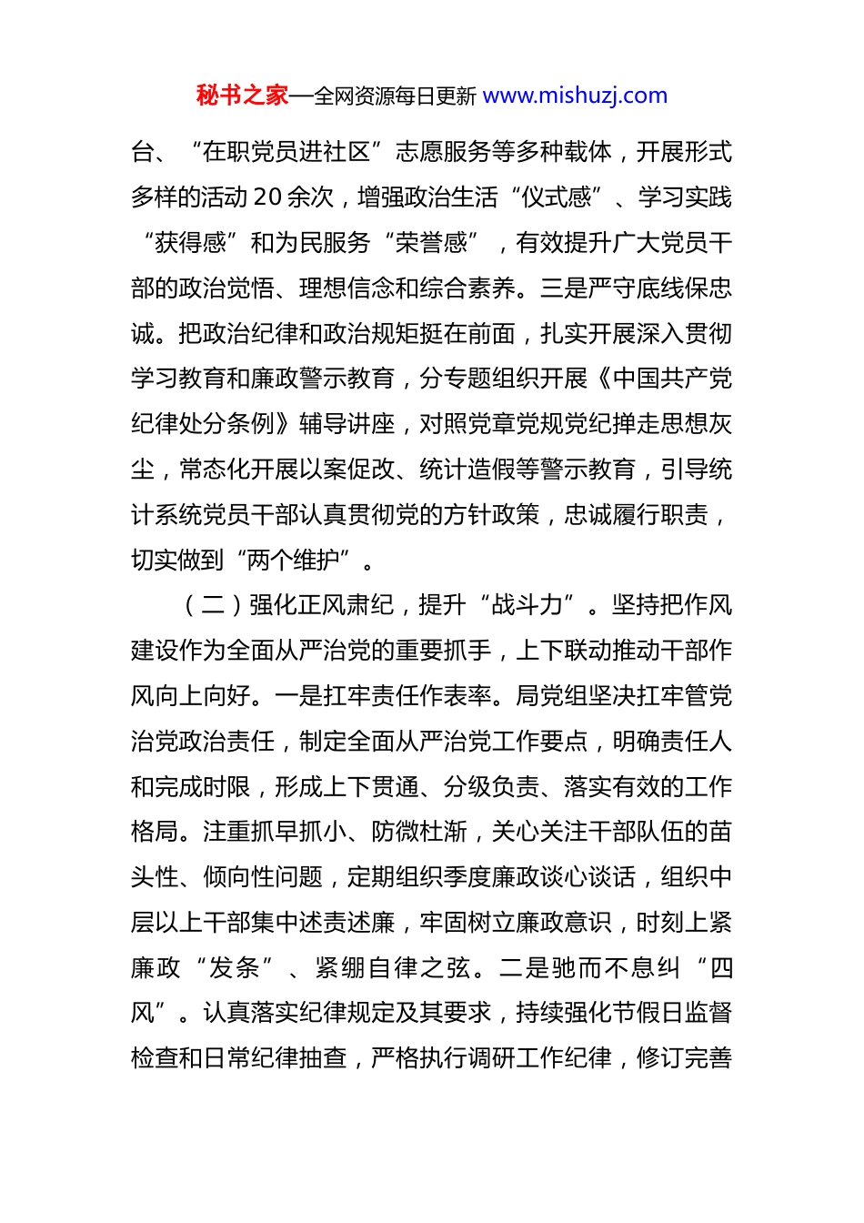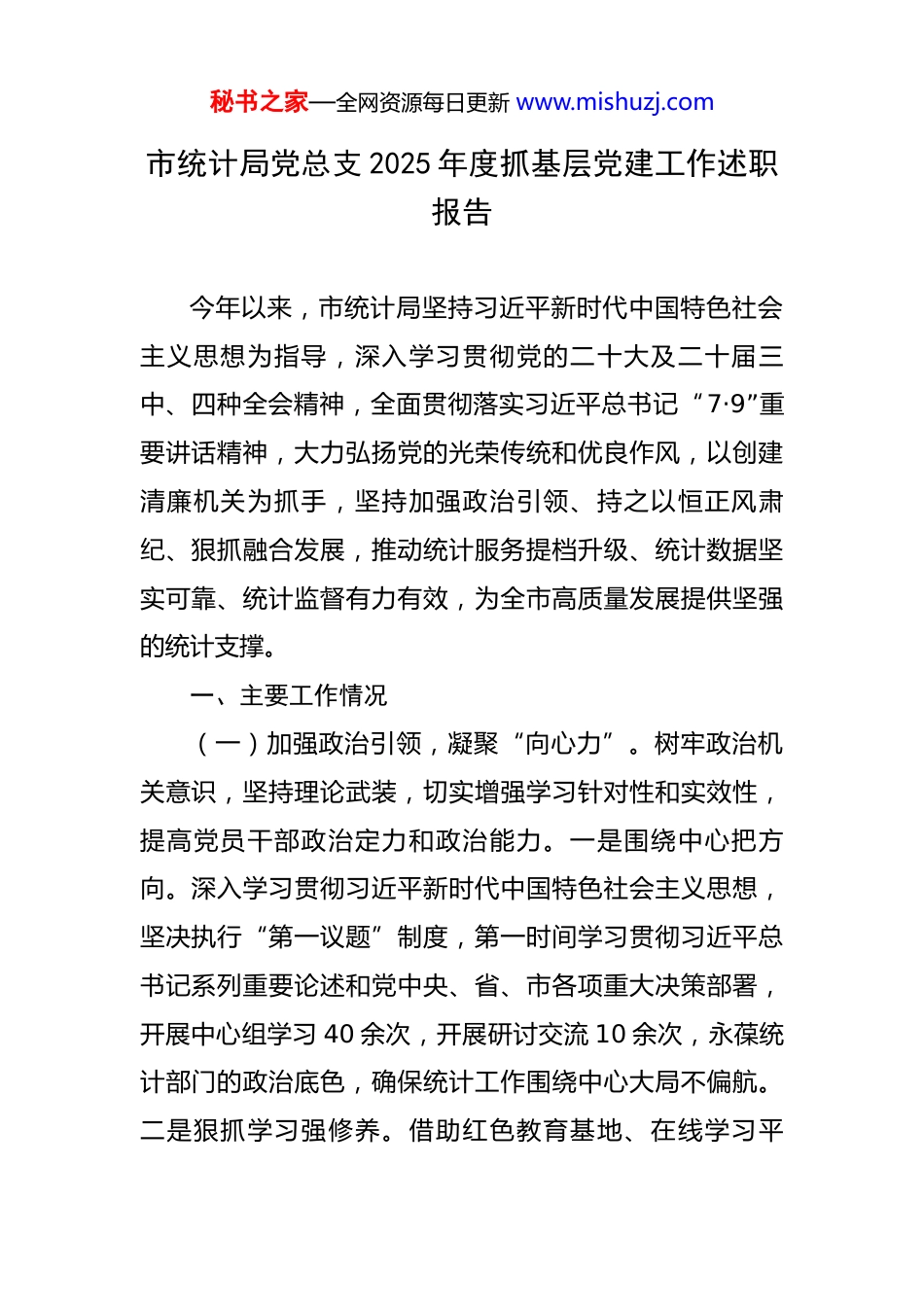 秘书之家—全网资源每日更新 www.mishuzj.com市统计局党总支 2025 年度抓基层党建工作述职报告 今年以来,市统计局坚持习近平新时代中国特色社会主义思想为指导,深入学习贯彻党的二十大及二十届三中、四种全会精神,全面贯彻落实习近平总书记“7·9”重要讲话精神,大力弘扬党的光荣传统和优良作风,以创建清廉机关为抓手,坚持加强政治引领、持之以恒正风肃纪、狠抓融合发展,推动统计服务提档升级、统计数据坚实可靠、统计监督有力有效,为全市高质量发展提供坚强的统计支撑。一、主要工作情况(一)加强政治引领,凝聚“向心力”。树牢政治机关意识,坚持理论武装,切实增强学习针对性和实效性,提高党员干部政治定力和政治能力。一是围绕中心把方向。深入学习贯彻习近平新时代中国特色社会主义思想,坚决执行“第一议题”制度,第一时间学习贯彻习近平总书记系列重要论述和党中央、省、市各项重大决策部署,开展中心组学习 40 余次,开展研讨交流 10 余次,永葆统计部门的政治底色,确保统计工作围绕中心大局不偏航。二是狠抓学习强修养。借助红色教育基地、在线学习平秘书之家—全网资源每日更新 www.mishuzj.com台、“在职党员进社区”志愿服务等多种载体,开展形式多样的活动 20 余次,增强政治生活“仪式感”、学习实践“获得感”和为民服务“荣誉感”,有效提升广大党员干部的政治觉悟、理想信念和综合素养。三是严守底线保忠诚。把政治纪律和政治规矩挺在前面,扎实开展深入贯彻学习教育和廉政警示教育,分专题组织开展《中国共产党纪律处分条例》辅导讲座,对照党章党规党纪掸走思想灰尘,常态化开展以案促改、统计造假等警示教育,引导统计系统党员干部认真贯彻党的方针政策,忠诚履行职责,切实做到“两个维护”。(二)强化正风肃纪,提升“战斗力”。坚持把作风建设作为全面从严治党的重要抓手,上下联动推动干部作风向上向好。一是扛牢责任作表率。局党组坚决扛牢管党治党政治责任,制定全面从严治党工作要点,明确责任人和完成时限,形成上下贯通、分级负责、落实有效的工作格局。注重抓早抓小、防微杜渐,关心关注干部队伍的苗头性、倾向性问题,定期组织季度廉政谈心谈话,组织中层以上干部集中述责述廉,牢固树立廉政意识,时刻上紧廉政“发条”、紧绷自律之弦。二是驰而不息纠“四风”。认真落实纪律规定及其要求,持续强化节假日监督检查和日常纪律抽查,严格执行调研工作纪律,修订完善秘书之家—全网资源每日更新 www.mishuzj.com县级统计业务考核办法,减轻基层压力负担。利用重点节假日发送廉洁提醒,发挥支部纪检委员“微探头”作用,通报出勤纪律、工作纪律执行情况。深入对照排查“四风”隐形变异问题,严查统计造假搞虚假政绩,依法查处统计违纪违法行为 30 余起,公示统计执法信息,不断提升统计法治意识和统计公信力。三是严字当头常监督。综合运用平时观察、约谈提醒、廉政谈话、廉政考核等形式,定期借助典型案例开展警示教育,加强家风建设,让党员干部知敬畏、存戒惧、守底线。充分发挥全面监督、日常监督、民主监督和专责监督作用,主动接受市委巡察监督、纪检监察。班子成员、科室负责人严格履行“一岗双责”,每年梳理廉政风险点,定期更新廉政档案,确保监督管理全方位、无死角。(三)狠抓融合发展,增强“源动力”。深化“围绕中心抓党建,抓好党建促发展”的思想理念,推动机关党建向统计业务延伸,确保同频共振、双向融合。一是明确责任抓融合。坚持党建与业务同谋划、同部署、同推进、同考核,牢固树立抓党建是本职、不抓党建是失职、抓不好党建是渎职的工作理念,认真落实党建工作责任制,层层传导压力、逐级夯实责任。主要负责同志充分履行第一责任人责任,坚持重要工作亲自部署、重要问题亲自过秘书之家—全网资源每日更新 www.mishuzj.com问、重大事项亲自处置,班子其他成员切实履行“一岗双责”,自觉抓好分管党建和业务工作,推动两者相融合、共促进。二是提升能力助融合。强化基层组织力建设,制定落实“四强”党支部创建工作实施方案,细化目标任务和责任人员,全面落实“三会一课”、组织生活会等制度,扎...