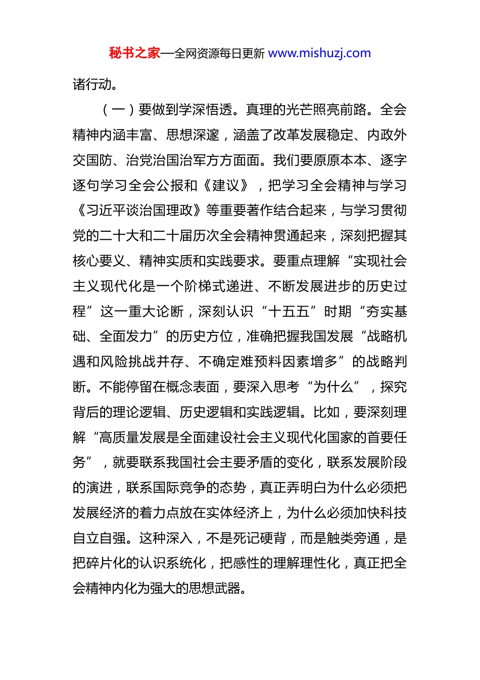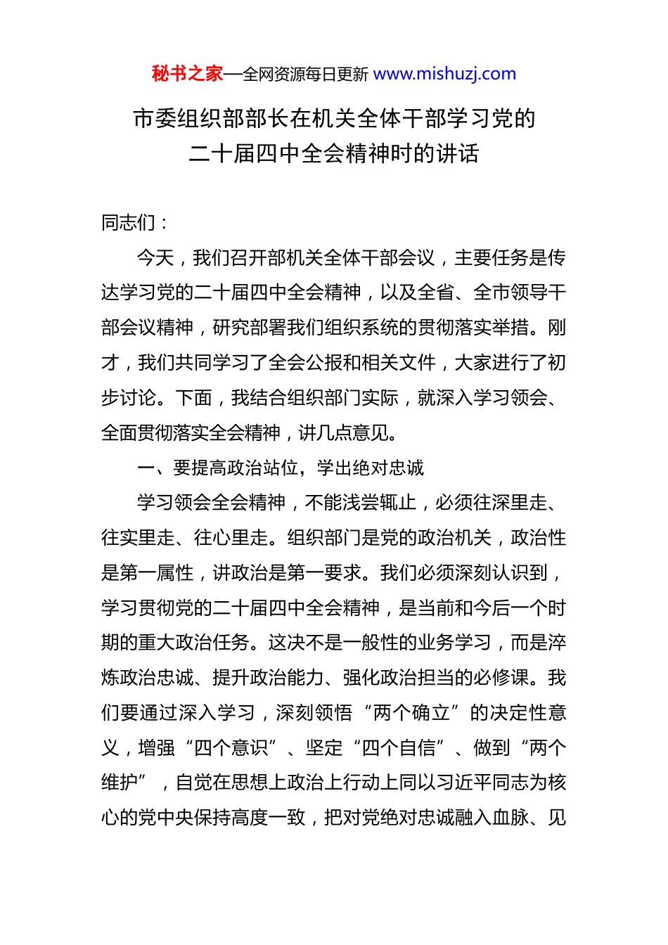 秘书之家—全网资源每日更新 www.mishuzj.com市委组织部部长在机关全体干部学习党的二十届四中全会精神时的讲话 同志们:今天,我们召开部机关全体干部会议,主要任务是传达学习党的二十届四中全会精神,以及全省、全市领导干部会议精神,研究部署我们组织系统的贯彻落实举措。刚才,我们共同学习了全会公报和相关文件,大家进行了初步讨论。下面,我结合组织部门实际,就深入学习领会、全面贯彻落实全会精神,讲几点意见。一、要提高政治站位,学出绝对忠诚学习领会全会精神,不能浅尝辄止,必须往深里走、往实里走、往心里走。组织部门是党的政治机关,政治性是第一属性,讲政治是第一要求。我们必须深刻认识到,学习贯彻党的二十届四中全会精神,是当前和今后一个时期的重大政治任务。这决不是一般性的业务学习,而是淬炼政治忠诚、提升政治能力、强化政治担当的必修课。我们要通过深入学习,深刻领悟“两个确立”的决定性意义,增强“四个意识”、坚定“四个自信”、做到“两个维护”,自觉在思想上政治上行动上同以习近平同志为核心的党中央保持高度一致,把对党绝对忠诚融入血脉、见秘书之家—全网资源每日更新 www.mishuzj.com诸行动。(一)要做到学深悟透。真理的光芒照亮前路。全会精神内涵丰富、思想深邃,涵盖了改革发展稳定、内政外交国防、治党治国治军方方面面。我们要原原本本、逐字逐句学习全会公报和《建议》,把学习全会精神与学习《习近平谈治国理政》等重要著作结合起来,与学习贯彻党的二十大和二十届历次全会精神贯通起来,深刻把握其核心要义、精神实质和实践要求。要重点理解“实现社会主义现代化是一个阶梯式递进、不断发展进步的历史过程”这一重大论断,深刻认识“十五五”时期“夯实基础、全面发力”的历史方位,准确把握我国发展“战略机遇和风险挑战并存、不确定难预料因素增多”的战略判断。不能停留在概念表面,要深入思考“为什么”,探究背后的理论逻辑、历史逻辑和实践逻辑。比如,要深刻理解“高质量发展是全面建设社会主义现代化国家的首要任务”,就要联系我国社会主要矛盾的变化,联系发展阶段的演进,联系国际竞争的态势,真正弄明白为什么必须把发展经济的着力点放在实体经济上,为什么必须加快科技自立自强。这种深入,不是死记硬背,而是触类旁通,是把碎片化的认识系统化,把感性的理解理性化,真正把全会精神内化为强大的思想武器。秘书之家—全网资源每日更新 www.mishuzj.com(二)要推动全员研学。学习不能有死角,教育不能有遗漏。组织部门不仅要自身学深悟透,还要承担起推动全市党员干部学习培训的重任。要按照党中央部署和省委、市委要求,迅速掀起学习宣传贯彻全会精神的热潮。要将全会精神作为各级党校(行政学院)、干部学院主课必修课的核心内容,及时进教材、进课堂、进头脑。要分层分类抓好培训,针对市管主要领导干部、年轻干部、基层干部等不同对象,设计精准化的教学方案和研修课程。要加强对基层学习宣传的指导,推动各领域、各层级党组织通过“三会一课”、主题党日、专题组织生活会等多种形式,组织广大党员开展集中自学和研讨交流。要创新学习方式,善于运用案例教学、现场教学、网络培训等现代化手段,增强学习的吸引力和感染力。要坚决克服形式主义,不搞“一刀切”,注重实效,引导广大党员干部真正从全会精神中汲取深厚的精神滋养,学出坚定信仰、学出使命担当,自觉做党的创新理论的坚定信仰者和忠实实践者。(三)要融入工作全程。学习的目的在于运用,理论的伟力在于实践。检验学习成效的关键,要看是否能把全会精神转化为谋划工作的思路、推动工作的举措、落实工作的能力。组织工作政治性、政策性强,每一项工作都要秘书之家—全网资源每日更新 www.mishuzj.com对标对表全会精神。比如,在谋划明年工作要点和“十五五”时期组织工作发展规划时,就要紧紧围绕“高质量发展取得显著成效”“科技自立自强水平大幅提高”“人民生活品质不断提高”等全会提出的主要目标,思考组织工作如何服务保障这些目标的实现。在考察干部时,要看其是否深刻理解并积极践行新发展理念;在夯实基层基础时,要看党组织...