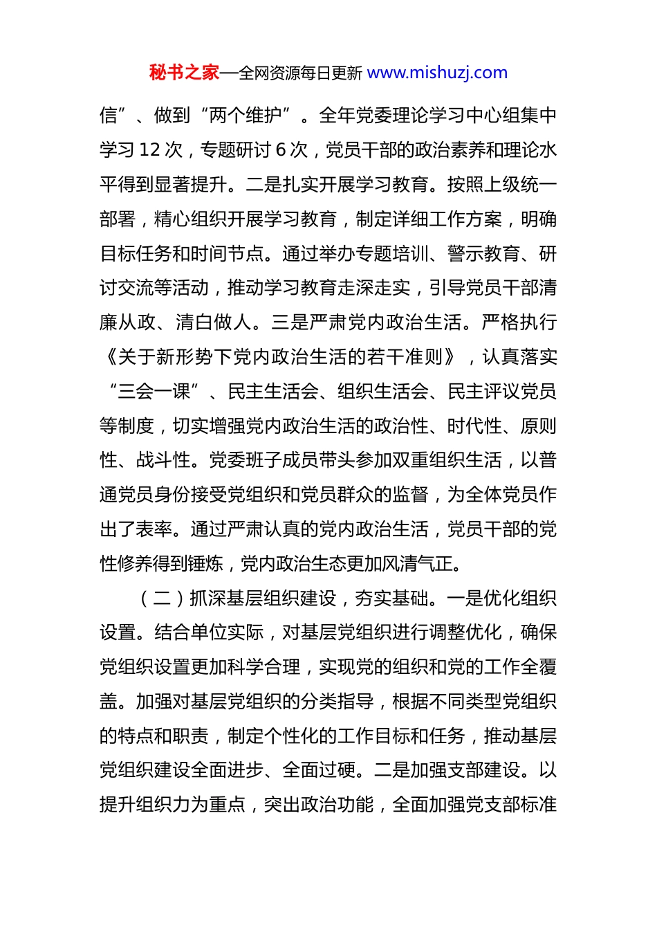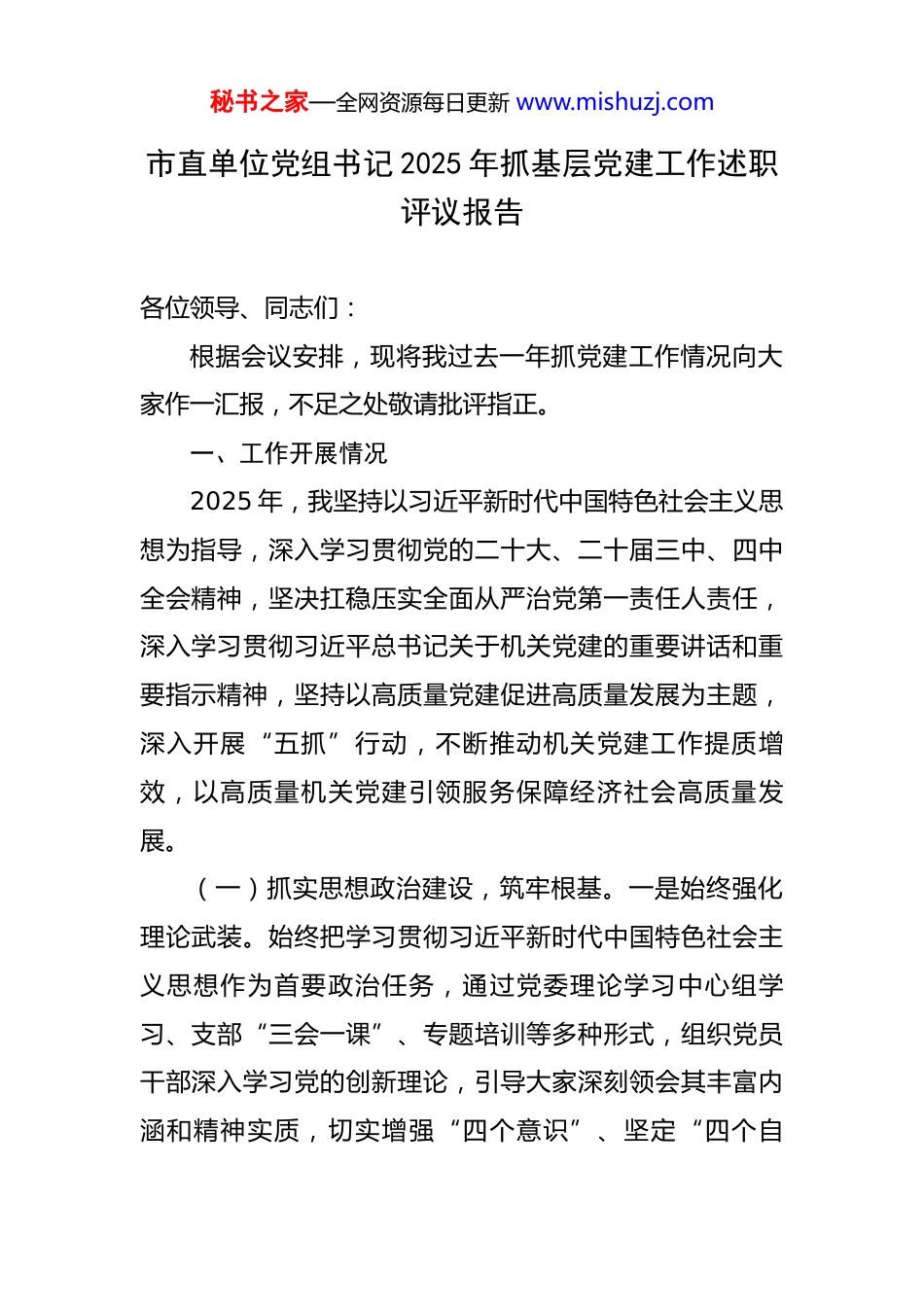 秘书之家—全网资源每日更新 www.mishuzj.com市直单位党组书记 2025 年抓基层党建工作述职评议报告 各位领导、同志们:根据会议安排,现将我过去一年抓党建工作情况向大家作一汇报,不足之处敬请批评指正。一、工作开展情况2025 年,我坚持以习近平新时代中国特色社会主义思想为指导,深入学习贯彻党的二十大、二十届三中、四中全会精神,坚决扛稳压实全面从严治党第一责任人责任,深入学习贯彻习近平总书记关于机关党建的重要讲话和重要指示精神,坚持以高质量党建促进高质量发展为主题,深入开展“五抓”行动,不断推动机关党建工作提质增效,以高质量机关党建引领服务保障经济社会高质量发展。(一)抓实思想政治建设,筑牢根基。一是始终强化理论武装。始终把学习贯彻习近平新时代中国特色社会主义思想作为首要政治任务,通过党委理论学习中心组学习、支部“三会一课”、专题培训等多种形式,组织党员干部深入学习党的创新理论,引导大家深刻领会其丰富内涵和精神实质,切实增强“四个意识”、坚定“四个自秘书之家—全网资源每日更新 www.mishuzj.com信”、做到“两个维护”。全年党委理论学习中心组集中学习 12 次,专题研讨 6 次,党员干部的政治素养和理论水平得到显著提升。二是扎实开展学习教育。按照上级统一部署,精心组织开展学习教育,制定详细工作方案,明确目标任务和时间节点。通过举办专题培训、警示教育、研讨交流等活动,推动学习教育走深走实,引导党员干部清廉从政、清白做人。三是严肃党内政治生活。严格执行《关于新形势下党内政治生活的若干准则》,认真落实“三会一课”、民主生活会、组织生活会、民主评议党员等制度,切实增强党内政治生活的政治性、时代性、原则性、战斗性。党委班子成员带头参加双重组织生活,以普通党员身份接受党组织和党员群众的监督,为全体党员作出了表率。通过严肃认真的党内政治生活,党员干部的党性修养得到锤炼,党内政治生态更加风清气正。(二)抓深基层组织建设,夯实基础。一是优化组织设置。结合单位实际,对基层党组织进行调整优化,确保党组织设置更加科学合理,实现党的组织和党的工作全覆盖。加强对基层党组织的分类指导,根据不同类型党组织的特点和职责,制定个性化的工作目标和任务,推动基层党组织建设全面进步、全面过硬。二是加强支部建设。以提升组织力为重点,突出政治功能,全面加强党支部标准秘书之家—全网资源每日更新 www.mishuzj.com化规范化建设。深入开展“五好党支部”创建活动,通过抓班子、带队伍、强阵地、建机制等措施,不断提升党支部建设质量。定期开展党支部书记培训,提高党支部书记抓党建工作的能力和水平。同时,加强对党支部工作的考核评价,将考核结果与党支部书记的评先评优、绩效考核挂钩,充分调动党支部书记的工作积极性和主动性。三是做好党员工作。坚持把政治标准放在首位,严格党员发展程序,确保新发展党员质量。加强对入党积极分子的教育培养,定期开展谈心谈话,及时掌握他们的思想动态,引导他们积极向党组织靠拢。全年共发展党员 13 名,为党组织注入了新的活力。同时,加强对党员的日常教育管理,建立健全党员积分制管理制度,通过量化考核,激励党员充分发挥先锋模范作用。积极开展党内关怀帮扶活动,关心关爱老党员、生活困难党员,增强党员的归属感和荣誉感。(三)抓牢干部队伍建设,提升素质。一是强化干部教育培训。制定年度干部教育培训计划,围绕政治理论、业务能力、领导艺术等方面,组织开展形式多样的培训活动。邀请专家学者举办专题讲座 8 场,组织干部参加各类培训班 12 期,培训干部 560 人次。通过教育培训,干部的思想观念得到更新,知识结构得到优化,业务能力得到秘书之家—全网资源每日更新 www.mishuzj.com提升,综合素质明显增强。二是加强干部选拔任用。坚持党管干部原则,严格贯彻执行《党政领导干部选拔任用工作条例》,树立正确选人用人导向,把政治过硬、本领高强、敢于担当、清正廉洁的干部选拔到领导岗位上来。在干部选拔任用过程中,严格履行民主推荐、考察公示等程序,确保选人用人工作的公开、公平、公正。全年共...