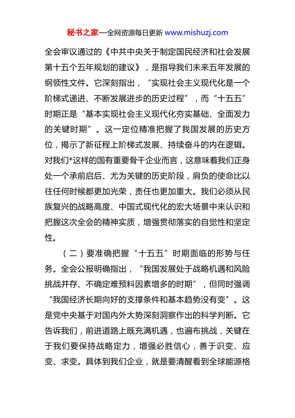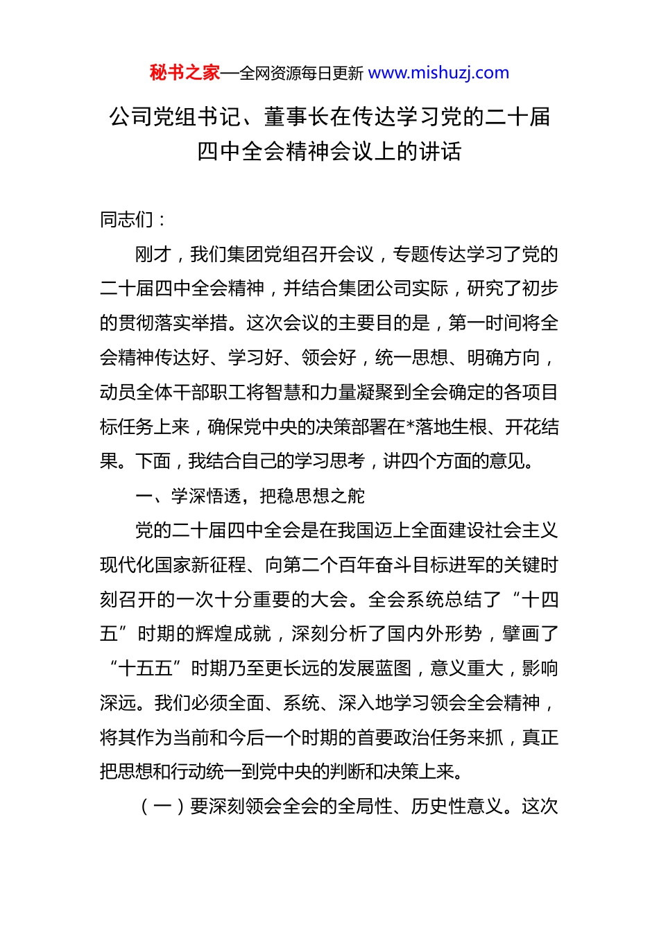 秘书之家—全网资源每日更新 www.mishuzj.com公司党组书记、董事长在传达学习党的二十届四中全会精神会议上的讲话 同志们:刚才,我们集团党组召开会议,专题传达学习了党的二十届四中全会精神,并结合集团公司实际,研究了初步的贯彻落实举措。这次会议的主要目的是,第一时间将全会精神传达好、学习好、领会好,统一思想、明确方向,动员全体干部职工将智慧和力量凝聚到全会确定的各项目标任务上来,确保党中央的决策部署在*落地生根、开花结果。下面,我结合自己的学习思考,讲四个方面的意见。一、学深悟透,把稳思想之舵党的二十届四中全会是在我国迈上全面建设社会主义现代化国家新征程、向第二个百年奋斗目标进军的关键时刻召开的一次十分重要的大会。全会系统总结了“十四五”时期的辉煌成就,深刻分析了国内外形势,擘画了“十五五”时期乃至更长远的发展蓝图,意义重大,影响深远。我们必须全面、系统、深入地学习领会全会精神,将其作为当前和今后一个时期的首要政治任务来抓,真正把思想和行动统一到党中央的判断和决策上来。(一)要深刻领会全会的全局性、历史性意义。这次秘书之家—全网资源每日更新 www.mishuzj.com全会审议通过的《中共中央关于制定国民经济和社会发展第十五个五年规划的建议》,是指导我们未来五年发展的纲领性文件。它深刻指出,“实现社会主义现代化是一个阶梯式递进、不断发展进步的历史过程”,而“十五五”时期正是“基本实现社会主义现代化夯实基础、全面发力的关键时期”。这一定位精准把握了我国发展的历史方位,揭示了新征程上阶梯式发展、持续奋斗的内在逻辑。对我们*这样的国有重要骨干企业而言,这意味着我们正身处一个承前启后、尤为关键的历史阶段,肩负的使命比以往任何时候都更加光荣,责任也更加重大。我们必须从民族复兴的战略高度、中国式现代化的宏大场景中来认识和把握这次全会的精神实质,增强贯彻落实的自觉性和坚定性。(二)要准确把握“十五五”时期面临的形势与任务。全会公报明确指出,“我国发展处于战略机遇和风险挑战并存、不确定难预料因素增多的时期”,但同时强调“我国经济长期向好的支撑条件和基本趋势没有变”。这是党中央基于对国内外大势深刻洞察作出的科学判断。它告诉我们,前进道路上既充满机遇,也遍布挑战,关键在于我们要保持战略定力,增强必胜信心,善于识变、应变、求变。具体到我们企业,就是要清醒看到全球能源格秘书之家—全网资源每日更新 www.mishuzj.com局深刻调整、科技革命加速演进带来的机遇,也要直面关键核心技术攻关、产业链供应链韧性提升等方面的挑战。我们要把困难估计得更充分一些,把风险思考得更深入一些,同时更要看到我国经济韧性强、潜力大、活力足,特别是拥有中国特色社会主义制度优势、超大规模市场优势、完整产业体系优势和丰富人才资源优势,这些为我们应对风险挑战、赢得发展主动提供了坚实基础和有利条件。(三)要系统理解中国式现代化的核心内涵与实践要求。全会围绕“以中国式现代化全面推进强国建设、民族复兴伟业”进行了全面部署。中国式现代化是涵盖经济、政治、文化、社会、生态文明等各个方面的宏大系统工程。对于我们装备制造企业,要特别聚焦全会在高质量发展、科技自立自强、现代化产业体系建设、绿色低碳转型、共同富裕等方面提出的明确要求。例如,全会将“高质量发展取得显著成效”置于“十五五”时期经济社会发展主要目标的首位,强调“必须坚持高质量发展”;提出“加快高水平科技自立自强,引领发展新质生产力”;要求“坚持把发展经济的着力点放在实体经济上”,加快建设制造强国、质量强国等;部署“加快经济社会发展全面绿色转型,建设美丽中国”;明确“加大保障和改善民生秘书之家—全网资源每日更新 www.mishuzj.com力度,扎实推进全体人民共同富裕”。这些都需要我们融会贯通,结合主责主业,找到切入点和着力点。(四)要坚决扛起“大国重器”的使命担当。*集团作为党和国家在能源装备制造领域的“国家队”、“排头兵”,在服务国家战略中具有不可替代的作用。回顾“十四五”,我们正是在党的坚强领导下,顶住压力,迎难而上,推...
