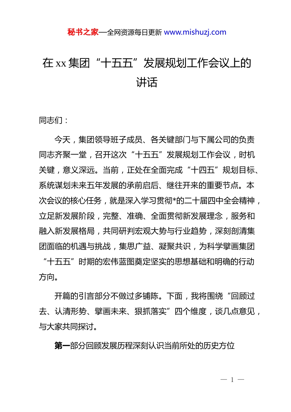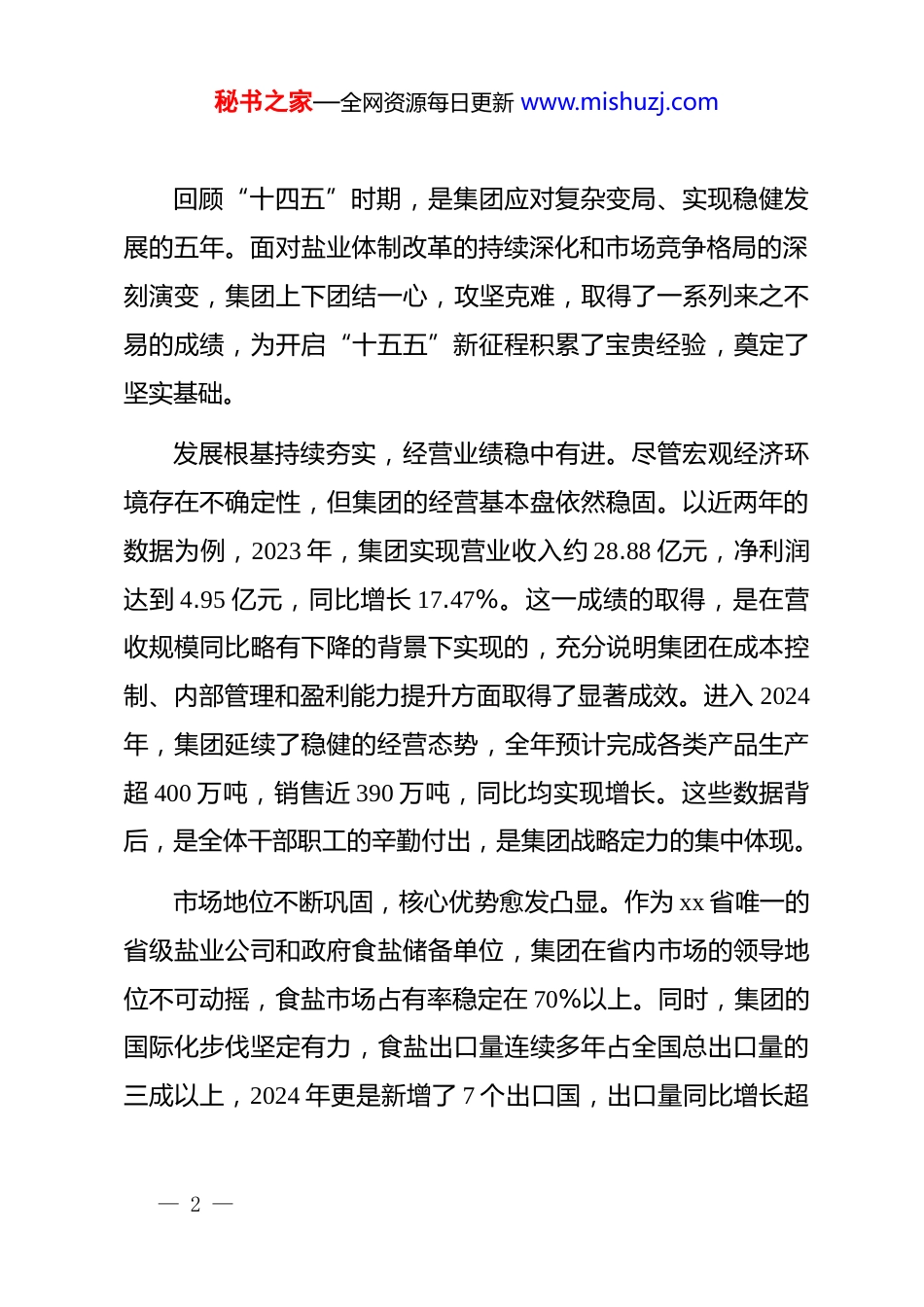 秘书之家—全网资源每日更新 www.mishuzj.com在 xx 集团“十五五”发展规划工作会议上的讲话同志们:今天,集团领导班子成员、各关键部门与下属公司的负责同志齐聚一堂,召开这次“十五五”发展规划工作会议,时机关键,意义深远。当前,正处在全面完成“十四五”规划目标、系统谋划未来五年发展的承前启后、继往开来的重要节点。本次会议的核心任务,就是深入学习贯彻*的二十届四中全会精神,立足新发展阶段,完整、准确、全面贯彻新发展理念,服务和融入新发展格局,共同研判宏观大势与行业趋势,深刻剖清集团面临的机遇与挑战,集思广益、凝聚共识,为科学擘画集团“十五五”时期的宏伟蓝图奠定坚实的思想基础和明确的行动方向。开篇的引言部分不做过多铺陈。下面,我将围绕“回顾过去、认清形势、擘画未来、狠抓落实”四个维度,谈几点意见,与大家共同探讨。第一部分回顾发展历程深刻认识当前所处的历史方位— 1 —秘书之家—全网资源每日更新 www.mishuzj.com回顾“十四五”时期,是集团应对复杂变局、实现稳健发展的五年。面对盐业体制改革的持续深化和市场竞争格局的深刻演变,集团上下团结一心,攻坚克难,取得了一系列来之不易的成绩,为开启“十五五”新征程积累了宝贵经验,奠定了坚实基础。发展根基持续夯实,经营业绩稳中有进。尽管宏观经济环境存在不确定性,但集团的经营基本盘依然稳固。以近两年的数据为例,2023 年,集团实现营业收入约 28.88 亿元,净利润达到 4.95 亿元,同比增长 17.47%。这一成绩的取得,是在营收规模同比略有下降的背景下实现的,充分说明集团在成本控制、内部管理和盈利能力提升方面取得了显著成效。进入 2024年,集团延续了稳健的经营态势,全年预计完成各类产品生产超 400 万吨,销售近 390 万吨,同比均实现增长。这些数据背后,是全体干部职工的辛勤付出,是集团战略定力的集中体现。市场地位不断巩固,核心优势愈发凸显。作为 xx 省唯一的省级盐业公司和政府食盐储备单位,集团在省内市场的领导地位不可动摇,食盐市场占有率稳定在 70%以上。同时,集团的国际化步伐坚定有力,食盐出口量连续多年占全国总出口量的三成以上,2024 年更是新增了 7 个出口国,出口量同比增长超— 2 —秘书之家—全网资源每日更新 www.mishuzj.com过 23%这充分证明了 xx 盐品在全球市场上的品牌影响力和产品竞争力。产业结构优化调整,多元布局初见成效。集团清晰地认识到,单纯依靠传统盐产品难以支撑长远发展。因此,在“十四五”期间,对产业结构进行了积极的探索与调整。从收入构成看,2023 年纯碱业务收入已达 14.53 亿元,占据营业收入的半壁江山,成为拉动增长的重要引擎。食用盐业务同样表现亮眼,收入同比增长超过 12%显示出品牌建设与市场拓展的成果。工业盐、元明粉、小苏打等盐化工产品链条不断延伸初步形成了盐业主导、盐化并举、多点支撑的产业新格局。在肯定成绩的同时,必须清醒地、深刻地认识到前进道路上存在的矛盾与挑战。正如在之前的务虚会上深入探讨的那样,当前集团正面临着市场供需阶段性失衡与产品价格持续下行的双重压力。一是市场竞争的白热化。自 2016 年《盐业体制改革方案》实施以来市场准入门槛降低,跨区域经营成为常态,各类资本纷纷涌入,盐行业的竞争已经从区域性竞争演变为全国性乃至全球性的全方位竞争。价格战、渠道战、品牌战此起彼伏,对集团传统的市场份额和盈利空间构成了严峻挑战。— 3 —秘书之家—全网资源每日更新 www.mishuzj.com二是产业升级的紧迫性。当前集团的产品结构仍以大宗原料型产品为主,附加值有待提升。在国家大力推动高质量发展和绿色转型的背景下,传统盐化工产业面临着能耗、环保、安全等多重约束。如何加快技术迭代,延伸产业链,向精细化、高端化、绿色化方向转型,是必须破解的时代课题。三是内部管理的精细化。随着企业规模的扩大和业务的多元化,原有的管理模式、组织架构和人才体系面临新的考验。如何通过数字化转型提升运营效率,如何建立更加科学的激励与约束机制,如何培养一支能够适应未来发展需要的高素质专业化人才队伍,都是摆在面前...