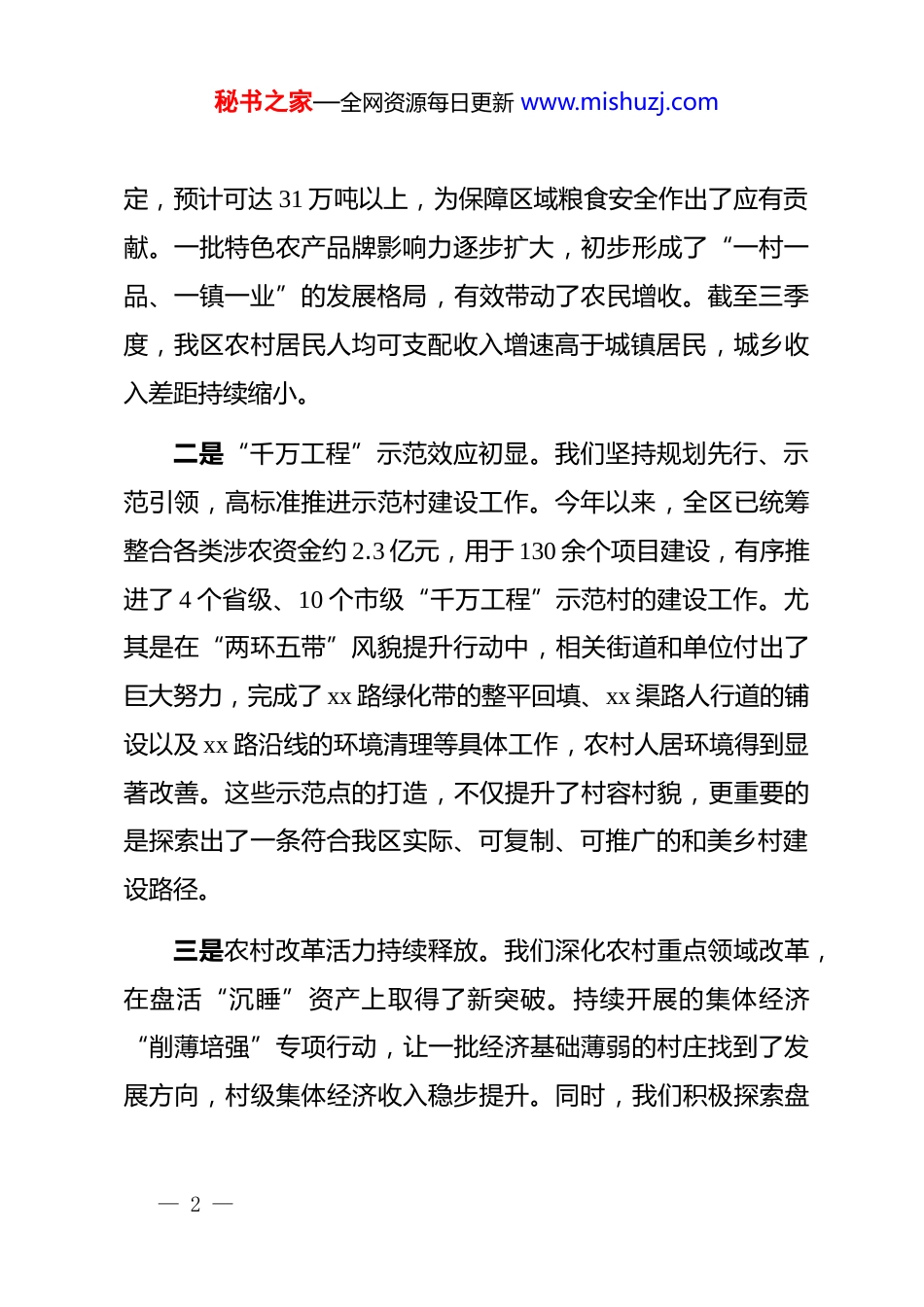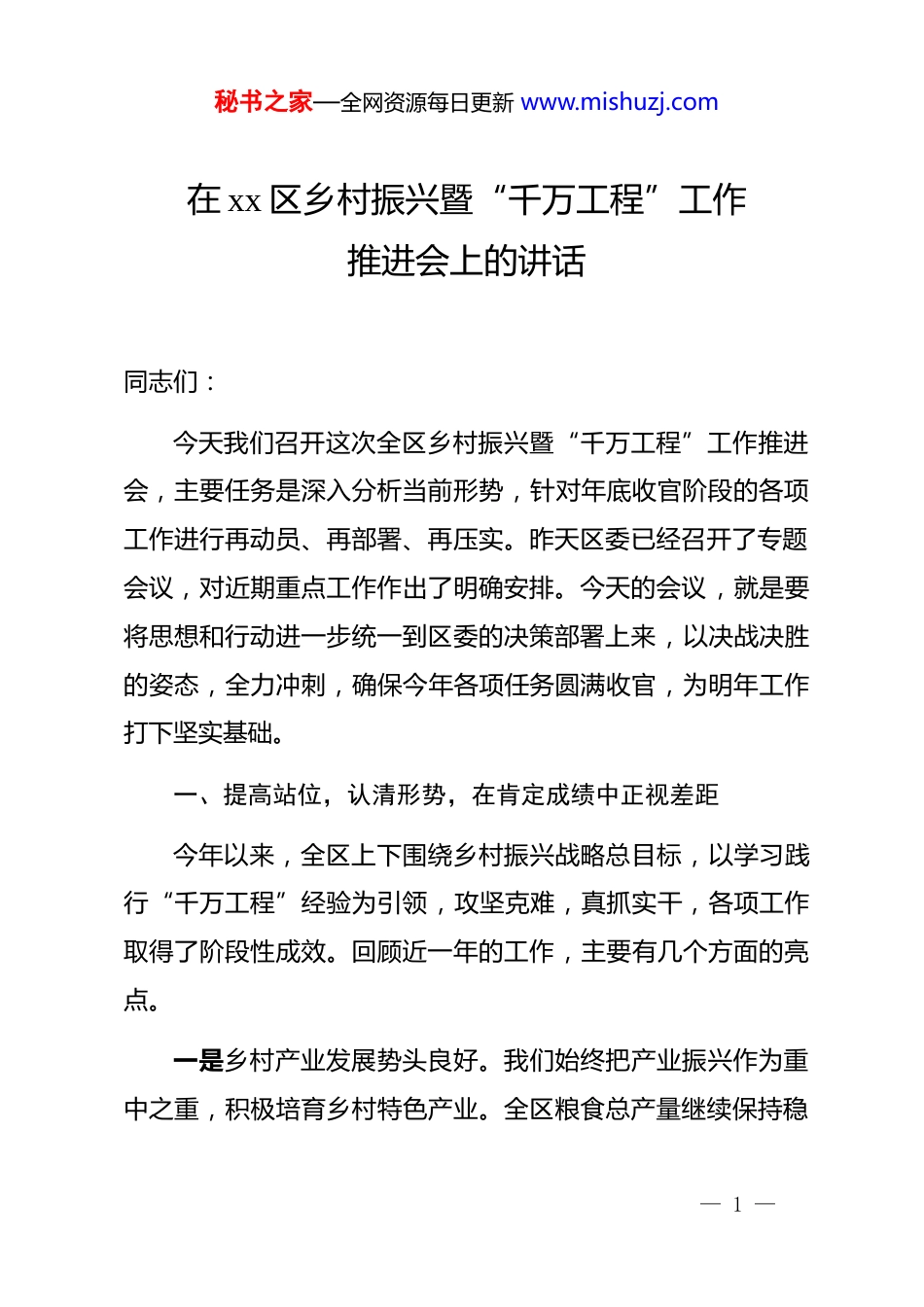 秘书之家—全网资源每日更新 www.mishuzj.com在 xx 区乡村振兴暨“千万工程”工作推进会上的讲话同志们:今天我们召开这次全区乡村振兴暨“千万工程”工作推进会,主要任务是深入分析当前形势,针对年底收官阶段的各项工作进行再动员、再部署、再压实。昨天区委已经召开了专题会议,对近期重点工作作出了明确安排。今天的会议,就是要将思想和行动进一步统一到区委的决策部署上来,以决战决胜的姿态,全力冲刺,确保今年各项任务圆满收官,为明年工作打下坚实基础。一、提高站位,认清形势,在肯定成绩中正视差距今年以来,全区上下围绕乡村振兴战略总目标,以学习践行“千万工程”经验为引领,攻坚克难,真抓实干,各项工作取得了阶段性成效。回顾近一年的工作,主要有几个方面的亮点。一是乡村产业发展势头良好。我们始终把产业振兴作为重中之重,积极培育乡村特色产业。全区粮食总产量继续保持稳— 1 —秘书之家—全网资源每日更新 www.mishuzj.com定,预计可达 31 万吨以上,为保障区域粮食安全作出了应有贡献。一批特色农产品牌影响力逐步扩大,初步形成了“一村一品、一镇一业”的发展格局,有效带动了农民增收。截至三季度,我区农村居民人均可支配收入增速高于城镇居民,城乡收入差距持续缩小。二是“千万工程”示范效应初显。我们坚持规划先行、示范引领,高标准推进示范村建设工作。今年以来,全区已统筹整合各类涉农资金约 2.3 亿元,用于 130 余个项目建设,有序推进了 4 个省级、10 个市级“千万工程”示范村的建设工作。尤其是在“两环五带”风貌提升行动中,相关街道和单位付出了巨大努力,完成了 xx 路绿化带的整平回填、xx 渠路人行道的铺设以及 xx 路沿线的环境清理等具体工作,农村人居环境得到显著改善。这些示范点的打造,不仅提升了村容村貌,更重要的是探索出了一条符合我区实际、可复制、可推广的和美乡村建设路径。三是农村改革活力持续释放。我们深化农村重点领域改革,在盘活“沉睡”资产上取得了新突破。持续开展的集体经济“削薄培强”专项行动,让一批经济基础薄弱的村庄找到了发展方向,村级集体经济收入稳步提升。同时,我们积极探索盘— 2 —秘书之家—全网资源每日更新 www.mishuzj.com活利用农村闲置宅基地和闲置住宅的有效途径,吸引社会资本参与乡村建设,为乡村发展注入了新的动能。在肯定成绩的同时,我们更要清醒地看到,对照高质量发展的要求,对照上级的考核指标,对照群众的殷切期盼,我们的工作还存在不少短板和弱项。主要表现在:一是发展不平衡的问题依然突出,部分村庄的产业基础还很薄弱,集体经济收入来源单一,持续增收能力不强;二是一些重点项目推进速度不及预期,特别是部分 2025 年中央和省级衔接资金项目,建设进度有待加快,资金使用效益有待提高;三是长效管护机制尚不健全,一些地方存在“重建轻管”现象,环境整治成果巩固难,存在反弹风险;四是城乡融合发展的深度和广度还有待拓展,公共服务下沉的力度和精准度需要进一步加强。这些问题,都是我们下一步工作中必须集中力量攻克的“硬骨头”。二、聚焦重点,精准发力,在攻坚克难中展现担当现在距离年底只剩下不到 40 天时间,各项工作已经进入了倒计时。越是到冲刺阶段,越要保持定力、精准发力。各镇街、各部门要紧紧围绕既定目标,集中优势兵力,打好歼灭战,确保各项工作落地见效。— 3 —秘书之家—全网资源每日更新 www.mishuzj.com第一,全力以赴抓好考核收官,确保年度任务高质量完成。乡村振兴战略实绩考核,既是对我们一年工作的全面检验,也是争取上级政策和资金支持的重要依据。这项工作的重要性与紧迫性,怎么强调都不过分。各相关单位要立即行动起来,对照考核指标体系,逐条逐项进行“回头看”,全面梳理盘点。哪些是优势项,要巩固提升、确保不失分;哪些是弱势项,要分析原因、靶向施策、迎头赶上。要建立问题清单、责任清单、时限清单,实行销号管理。区委农办要发挥好牵头抓总作用,加强与上级部门的对接沟通,及时掌握考核动态,同时要加大对基层的督促指导力度,确保在最后的时间里,把短板补齐、把弱项加固,向...