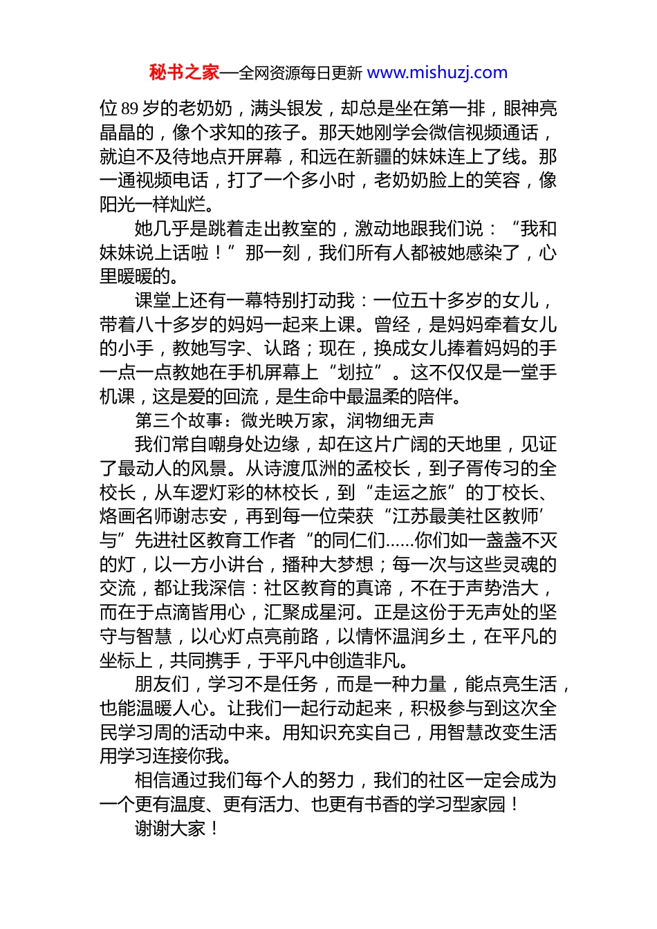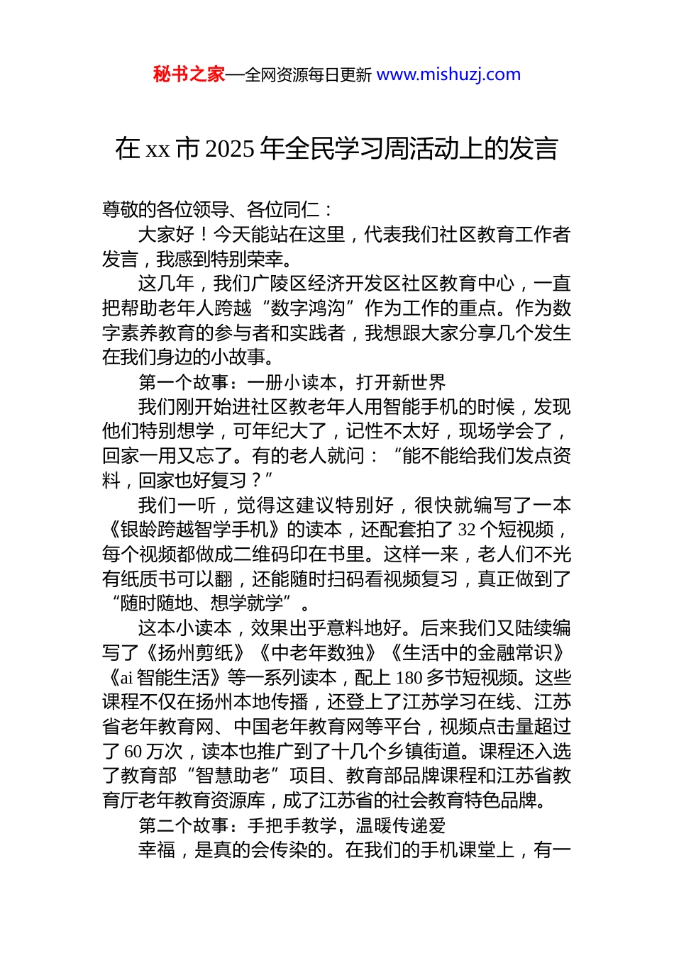 秘书之家—全网资源每日更新 www.mishuzj.com在 xx 市 2025 年全民学习周活动上的发言尊敬的各位领导、各位同仁:大家好!今天能站在这里,代表我们社区教育工作者发言,我感到特别荣幸。这几年,我们广陵区经济开发区社区教育中心,一直把帮助老年人跨越“数字鸿沟”作为工作的重点。作为数字素养教育的参与者和实践者,我想跟大家分享几个发生在我们身边的小故事。第一个故事:一册小读本,打开新世界我们刚开始进社区教老年人用智能手机的时候,发现他们特别想学,可年纪大了,记性不太好,现场学会了,回家一用又忘了。有的老人就问:“能不能给我们发点资料,回家也好复习?”我们一听,觉得这建议特别好,很快就编写了一本《银龄跨越智学手机》的读本,还配套拍了 32 个短视频,每个视频都做成二维码印在书里。这样一来,老人们不光有纸质书可以翻,还能随时扫码看视频复习,真正做到了“随时随地、想学就学”。这本小读本,效果出乎意料地好。后来我们又陆续编写了《扬州剪纸》《中老年数独》《生活中的金融常识》《ai 智能生活》等一系列读本,配上 180 多节短视频。这些课程不仅在扬州本地传播,还登上了江苏学习在线、江苏省老年教育网、中国老年教育网等平台,视频点击量超过了 60 万次,读本也推广到了十几个乡镇街道。课程还入选了教育部“智慧助老”项目、教育部品牌课程和江苏省教育厅老年教育资源库,成了江苏省的社会教育特色品牌。第二个故事:手把手教学,温暖传递爱幸福,是真的会传染的。在我们的手机课堂上,有一秘书之家—全网资源每日更新 www.mishuzj.com位 89 岁的老奶奶,满头银发,却总是坐在第一排,眼神亮晶晶的,像个求知的孩子。那天她刚学会微信视频通话,就迫不及待地点开屏幕,和远在新疆的妹妹连上了线。那一通视频电话,打了一个多小时,老奶奶脸上的笑容,像阳光一样灿烂。她几乎是跳着走出教室的,激动地跟我们说:“我和妹妹说上话啦!”那一刻,我们所有人都被她感染了,心里暖暖的。课堂上还有一幕特别打动我:一位五十多岁的女儿,带着八十多岁的妈妈一起来上课。曾经,是妈妈牵着女儿的小手,教她写字、认路;现在,换成女儿捧着妈妈的手一点一点教她在手机屏幕上“划拉”。这不仅仅是一堂手机课,这是爱的回流,是生命中最温柔的陪伴。第三个故事:微光映万家,润物细无声我们常自嘲身处边缘,却在这片广阔的天地里,见证了最动人的风景。从诗渡瓜洲的孟校长,到子胥传习的全校长,从车逻灯彩的林校长,到“走运之旅”的丁校长、烙画名师谢志安,再到每一位荣获“江苏最美社区教师’与”先进社区教育工作者“的同仁们……你们如一盏盏不灭的灯,以一方小讲台,播种大梦想;每一次与这些灵魂的交流,都让我深信:社区教育的真谛,不在于声势浩大,而在于点滴皆用心,汇聚成星河。正是这份于无声处的坚守与智慧,以心灯点亮前路,以情怀温润乡土,在平凡的坐标上,共同携手,于平凡中创造非凡。朋友们,学习不是任务,而是一种力量,能点亮生活,也能温暖人心。让我们一起行动起来,积极参与到这次全民学习周的活动中来。用知识充实自己,用智慧改变生活用学习连接你我。相信通过我们每个人的努力,我们的社区一定会成为一个更有温度、更有活力、也更有书香的学习型家园!谢谢大家!秘书之家—全网资源每日更新 www.mishuzj.com