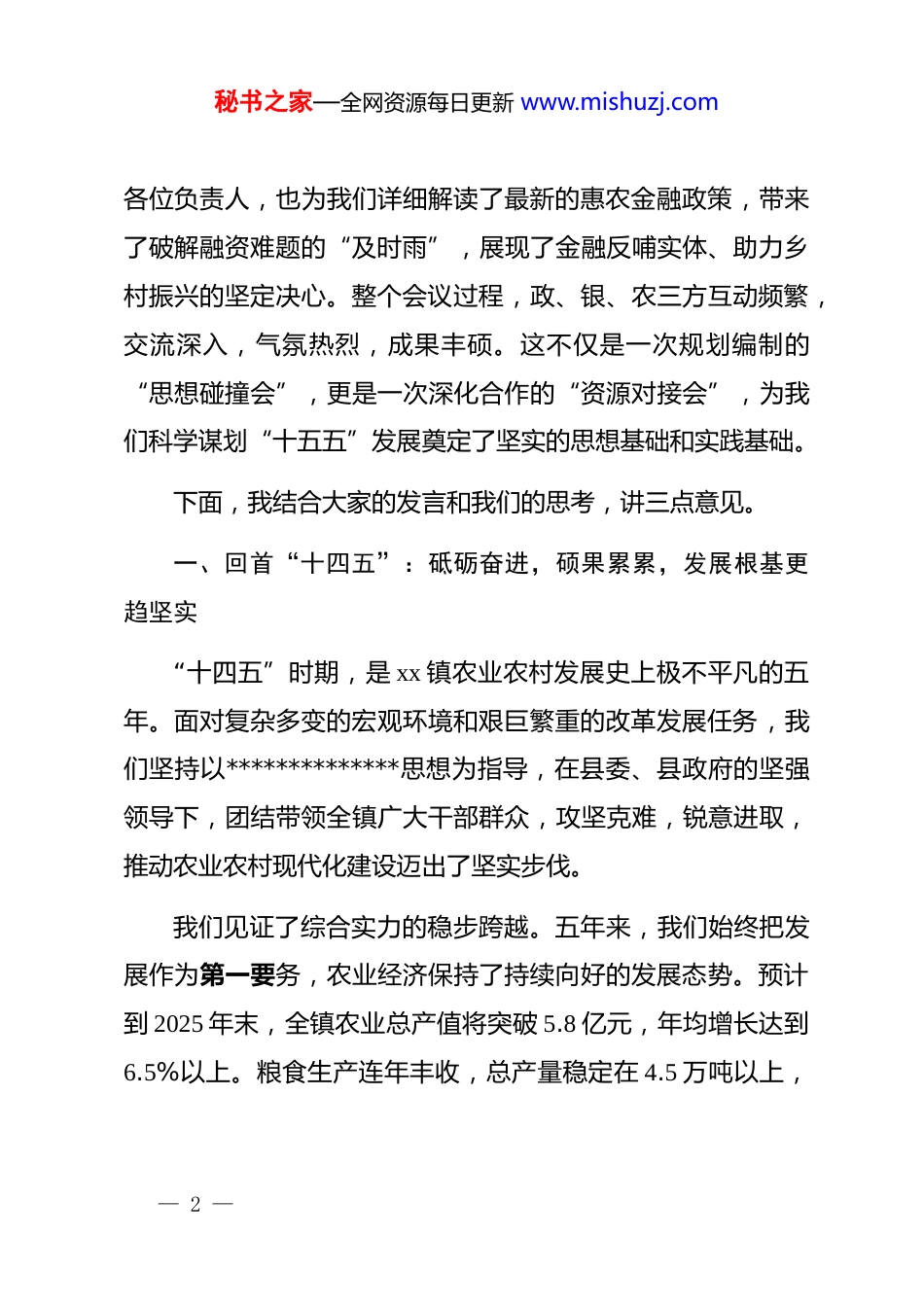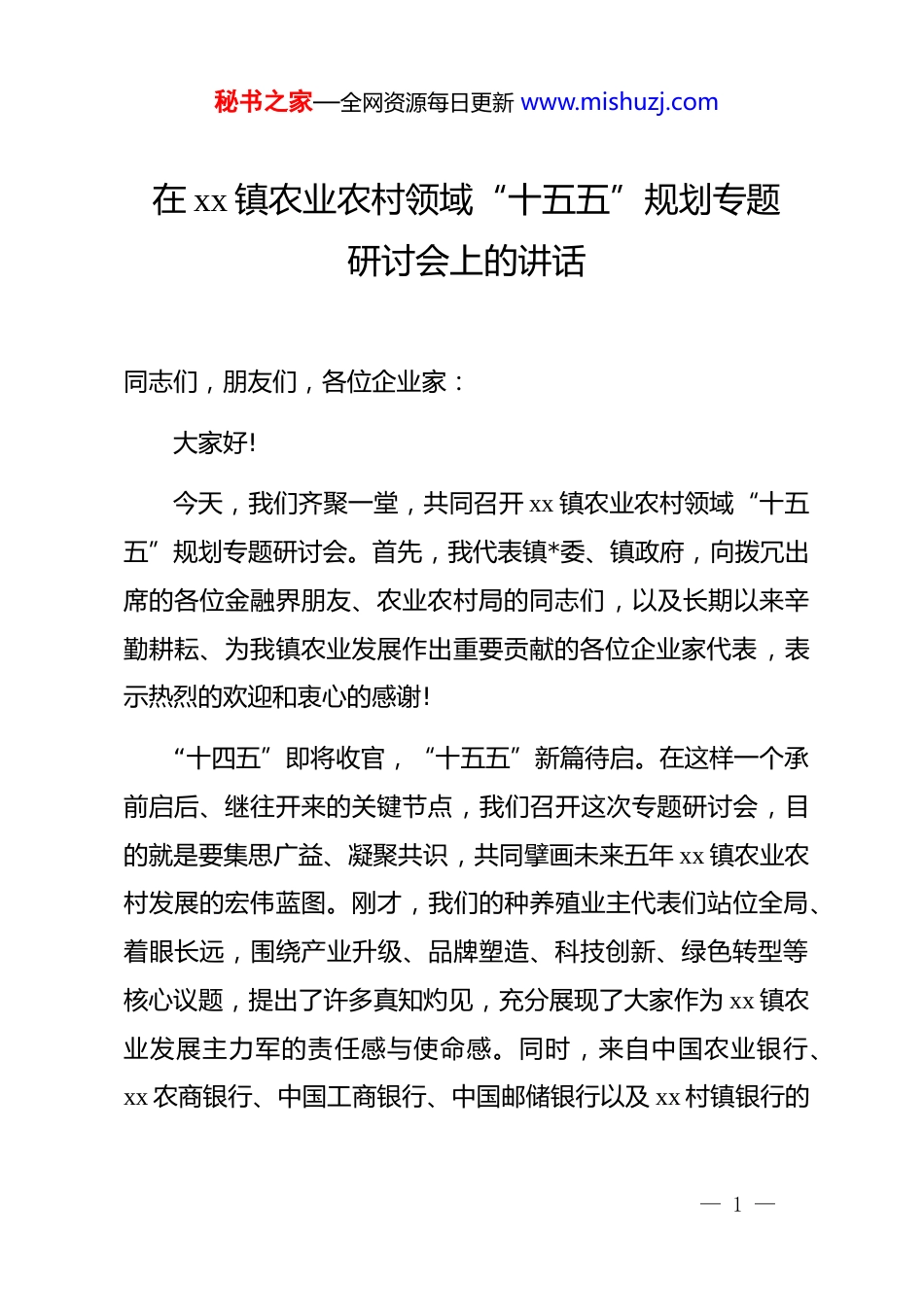 秘书之家—全网资源每日更新 www.mishuzj.com在 xx 镇农业农村领域“十五五”规划专题研讨会上的讲话同志们,朋友们,各位企业家:大家好!今天,我们齐聚一堂,共同召开 xx 镇农业农村领域“十五五”规划专题研讨会。首先,我代表镇*委、镇政府,向拨冗出席的各位金融界朋友、农业农村局的同志们,以及长期以来辛勤耕耘、为我镇农业发展作出重要贡献的各位企业家代表,表示热烈的欢迎和衷心的感谢!“十四五”即将收官,“十五五”新篇待启。在这样一个承前启后、继往开来的关键节点,我们召开这次专题研讨会,目的就是要集思广益、凝聚共识,共同擘画未来五年 xx 镇农业农村发展的宏伟蓝图。刚才,我们的种养殖业主代表们站位全局、着眼长远,围绕产业升级、品牌塑造、科技创新、绿色转型等核心议题,提出了许多真知灼见,充分展现了大家作为 xx 镇农业发展主力军的责任感与使命感。同时,来自中国农业银行、xx 农商银行、中国工商银行、中国邮储银行以及 xx 村镇银行的— 1 —秘书之家—全网资源每日更新 www.mishuzj.com各位负责人,也为我们详细解读了最新的惠农金融政策,带来了破解融资难题的“及时雨”,展现了金融反哺实体、助力乡村振兴的坚定决心。整个会议过程,政、银、农三方互动频繁,交流深入,气氛热烈,成果丰硕。这不仅是一次规划编制的“思想碰撞会”,更是一次深化合作的“资源对接会”,为我们科学谋划“十五五”发展奠定了坚实的思想基础和实践基础。下面,我结合大家的发言和我们的思考,讲三点意见。一、回首“十四五”:砥砺奋进,硕果累累,发展根基更趋坚实“十四五”时期,是 xx 镇农业农村发展史上极不平凡的五年。面对复杂多变的宏观环境和艰巨繁重的改革发展任务,我们坚持以**************思想为指导,在县委、县政府的坚强领导下,团结带领全镇广大干部群众,攻坚克难,锐意进取,推动农业农村现代化建设迈出了坚实步伐。我们见证了综合实力的稳步跨越。五年来,我们始终把发展作为第一要务,农业经济保持了持续向好的发展态势。预计到 2025 年末,全镇农业总产值将突破 5.8 亿元,年均增长达到6.5%以上。粮食生产连年丰收,总产量稳定在 4.5 万吨以上,— 2 —秘书之家—全网资源每日更新 www.mishuzj.com牢牢守住了粮食安全底线。特色优势产业不断壮大,我们的精品水果种植面积超过 2 万亩,优质蔬菜基地规模达到 1.5 万亩,生猪、家禽等养殖业规模化、标准化水平显著提升。农民的“钱袋子”越来越鼓,农村居民人均可支配收入预计将超过 2.8万元,增速连续多年高于经济增长水平。这一系列沉甸甸的数据,是我们共同奋斗的最好见证。我们推动了产业结构的深度优化。我们坚持跳出传统农业的思维定式,大力推进农业供给侧结构性改革。一方面,调优产品结构,积极发展高附加值的特色农产品,改变了过去单一的、低效的种植模式。另一方面,延伸产业链条,大力支持农产品初加工、精深加工,农产品加工转化率逐年提高。我们还积极探索农文旅融合发展新路径,依托优美的田园风光和特色农业园区,成功打造了数个集采摘体验、休闲观光、科普教育于一体的乡村旅游点,实现了“接二连三”的产业融合发展,为农业增效、农民增收开辟了新空间。我们夯实了现代农业的发展基础。五年来,我们累计投入超过 1.2 亿元,大力实施高标准农田建设、农业水利设施提升等工程,建成高标准农田 3.5 万亩,有效灌溉面积占比超过85%,农业生产抵御自然灾害的能力显著增强。我们积极推广— 3 —秘书之家—全网资源每日更新 www.mishuzj.com农业机械化和智能化,主要农作物耕种收综合机械化率达到78%。科技对农业的贡献率持续攀升,新品种、新技术的引进和应用,为我们的农业生产插上了科技的翅膀。我们绘就了和美乡村的崭新画卷。我们深入推进农村人居环境整治,生活垃圾无害化处理率、卫生厕所普及率大幅提升,村容村貌焕然一新。乡村治理效能不断增强,文明乡风、良好家风、淳朴民风蔚然成形,群众的获得感、幸福感、安全感更加充实。在肯定成绩的同时,我们也要清醒地看到,对标农业强国建设和乡村全面振兴的更高要求,我镇农业农村...