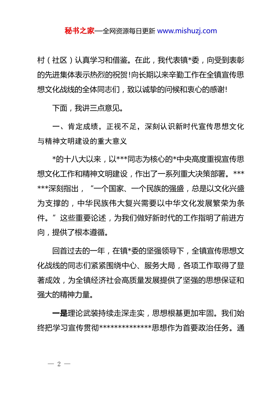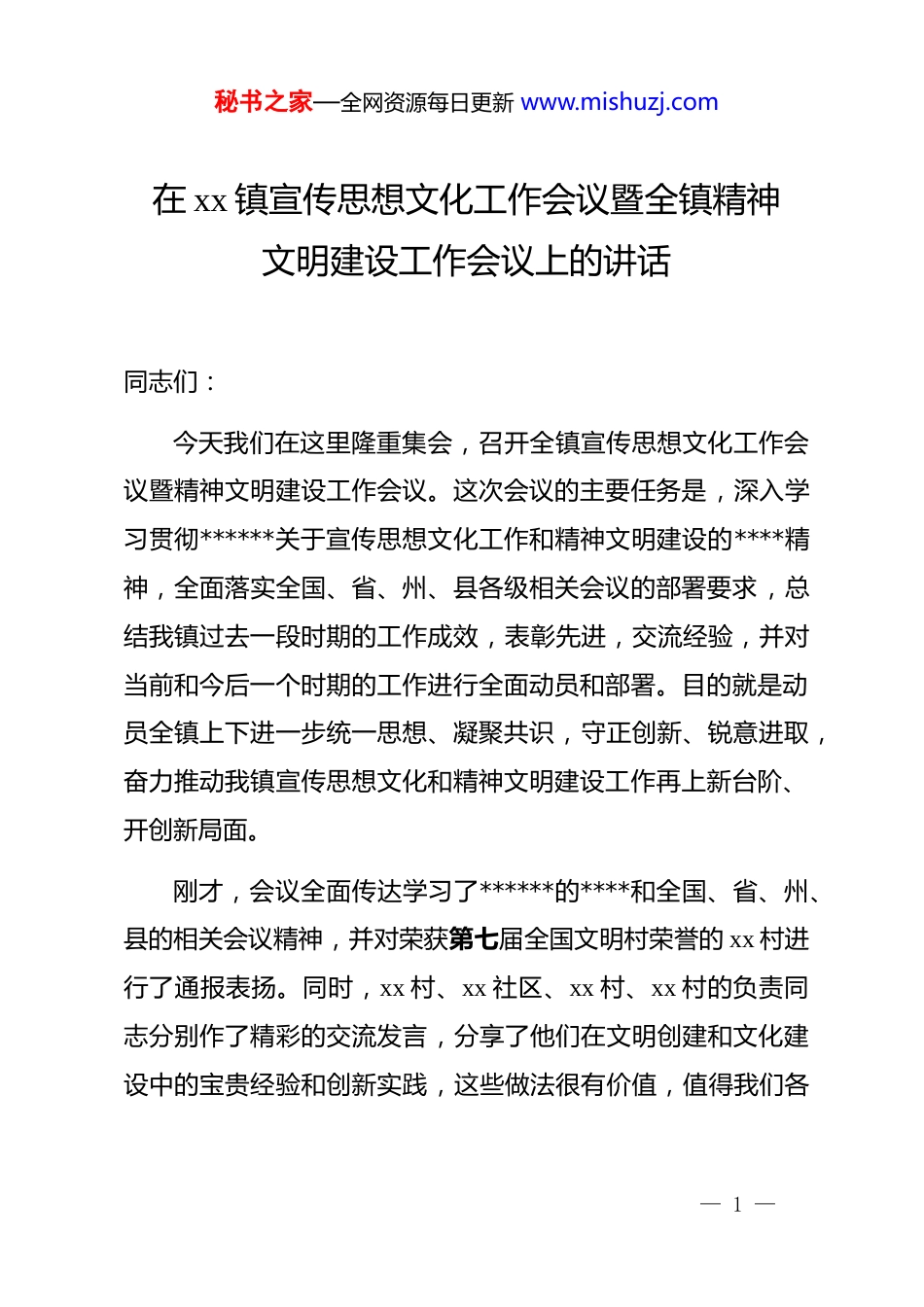 秘书之家—全网资源每日更新 www.mishuzj.com在 xx 镇宣传思想文化工作会议暨全镇精神文明建设工作会议上的讲话同志们:今天我们在这里隆重集会,召开全镇宣传思想文化工作会议暨精神文明建设工作会议。这次会议的主要任务是,深入学习贯彻******关于宣传思想文化工作和精神文明建设的****精神,全面落实全国、省、州、县各级相关会议的部署要求,总结我镇过去一段时期的工作成效,表彰先进,交流经验,并对当前和今后一个时期的工作进行全面动员和部署。目的就是动员全镇上下进一步统一思想、凝聚共识,守正创新、锐意进取,奋力推动我镇宣传思想文化和精神文明建设工作再上新台阶、开创新局面。刚才,会议全面传达学习了******的****和全国、省、州、县的相关会议精神,并对荣获第七届全国文明村荣誉的 xx 村进行了通报表扬。同时,xx 村、xx 社区、xx 村、xx 村的负责同志分别作了精彩的交流发言,分享了他们在文明创建和文化建设中的宝贵经验和创新实践,这些做法很有价值,值得我们各— 1 —秘书之家—全网资源每日更新 www.mishuzj.com村(社区)认真学习和借鉴。在此,我代表镇*委,向受到表彰的先进集体表示热烈的祝贺!向长期以来辛勤工作在全镇宣传思想文化战线的全体同志们,致以诚挚的问候和衷心的感谢!下面,我讲三点意见。一、肯定成绩,正视不足,深刻认识新时代宣传思想文化与精神文明建设的重大意义*的十八大以来,以***同志为核心的*中央高度重视宣传思想文化工作和精神文明建设,作出了一系列重大决策部署。******深刻指出,“一个国家、一个民族的强盛,总是以文化兴盛为支撑的,中华民族伟大复兴需要以中华文化发展繁荣为条件。”这些重要论述,为我们做好新时代的工作指明了前进方向,提供了根本遵循。回首过去的一年,在镇*委的坚强领导下,全镇宣传思想文化战线的同志们紧紧围绕中心、服务大局,各项工作取得了显著成效,为全镇经济社会高质量发展提供了坚强的思想保证和强大的精神力量。一是理论武装持续走深走实,思想根基更加牢固。我们始终把学习宣传贯彻**************思想作为首要政治任务。通— 2 —秘书之家—全网资源每日更新 www.mishuzj.com过*委理论学习中心组示范学、干部职工集中学、基层*组织常态学等多种形式,深入学习*的二十大和二十届三中、四中全会精神。全镇累计开展各类宣讲活动超过 150 场次,覆盖*员干部群众近万人次。我们创新打造了“田间课堂”“庭院*课”等接地气的理论宣传品牌,让*的创新理论“飞入寻常百姓家”,有效引导了全镇广大干部群众深刻领悟“两个确立”的决定性意义,增强“四个意识”、坚定“四个自信”、做到“两个维护”的思想自觉和行动自觉日益增强。二是精神文明创建成果丰硕,社会风尚焕然一新。我们坚持把精神文明建设贯穿于改革发展全过程、社会生活各方面。去年,我们成功创建了第七届全国文明村 xx 村,这是我镇精神文明建设工作的重大突破,极大地振奋了全镇人民的士气。同时,我们扎实推进第八届全国文明村、文明单位的创建工作,对 xx 村和 xx 社区的创建体系建设给予了重点指导和支持。全镇范围内广泛开展“文明家庭”“身边好人”“道德模范”等评选活动,涌现出一大批可敬可学的先进典型。各村(社区)的村规民约、红白理事会等制度不断完善,移风易俗工作取得积极进展,铺张浪费、大操大办等陈规陋习得到有效遏制,文明健康、绿色环保的生活方式蔚然成风。— 3 —秘书之家—全网资源每日更新 www.mishuzj.com三是文化惠民服务提质增效,群众生活更加多彩。我们坚持以人民为中心的工作导向,着力满足群众日益增长的精神文化需求。过去一年,我们深入挖掘我镇独特的历史文化和民俗文化资源,成功打造了“xx 民俗文化节”等具有地方特色的文化品牌。全镇共组织开展了超过 860 场形式多样的文化惠民活动,包括文艺演出、广场舞比赛、书画展览、电影放映等,吸引了数万名群众热情参与。镇综合文化站和各村(社区)的农家书屋、文化活动室功能不断完善,全年免费开放超过 300 天,为群众提供了便捷、丰富的文化活动空间,人民群众的文化获得感、幸福感显著提升。在肯...