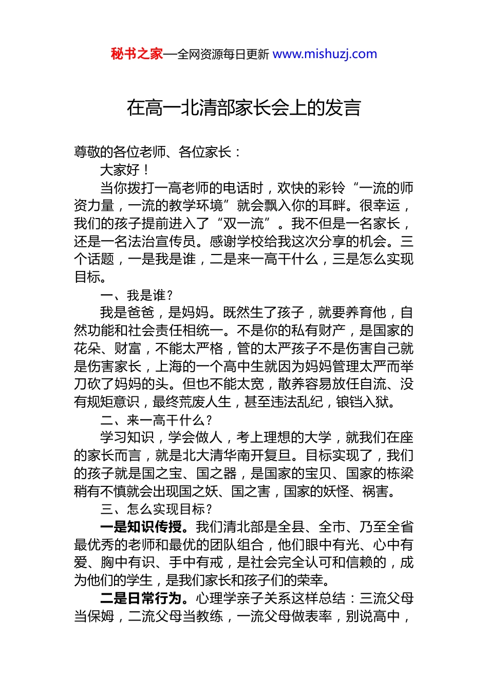 秘书之家—全网资源每日更新 www.mishuzj.com在高一北清部家长会上的发言尊敬的各位老师、各位家长:大家好!当你拨打一高老师的电话时,欢快的彩铃“一流的师资力量,一流的教学环境”就会飘入你的耳畔。很幸运,我们的孩子提前进入了“双一流”。我不但是一名家长,还是一名法治宣传员。感谢学校给我这次分享的机会。三个话题,一是我是谁,二是来一高干什么,三是怎么实现目标。一、我是谁?我是爸爸,是妈妈。既然生了孩子,就要养育他,自然功能和社会责任相统一。不是你的私有财产,是国家的花朵、财富,不能太严格,管的太严孩子不是伤害自己就是伤害家长,上海的一个高中生就因为妈妈管理太严而举刀砍了妈妈的头。但也不能太宽,散养容易放任自流、没有规矩意识,最终荒废人生,甚至违法乱纪,锒铛入狱。二、来一高干什么?学习知识,学会做人,考上理想的大学,就我们在座的家长而言,就是北大清华南开复旦。目标实现了,我们的孩子就是国之宝、国之器,是国家的宝贝、国家的栋梁稍有不慎就会出现国之妖、国之害,国家的妖怪、祸害。三、怎么实现目标?一是知识传授。我们清北部是全县、全市、乃至全省最优秀的老师和最优的团队组合,他们眼中有光、心中有爱、胸中有识、手中有戒,是社会完全认可和信赖的,成为他们的学生,是我们家长和孩子们的荣幸。二是日常行为。心理学亲子关系这样总结:三流父母当保姆,二流父母当教练,一流父母做表率,别说高中,秘书之家—全网资源每日更新 www.mishuzj.com就是初中小学,甚至幼儿园,事事包办,唠唠叨叨说教都会抑制孩子的成长思考,甚至反感、对抗。在家庭教育上孩子只是复印件,而父母是原件,想让孩子成长成什么样的人,父母就照什么样去做,潜移默化、润物无声。儿子幼儿园用“不但……而且……”造句,爸爸不但爱喝酒,而且回家晚。我自我调整,小学三级造句,爸爸不但爱读书而且爱跑步。父母好好学习,孩子天天向上。这里重点强调手机,我女儿读初一时,以学习交流理由要电脑,我深知电脑特别是游戏对青少年的危害。俺俩签订了附条件合同,我买电脑,期中考试成绩下降了怎么办?女儿高兴地回答“你说咋办就咋办”我的回答是“砸电脑”她稍微一愣“中”我观察她,有时查资料,更多的时间是聊天、玩游戏。我就是不吭气,等待期中考试,果然不出我所料,期中考试成绩公布,她拿着成绩单站在家门口不敢进屋,我说别哭啦,履行合同吧,你砸还是我砸她让我砸,噼里啪啦,电脑粉碎,装箱子。从此再不提电脑手机。发奋学习,成为 985 院校研究生。再说说我的儿子,我俩约定一是原则上时间不能超过15 分钟,且大都是在上学放学路上,写完作业后,甚至在蹲厕所中,当然节假日里或周末休息,我会给他说,你是先玩玩手机再写作业还是先学习再玩手机呢,一天就 24 个小时,你自己安排,爸爸相信你的选择,支持你的决策。二是我们约定每天晚上手机不准带进卧室,统一放到客厅里充电,家庭成员相互监督。三是找个理由,妈妈有点感冒,爸爸喝的有点多,爸爸想闻闻你的臭脚味,和他一起睡,不给他熬夜玩手机的机会,电信诈骗发案规律,每到周末休息,骗子就盯上学生们,用购买账户、送皮肤装备成为明星粉丝等方式,欺骗学生用家长的手机入群注册,加入会议室屏幕共享,或黑屏操控你的手机,转空你的银行卡。教大家两招,晚上十点后不让孩子玩手机,更不让孩秘书之家—全网资源每日更新 www.mishuzj.com子玩父母的手机,一旦出现黑屏,绝招是断电断网,扣卡无信号,阻断骗子转你的钱。还提醒家长,凡涉及校园的信息要确认来源和真实性,不要不分青红皂白就转发评论一旦你转发、编辑负面信息,网警监控,轻则批评教育封账号,重则追究行政刑事责任,进入公安机关黑名单,到时候你孩子报考著名高校、军校、警校都会因为你的黑名单被一票否决,不能让孩子倒在我们父母的手中。三是法律规则。教育部颁布的“中小学教育惩戒规则”,赋予了老师学校的教育惩戒权,列举了中小学生在校园内外的不良言行,具体为完不成教学任务的、不服从教育管理的、扰乱教学秩序的、吸烟饮酒或者言行失范的、夜不归宿的伤害自己或他人身心健康的、打骂欺凌...