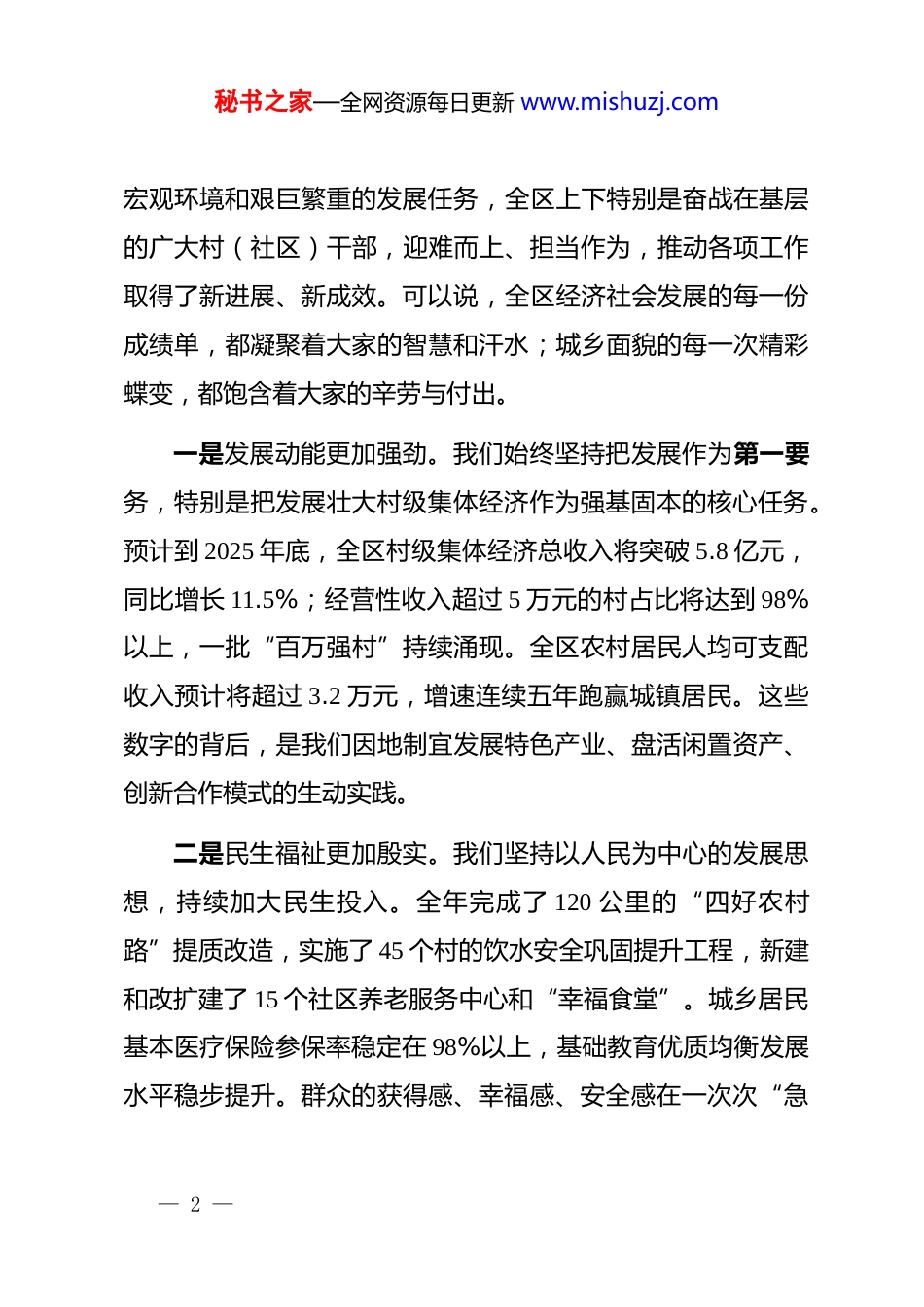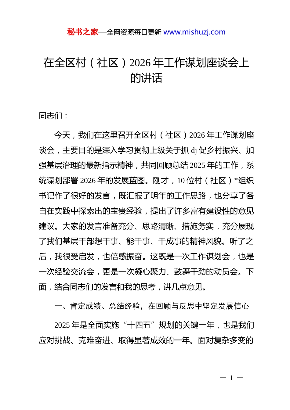 秘书之家—全网资源每日更新 www.mishuzj.com在全区村(社区)2026 年工作谋划座谈会上的讲话同志们:今天,我们在这里召开全区村(社区)2026 年工作谋划座谈会,主要目的是深入学习贯彻上级关于抓 dj 促乡村振兴、加强基层治理的最新指示精神,共同回顾总结 2025 年的工作,系统谋划部署 2026 年的发展蓝图。刚才,10 位村(社区)*组织书记作了很好的发言,既汇报了明年的工作思路,也分享了各自在实践中探索出的宝贵经验,提出了许多富有建设性的意见建议。大家的发言准备充分、思路清晰、措施务实,充分展现了我们基层干部想干事、能干事、干成事的精神风貌。听了之后,我很受启发,也倍感振奋。这既是一次工作谋划会,也是一次经验交流会,更是一次凝心聚力、鼓舞干劲的动员会。下面,结合同志们的发言和我的思考,讲几点意见。一、肯定成绩、总结经验,在回顾与反思中坚定发展信心2025 年是全面实施“十四五”规划的关键一年,也是我们应对挑战、克难奋进、取得显著成效的一年。面对复杂多变的— 1 —秘书之家—全网资源每日更新 www.mishuzj.com宏观环境和艰巨繁重的发展任务,全区上下特别是奋战在基层的广大村(社区)干部,迎难而上、担当作为,推动各项工作取得了新进展、新成效。可以说,全区经济社会发展的每一份成绩单,都凝聚着大家的智慧和汗水;城乡面貌的每一次精彩蝶变,都饱含着大家的辛劳与付出。一是发展动能更加强劲。我们始终坚持把发展作为第一要务,特别是把发展壮大村级集体经济作为强基固本的核心任务。预计到 2025 年底,全区村级集体经济总收入将突破 5.8 亿元,同比增长 11.5%;经营性收入超过 5 万元的村占比将达到 98%以上,一批“百万强村”持续涌现。全区农村居民人均可支配收入预计将超过 3.2 万元,增速连续五年跑赢城镇居民。这些数字的背后,是我们因地制宜发展特色产业、盘活闲置资产、创新合作模式的生动实践。二是民生福祉更加殷实。我们坚持以人民为中心的发展思想,持续加大民生投入。全年完成了 120 公里的“四好农村路”提质改造,实施了 45 个村的饮水安全巩固提升工程,新建和改扩建了 15 个社区养老服务中心和“幸福食堂”。城乡居民基本医疗保险参保率稳定在 98%以上,基础教育优质均衡发展水平稳步提升。群众的获得感、幸福感、安全感在一次次“急— 2 —秘书之家—全网资源每日更新 www.mishuzj.com难愁盼”问题的解决中得到实实在在的增强。三是治理效能更加彰显。我们持续深化 dj 引领下的基层治理创新。全面推行“网格化管理、精细化服务、信息化支撑”的治理模式,有效打通了服务群众的“最后一米”。深入开展“我为群众办实事”实践活动,累计化解各类矛盾纠纷 2100 余件,群众满意度持续攀升。平安社区、法治乡村建设迈上新台阶,社会大局保持和谐稳定。四是队伍建设更加有力。我们始终把建强基层战斗堡垒作为重中之重。通过实施“头雁领航”工程,对全区所有村(社区)*组织书记进行了一轮系统化培训。同时,我们注重在实践一线考察、识别和使用干部,一批想干事、敢担当的优秀年轻干部走上了村(社区)的重要岗位,为基层组织注入了新的生机与活力。成绩来之不易,经验弥足珍贵。这些成绩的取得,根本在于上级*委的坚强领导和科学决策,关键在于全区各级*组织和广大*员干部的团结拼搏,尤其离不开在座各位村(社区)书记的“领头雁”作用。你们是连接*委政府与人民群众的桥梁纽带,是各项方针政策在基层的最终落实者。在此,我代表区委,向辛勤工作在全区各个村、各个社区的同志们,表示衷心的感谢— 3 —秘书之家—全网资源每日更新 www.mishuzj.com和崇高的敬意!在肯定成绩的同时,我们也要清醒地认识到工作中存在的短板和不足。比如,村级集体经济发展不平衡的问题依然突出,部分村的“造血”功能仍然偏弱;一些社区的公共服务设施还不够完善,难以满足居民日益增长的多样化需求;个别基层干部的思想观念、能力水平还跟不上新时代新任务的要求,创新意识和攻坚能力有待加强。对于这些问题,我们必须高度重视,在 2026 年的工作中拿出切实可行的举措,认真加以解决。...