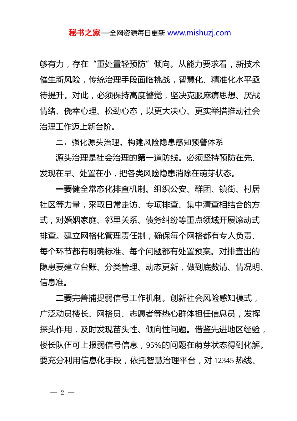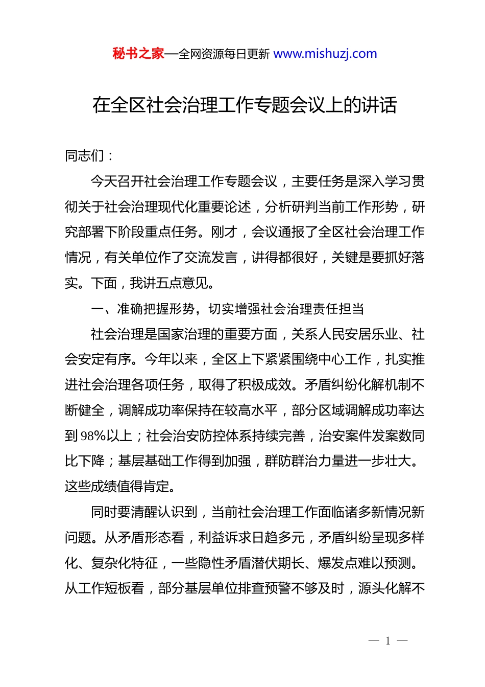 秘书之家—全网资源每日更新 www.mishuzj.com在全区社会治理工作专题会议上的讲话同志们:今天召开社会治理工作专题会议,主要任务是深入学习贯彻关于社会治理现代化重要论述,分析研判当前工作形势,研究部署下阶段重点任务。刚才,会议通报了全区社会治理工作情况,有关单位作了交流发言,讲得都很好,关键是要抓好落实。下面,我讲五点意见。一、准确把握形势,切实增强社会治理责任担当社会治理是国家治理的重要方面,关系人民安居乐业、社会安定有序。今年以来,全区上下紧紧围绕中心工作,扎实推进社会治理各项任务,取得了积极成效。矛盾纠纷化解机制不断健全,调解成功率保持在较高水平,部分区域调解成功率达到 98%以上;社会治安防控体系持续完善,治安案件发案数同比下降;基层基础工作得到加强,群防群治力量进一步壮大。这些成绩值得肯定。同时要清醒认识到,当前社会治理工作面临诸多新情况新问题。从矛盾形态看,利益诉求日趋多元,矛盾纠纷呈现多样化、复杂化特征,一些隐性矛盾潜伏期长、爆发点难以预测。从工作短板看,部分基层单位排查预警不够及时,源头化解不— 1 —秘书之家—全网资源每日更新 www.mishuzj.com够有力,存在“重处置轻预防”倾向。从能力要求看,新技术催生新风险,传统治理手段面临挑战,智慧化、精准化水平亟待提升。对此,必须保持高度警觉,坚决克服麻痹思想、厌战情绪、侥幸心理、松劲心态,以更大决心、更实举措推动社会治理工作迈上新台阶。二、强化源头治理,构建风险隐患感知预警体系源头治理是社会治理的第一道防线。必须坚持预防在先、发现在早、处置在小,把各类风险隐患消除在萌芽状态。一要健全常态化排查机制。组织公安、群团、镇街、村居社区等力量,采取日常走访、专项排查、集中清查相结合的方式,对婚姻家庭、邻里关系、债务纠纷等重点领域开展滚动式排查。建立网格化管理责任制,确保每个网格都有专人负责、每个环节都有明确标准、每个问题都有处置预案。对排查出的隐患要建立台账、分类管理、动态更新,做到底数清、情况明、信息准。二要完善捕捉弱信号工作机制。创新社会风险感知模式,广泛动员楼长、网格员、志愿者等热心群体担任信息员,发挥探头作用,及时发现苗头性、倾向性问题。借鉴先进地区经验,楼长队伍可上报弱信号信息,95%的问题在萌芽状态得到化解。要充分利用信息化手段,依托智慧治理平台,对 12345 热线、— 2 —秘书之家—全网资源每日更新 www.mishuzj.com网络舆情、群众来信来访等数据进行智能分析,精准识别潜在风险点。今年以来,部分地区通过该机制已预警民生诉求弱信号 445 条,解决 378 条;企业诉求弱信号 115 条,解决 110 条,成效显著。要建立弱信号快速响应机制,对收集到的信息第一时间核实、研判、处置,防止小苗头演变成大事件。三要强化重点群体服务管理。对刑满释放人员、社区矫正对象、吸毒人员、严重精神障碍患者等重点群体,要严格落实管控措施和帮扶政策。建立一人一档、一人一策,明确责任主体、管控措施、帮扶方案。对生活失意、心态失衡、行为失常人员及其家庭,要及时给予心理疏导、就业扶持、临时救助等帮扶,防止因服务管理不到位引发个人极端案事件。特别是对扬言报复社会、有暴力倾向的人员,要纳入视线、重点管控,坚决守住不发生恶性案事件的底线。三、优化化解机制,提升矛盾纠纷调处效能化解矛盾是社会治理的核心功能。必须坚持和发展新时代“枫桥经验”,完善多元化解机制,确保矛盾纠纷得到及时有效处理。一要发挥各级综治中心枢纽作用。健全统一受理、分办流转、依法办理、闭环管理的处置机制,实现群众解决问题只进一扇门、最多跑一地。要明确受理范围、规范工作流程、统一— 3 —秘书之家—全网资源每日更新 www.mishuzj.com服务标准,对群众诉求实行一站式接收、一揽子调处、全链条解决。加强部门协调联动,对跨领域、跨部门的复杂纠纷,由综治中心牵头组织联合调处,集中攻坚、限时化解。要建立督办反馈机制,对办理进展缓慢、群众不满意的案件,实行挂牌督办、跟踪问效。二要推进村社区综治中心建设。按照有阵地、有人员、有制度、有...