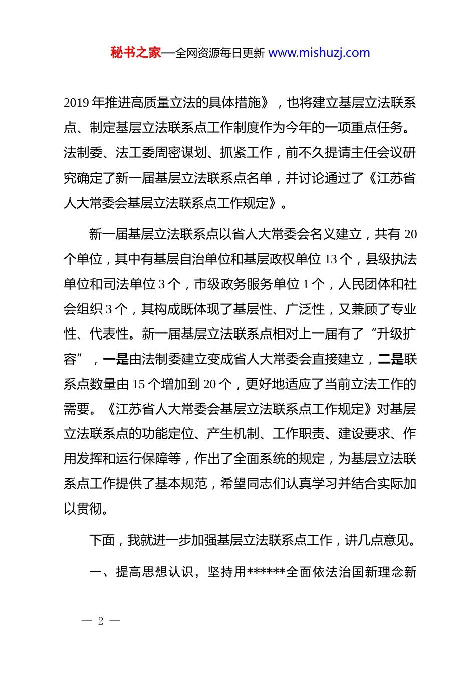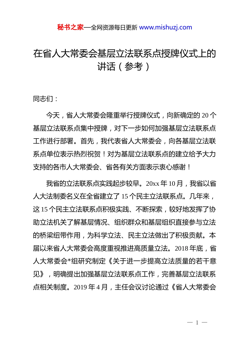 秘书之家—全网资源每日更新 www.mishuzj.com在省人大常委会基层立法联系点授牌仪式上的讲话(参考)同志们:今天,省人大常委会隆重举行授牌仪式,向新确定的 20 个基层立法联系点集中授牌,对下一步如何加强基层立法联系点工作进行部署。首先,我代表省人大常委会,向各基层立法联系点单位表示热烈祝贺!对为基层立法联系点的建立给予大力支持的各市人大常委会、省各有关方面表示衷心感谢!我省的立法联系点实践起步较早。20xx 年 10 月,我省以省人大法制委名义在全省建立了 15 个民主立法联系点。几年来,这 15 个民主立法联系点积极实践、不断探索,较好地发挥了协助立法机关了解基层情况、组织群众和基层组织直接参与立法的桥梁纽带作用,为科学立法、民主立法做出了积极贡献。本届以来省人大常委会高度重视推进高质量立法。2018 年底,省人大常委会*组研究制定《关于进一步提高立法质量的若干意见》,明确提出加强基层立法联系点工作,完善基层立法联系点相关制度。2019 年 4 月,主任会议讨论通过《省人大常委会— 1 —秘书之家—全网资源每日更新 www.mishuzj.com2019 年推进高质量立法的具体措施》,也将建立基层立法联系点、制定基层立法联系点工作制度作为今年的一项重点任务。法制委、法工委周密谋划、抓紧工作,前不久提请主任会议研究确定了新一届基层立法联系点名单,并讨论通过了《江苏省人大常委会基层立法联系点工作规定》。新一届基层立法联系点以省人大常委会名义建立,共有 20个单位,其中有基层自治单位和基层政权单位 13 个,县级执法单位和司法单位 3 个,市级政务服务单位 1 个,人民团体和社会组织 3 个,其构成既体现了基层性、广泛性,又兼顾了专业性、代表性。新一届基层立法联系点相对上一届有了“升级扩容”,一是由法制委建立变成省人大常委会直接建立,二是联系点数量由 15 个增加到 20 个,更好地适应了当前立法工作的需要。《江苏省人大常委会基层立法联系点工作规定》对基层立法联系点的功能定位、产生机制、工作职责、建设要求、作用发挥和运行保障等,作出了全面系统的规定,为基层立法联系点工作提供了基本规范,希望同志们认真学习并结合实际加以贯彻。下面,我就进一步加强基层立法联系点工作,讲几点意见。一、提高思想认识,坚持用******全面依法治国新理念新— 2 —秘书之家—全网资源每日更新 www.mishuzj.com思想新战略指导基层立法联系点工作*的十八大以来,以***同志为核心的*中央从关系*和国家长治久安的战略高度来定位法治、布局法治、厉行法治,把全面依法治国提到“四个全面”战略布局的新高度,推动法治中国建设发生了历史性、转折性、全局性变化,取得了重大理论创新、实践创新、制度创新成果。******就全面依法治国提出一系列新理念新思想新战略,明确了全面依法治国的指导思想、发展道路、工作布局、重点任务。******全面依法治国新理念新思想新战略是**************思想的重要组成部分,是新时代法治中国建设的行动指南。我们必须将******全面依法治国新理念新思想新战略作为地方立法以及基层立法联系点工作的根本遵循。一要深入学习贯彻******全面依法治国新理念新思想新战略。******在中央全面依法治国委员会第一次会议上,系统阐述了全面依法治国的新理念新思想新战略,其内容主要体现为“十个坚持”,其中一个坚持就是要全面推进科学立法。加强立法工作,提高立法质量和效率,是******全面依法治国新理念新思想新战略的重要内容。关于提高立法质量,******指出,人民群众对立法的期盼,已经不是有没有,而是好不好、管不— 3 —秘书之家—全网资源每日更新 www.mishuzj.com管用、能不能解决实际问题;不是什么法都能治国,不是什么法都能治好国;越是强调法治,越要提高立法质量。发展要高质量,立法也要高质量。要坚持问题导向,提高立法的针对性、及时性、系统性、可操作性,发挥立法引领和推动作用。要抓住提高立法质量这个关键,努力使每一项立法都符合宪法精神、反映人民意愿、得到人民拥护。关于如何提高立法质量,******指出,推进科学立法、民主立法,是提高立法质量...