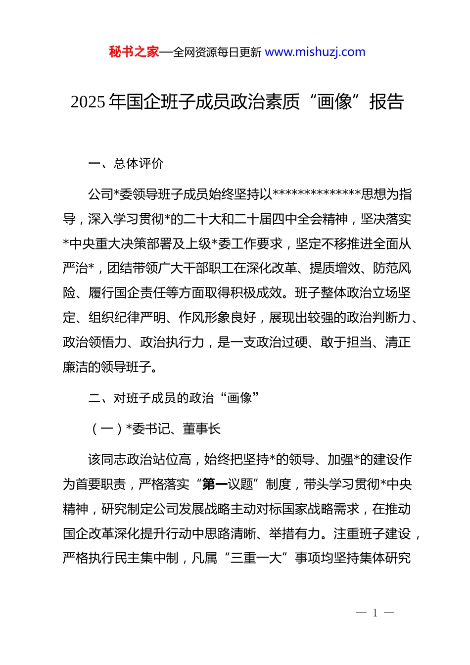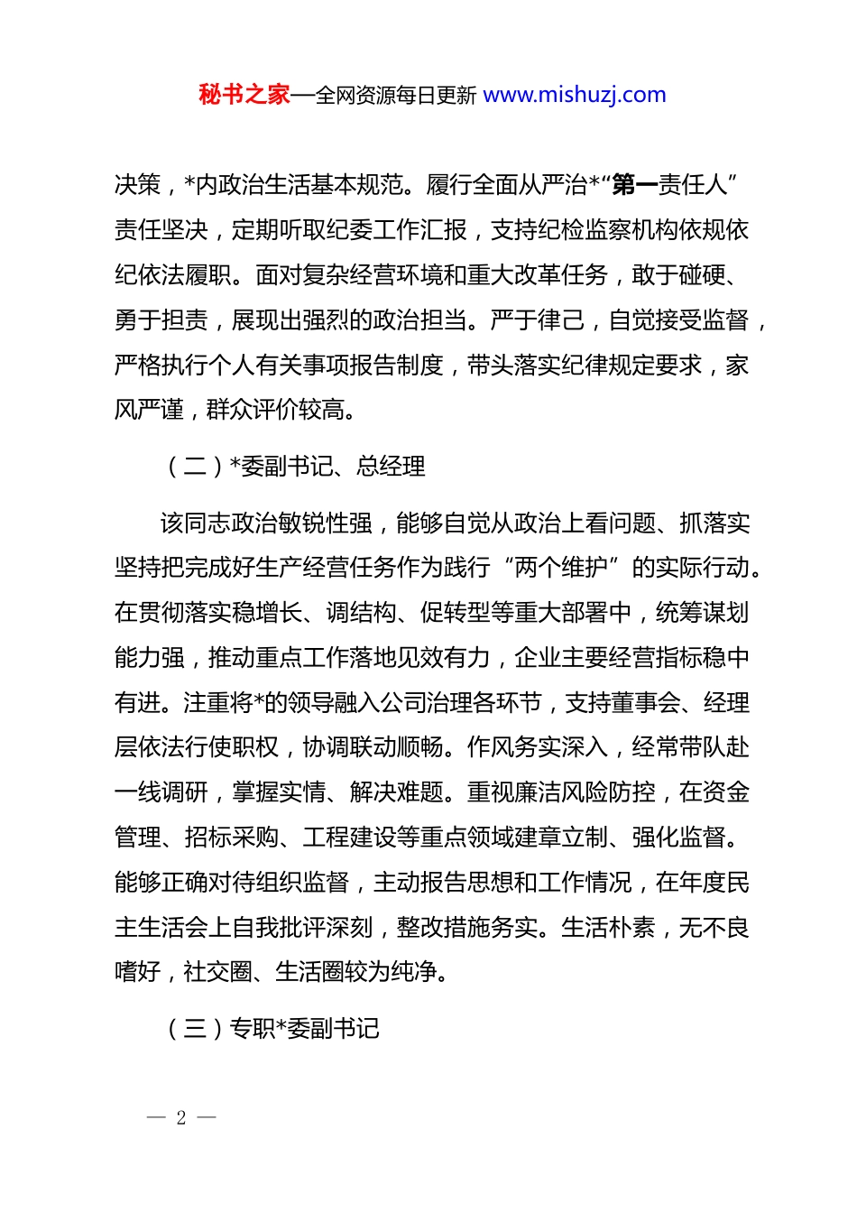 秘书之家—全网资源每日更新 www.mishuzj.com2025 年国企班子成员政治素质“画像”报告一、总体评价公司*委领导班子成员始终坚持以**************思想为指导,深入学习贯彻*的二十大和二十届四中全会精神,坚决落实*中央重大决策部署及上级*委工作要求,坚定不移推进全面从严治*,团结带领广大干部职工在深化改革、提质增效、防范风险、履行国企责任等方面取得积极成效。班子整体政治立场坚定、组织纪律严明、作风形象良好,展现出较强的政治判断力、政治领悟力、政治执行力,是一支政治过硬、敢于担当、清正廉洁的领导班子。二、对班子成员的政治“画像”(一)*委书记、董事长该同志政治站位高,始终把坚持*的领导、加强*的建设作为首要职责,严格落实“第一议题”制度,带头学习贯彻*中央精神,研究制定公司发展战略主动对标国家战略需求,在推动国企改革深化提升行动中思路清晰、举措有力。注重班子建设,严格执行民主集中制,凡属“三重一大”事项均坚持集体研究— 1 —秘书之家—全网资源每日更新 www.mishuzj.com决策,*内政治生活基本规范。履行全面从严治*“第一责任人”责任坚决,定期听取纪委工作汇报,支持纪检监察机构依规依纪依法履职。面对复杂经营环境和重大改革任务,敢于碰硬、勇于担责,展现出强烈的政治担当。严于律己,自觉接受监督,严格执行个人有关事项报告制度,带头落实纪律规定要求,家风严谨,群众评价较高。(二)*委副书记、总经理该同志政治敏锐性强,能够自觉从政治上看问题、抓落实坚持把完成好生产经营任务作为践行“两个维护”的实际行动。在贯彻落实稳增长、调结构、促转型等重大部署中,统筹谋划能力强,推动重点工作落地见效有力,企业主要经营指标稳中有进。注重将*的领导融入公司治理各环节,支持董事会、经理层依法行使职权,协调联动顺畅。作风务实深入,经常带队赴一线调研,掌握实情、解决难题。重视廉洁风险防控,在资金管理、招标采购、工程建设等重点领域建章立制、强化监督。能够正确对待组织监督,主动报告思想和工作情况,在年度民主生活会上自我批评深刻,整改措施务实。生活朴素,无不良嗜好,社交圈、生活圈较为纯净。(三)专职*委副书记— 2 —秘书之家—全网资源每日更新 www.mishuzj.com该同志政治信念坚定,长期从事*务工作,政策理论水平较高,善于从政治高度思考和推进 dj 工作。在组织推动*的创新理论武装、zt 教育开展、基层组织建设等方面发挥重要作用,dj 工作基础不断夯实。分管意识形态和宣传思想工作期间,阵地管理严格,舆论引导有力,未发生重大舆情风险。关心干部职工思想动态,注重人文关怀,推动解决基层实际困难,群众工作能力较强。在干部推荐使用中坚持原则、公道正派,严格执行选人用人制度规定。能够严格执行廉洁自律各项要求,在dj 活动经费使用、评优评先等工作中坚持公开透明,自觉抵制不正之风,体现了一名*务干部应有的政治品格。(四)纪委书记该同志政治立场坚定,忠诚履行监督专责,始终聚焦“两个维护”强化政治监督,紧盯*中央重大决策部署落实情况开展专项检查,发现问题及时纠偏。在协助*委推进全面从严治*、加强*风廉政建设和反腐败斗争中主动作为,组织开展廉洁教育、廉政谈话、警示教育常态化,营造了良好氛围。敢于较真碰硬,依规依纪依法查处违纪问题线索,严肃执纪问责。严守纪检监察权力边界,坚持实事求是原则,办案程序规范,证据扎实。自觉接受最严格的约束和监督,严格执行回避制度、**纪律,— 3 —秘书之家—全网资源每日更新 www.mishuzj.com从未利用职权谋取私利。注重提升队伍专业化水平,带头加强业务学习,推动纪检监察工作规范化法治化正规化建设。(五)副总经理(分管投资与规划)该同志政治意识较强,能够坚持从服务国家战略和企业发展大局出发谋划投资项目,在推动重大基础设施建设、新兴产业布局中积极作为,体现出较强的大局观念。在项目决策中注重合规性审查和风险评估,严格落实前置程序,未发生重大投资失误。执行纪律规定精神严格,出差调研轻车简从,无超标接待情况。在与外部合作单位交往中保持清醒头脑,坚持公私分明,未发现利益输送...