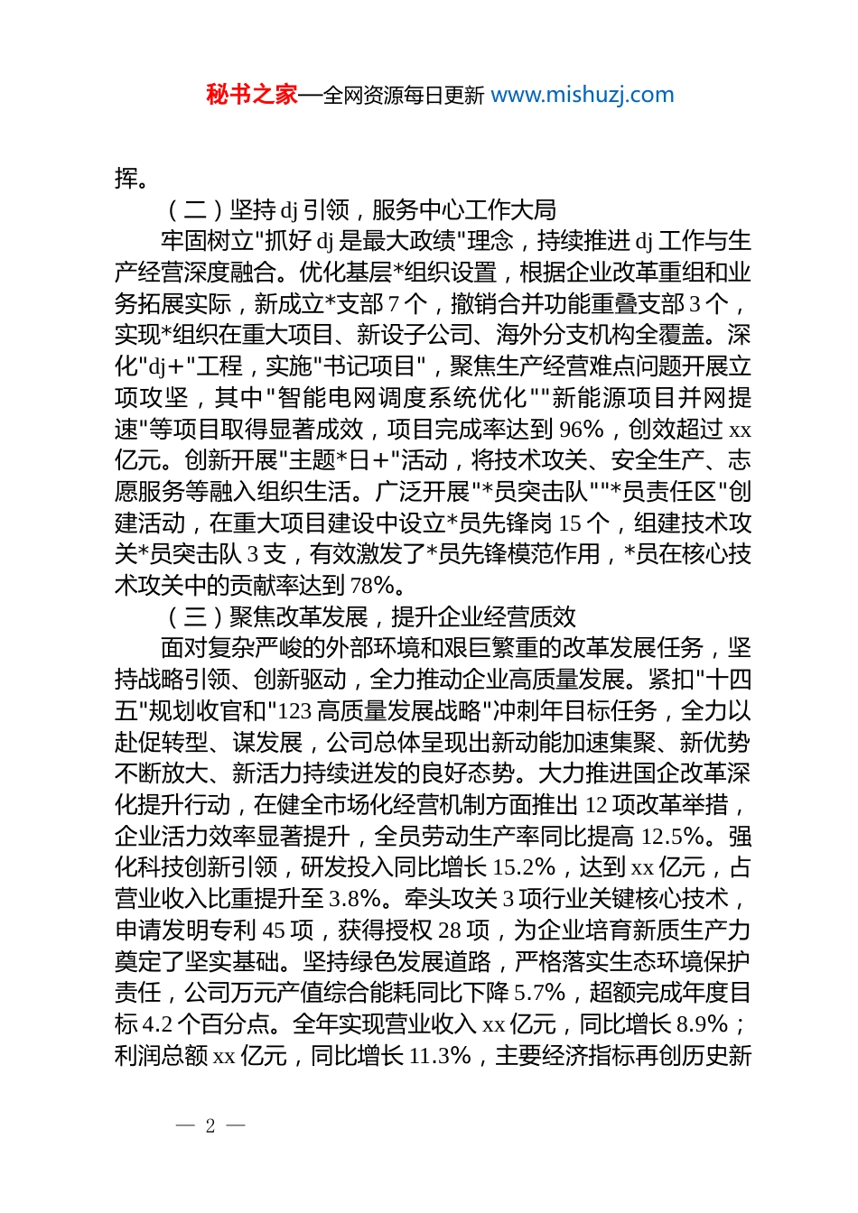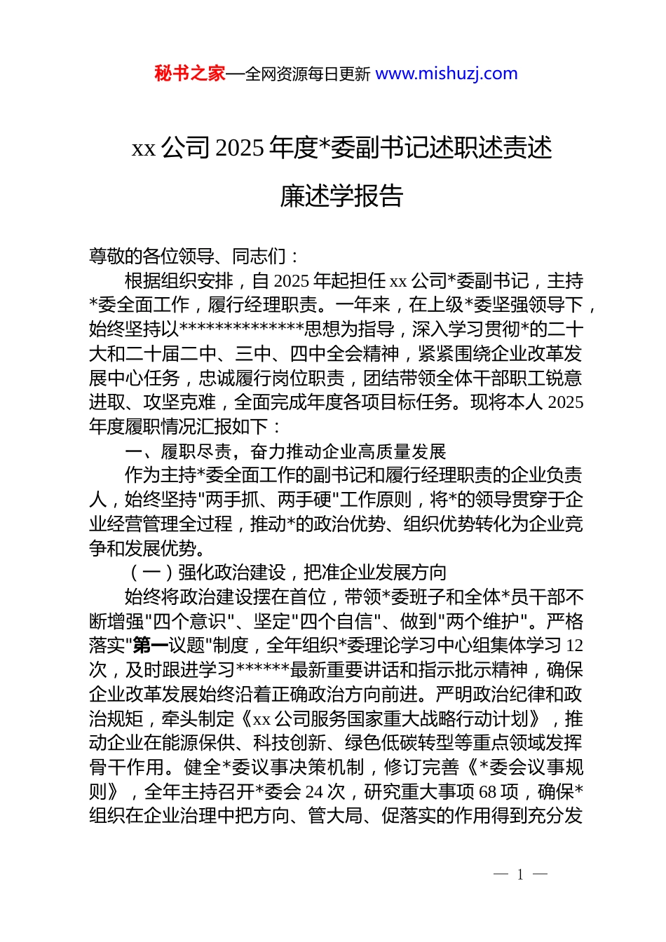 秘书之家—全网资源每日更新 www.mishuzj.comxx 公司 2025 年度*委副书记述职述责述廉述学报告尊敬的各位领导、同志们:根据组织安排,自 2025 年起担任 xx 公司*委副书记,主持*委全面工作,履行经理职责。一年来,在上级*委坚强领导下,始终坚持以**************思想为指导,深入学习贯彻*的二十大和二十届二中、三中、四中全会精神,紧紧围绕企业改革发展中心任务,忠诚履行岗位职责,团结带领全体干部职工锐意进取、攻坚克难,全面完成年度各项目标任务。现将本人 2025年度履职情况汇报如下:一、履职尽责,奋力推动企业高质量发展作为主持*委全面工作的副书记和履行经理职责的企业负责人,始终坚持"两手抓、两手硬"工作原则,将*的领导贯穿于企业经营管理全过程,推动*的政治优势、组织优势转化为企业竞争和发展优势。(一)强化政治建设,把准企业发展方向始终将政治建设摆在首位,带领*委班子和全体*员干部不断增强"四个意识"、坚定"四个自信"、做到"两个维护"。严格落实"第一议题"制度,全年组织*委理论学习中心组集体学习 12次,及时跟进学习******最新重要讲话和指示批示精神,确保企业改革发展始终沿着正确政治方向前进。严明政治纪律和政治规矩,牵头制定《xx 公司服务国家重大战略行动计划》,推动企业在能源保供、科技创新、绿色低碳转型等重点领域发挥骨干作用。健全*委议事决策机制,修订完善《*委会议事规则》,全年主持召开*委会 24 次,研究重大事项 68 项,确保*组织在企业治理中把方向、管大局、促落实的作用得到充分发— 1 —秘书之家—全网资源每日更新 www.mishuzj.com挥。(二)坚持 dj 引领,服务中心工作大局牢固树立"抓好 dj 是最大政绩"理念,持续推进 dj 工作与生产经营深度融合。优化基层*组织设置,根据企业改革重组和业务拓展实际,新成立*支部 7 个,撤销合并功能重叠支部 3 个,实现*组织在重大项目、新设子公司、海外分支机构全覆盖。深化"dj+"工程,实施"书记项目",聚焦生产经营难点问题开展立项攻坚,其中"智能电网调度系统优化""新能源项目并网提速"等项目取得显著成效,项目完成率达到 96%,创效超过 xx亿元。创新开展"主题*日+"活动,将技术攻关、安全生产、志愿服务等融入组织生活。广泛开展"*员突击队""*员责任区"创建活动,在重大项目建设中设立*员先锋岗 15 个,组建技术攻关*员突击队 3 支,有效激发了*员先锋模范作用,*员在核心技术攻关中的贡献率达到 78%。(三)聚焦改革发展,提升企业经营质效面对复杂严峻的外部环境和艰巨繁重的改革发展任务,坚持战略引领、创新驱动,全力推动企业高质量发展。紧扣"十四五"规划收官和"123 高质量发展战略"冲刺年目标任务,全力以赴促转型、谋发展,公司总体呈现出新动能加速集聚、新优势不断放大、新活力持续迸发的良好态势。大力推进国企改革深化提升行动,在健全市场化经营机制方面推出 12 项改革举措,企业活力效率显著提升,全员劳动生产率同比提高 12.5%。强化科技创新引领,研发投入同比增长 15.2%,达到 xx 亿元,占营业收入比重提升至 3.8%。牵头攻关 3 项行业关键核心技术,申请发明专利 45 项,获得授权 28 项,为企业培育新质生产力奠定了坚实基础。坚持绿色发展道路,严格落实生态环境保护责任,公司万元产值综合能耗同比下降 5.7%,超额完成年度目标 4.2 个百分点。全年实现营业收入 xx 亿元,同比增长 8.9%;利润总额 xx 亿元,同比增长 11.3%,主要经济指标再创历史新— 2 —秘书之家—全网资源每日更新 www.mishuzj.com高。(四)加强队伍建设,凝聚企业发展合力始终坚持*管干部、*管人才原则,着力打造一支政治过硬、作风优良、业务精湛的干部人才队伍。坚持新时代好干部标准,严把政治关、品行关、能力关、廉洁关,全年调整中层干部 35名,其中提拔使用优秀年轻干部 12 名,干部队伍平均年龄下降至 42.3 岁,结构进一步优化。加强人才储备培养,制定《xx 公司"十四五"人才发展规划》,全年组织各类培训班 20 期,参训人员达 500 余人次,培训满意度达到 95.6%。重点举办数字化转型、绿色低碳...