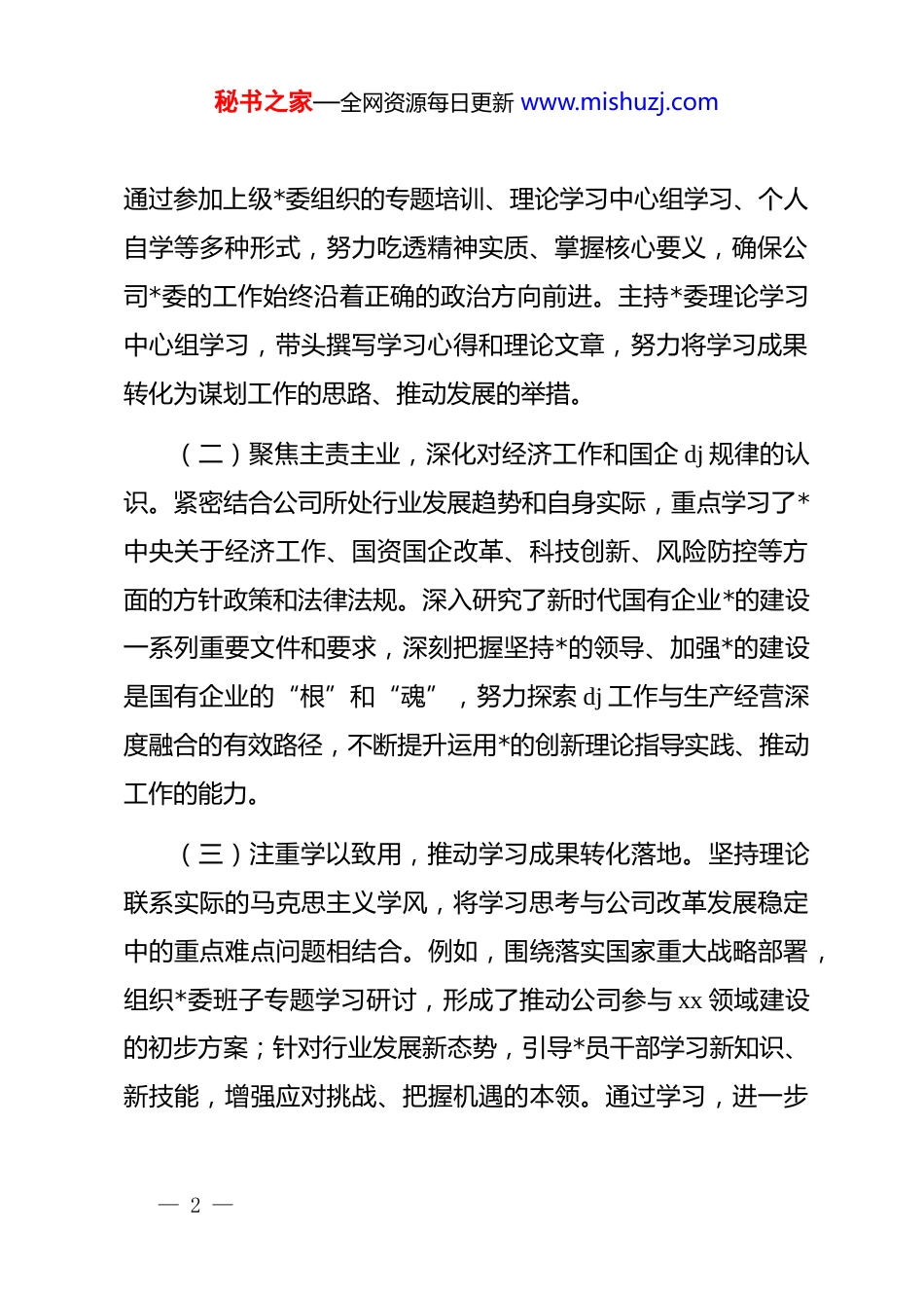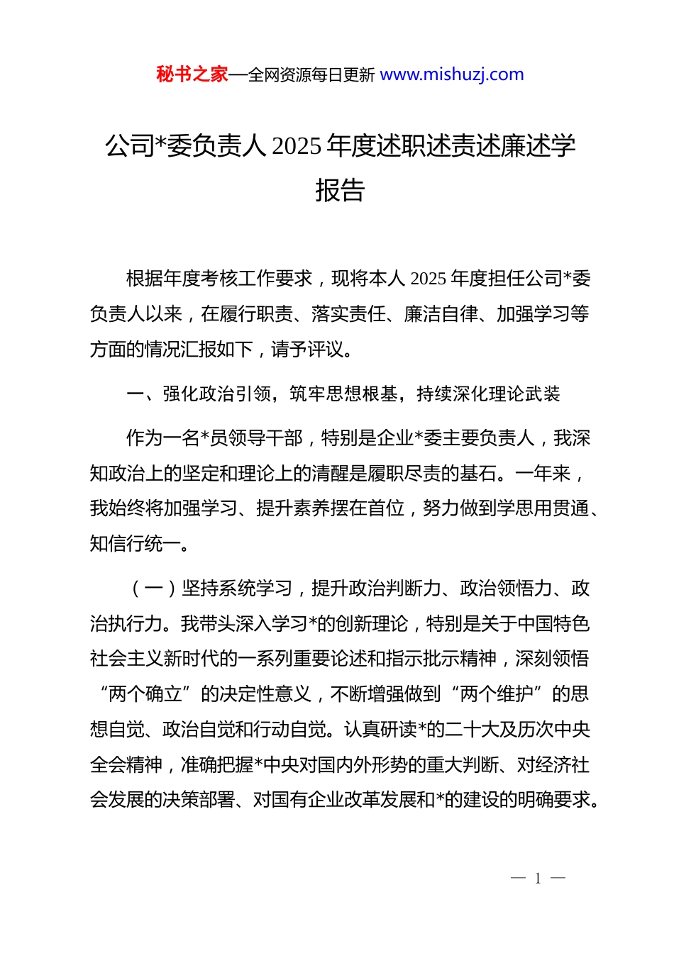 秘书之家—全网资源每日更新 www.mishuzj.com公司*委负责人 2025 年度述职述责述廉述学报告根据年度考核工作要求,现将本人 2025 年度担任公司*委负责人以来,在履行职责、落实责任、廉洁自律、加强学习等方面的情况汇报如下,请予评议。一、强化政治引领,筑牢思想根基,持续深化理论武装作为一名*员领导干部,特别是企业*委主要负责人,我深知政治上的坚定和理论上的清醒是履职尽责的基石。一年来,我始终将加强学习、提升素养摆在首位,努力做到学思用贯通、知信行统一。(一)坚持系统学习,提升政治判断力、政治领悟力、政治执行力。我带头深入学习*的创新理论,特别是关于中国特色社会主义新时代的一系列重要论述和指示批示精神,深刻领悟“两个确立”的决定性意义,不断增强做到“两个维护”的思想自觉、政治自觉和行动自觉。认真研读*的二十大及历次中央全会精神,准确把握*中央对国内外形势的重大判断、对经济社会发展的决策部署、对国有企业改革发展和*的建设的明确要求。— 1 —秘书之家—全网资源每日更新 www.mishuzj.com通过参加上级*委组织的专题培训、理论学习中心组学习、个人自学等多种形式,努力吃透精神实质、掌握核心要义,确保公司*委的工作始终沿着正确的政治方向前进。主持*委理论学习中心组学习,带头撰写学习心得和理论文章,努力将学习成果转化为谋划工作的思路、推动发展的举措。(二)聚焦主责主业,深化对经济工作和国企 dj 规律的认识。紧密结合公司所处行业发展趋势和自身实际,重点学习了*中央关于经济工作、国资国企改革、科技创新、风险防控等方面的方针政策和法律法规。深入研究了新时代国有企业*的建设一系列重要文件和要求,深刻把握坚持*的领导、加强*的建设是国有企业的“根”和“魂”,努力探索 dj 工作与生产经营深度融合的有效路径,不断提升运用*的创新理论指导实践、推动工作的能力。(三)注重学以致用,推动学习成果转化落地。坚持理论联系实际的马克思主义学风,将学习思考与公司改革发展稳定中的重点难点问题相结合。例如,围绕落实国家重大战略部署,组织*委班子专题学习研讨,形成了推动公司参与 xx 领域建设的初步方案;针对行业发展新态势,引导*员干部学习新知识、新技能,增强应对挑战、把握机遇的本领。通过学习,进一步— 2 —秘书之家—全网资源每日更新 www.mishuzj.com明晰了公司的发展战略和 dj 工作的着力点,有效提升了战略谋划和科学决策水平。二、聚焦主责主业,全力推动公司*的建设和高质量发展作为公司*委负责人,我坚决扛起管*治*、治企兴企的政治责任,坚持把方向、管大局、促落实,团结带领*委一班人和全体干部职工,奋力完成年度各项目标任务。(一)充分发挥*委领导作用,把好企业发展方向。始终坚持*对国有企业的全面领导,严格执行“第一议题”制度,及时传达学习*中央最新精神和上级*委决策部署,确保在公司不折不扣落实。主持召开*委会议,研究审议重大事项,包括公司发展战略、重大投资、重要改革、人事任免等,均严格履行前置研究讨论程序,确保*委意图在重大问题决策中得到体现。不断完善*委议事规则和决策机制,推动*的领导融入公司治理各环节,实现制度化、规范化、程序化。(二)持续加强*的组织建设,夯实基层战斗堡垒。牢固树立大抓基层的鲜明导向,以提升组织力为重点,突出政治功能。一是优化组织设置,根据业务调整和项目拓展,及时新建、调整基层*支部 xx 个,确保*的组织和工作全覆盖。二是建强骨干— 3 —秘书之家—全网资源每日更新 www.mishuzj.com队伍,严格按照标准发展*员 xx 名,加强*支部书记和*务干部培训,提升履职能力。严格落实“三会一课”、组织生活会、民主评议*员等制度,增强*内政治生活的政治性、时代性、原则性、战斗性。三是深化 dj 品牌创建,围绕生产经营难点、重点任务,组织开展“*员突击队”、“*员责任区”、“*员示范岗”等活动,有效激发了基层*组织和*员的活力。例如,在 xx重点项目攻坚中,临时*支部发挥了关键作用,保障了任务顺利完成。(三)着力锻造高素质专业化干部人才队伍。坚持*管干部原则,树立正确选人用人导向...